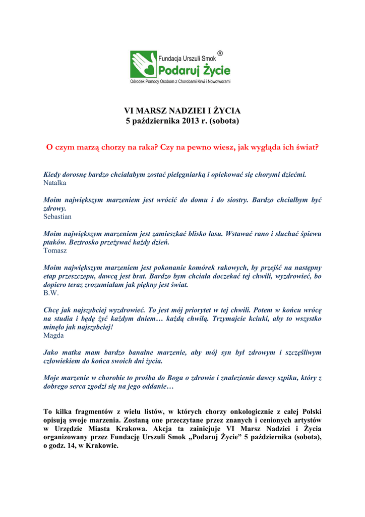 VI MARSZ NADZIEI I ŻYCIA 5 października 2013 r. (sobota) O czym marzą chorzy na raka? Czy na pewno wiesz, jak wygląda ich świat? Kiedy dorosnę bardzo chciałabym zostać pielęgniarką i opiekować się chorymi dziećmi. Natalka Moim największym marzeniem jest wrócić do domu i do siostry. Bardzo chciałbym być zdrowy. Sebastian Moim największym marzeniem jest zamieszkać blisko lasu. Wstawać rano i słuchać śpiewu ptaków. Beztrosko przeżywać każdy dzień. Tomasz Moim największym marzeniem jest pokonanie komórek rakowych, by przejść na następny etap przeszczepu, dawcą jest brat. Bardzo bym chciała doczekać tej chwili, wyzdrowieć, bo dopiero teraz zrozumiałam jak piękny jest świat. B.W. Chcę jak najszybciej wyzdrowieć. To jest mój priorytet w tej chwili. Potem w końcu wrócę na studia i będę żyć każdym dniem… każdą chwilą. Trzymajcie kciuki, aby to wszystko minęło jak najszybciej! Magda Jako matka mam bardzo banalne marzenie, aby mój syn był zdrowym i szczęśliwym człowiekiem do końca swoich dni życia. Moje marzenie w chorobie to prośba do Boga o zdrowie i znalezienie dawcy szpiku, który z dobrego serca zgodzi się na jego oddanie… To kilka fragmentów z wielu listów, w których chorzy onkologicznie z całej Polski opisują swoje marzenia. Zostaną one przeczytane przez znanych i cenionych artystów w Urzędzie Miasta Krakowa. Akcja ta zainicjuje VI Marsz Nadziei i Życia organizowany przez Fundację Urszuli Smok „Podaruj Życie” 5 października (sobota), o godz. 14, w Krakowie. Celem Marszu jest nagłośnienie idei dawstwa szpiku kostnego oraz przybliżenie społeczeństwu sytuacji osób chorujących onkologicznie. Oficjalna część Marszu odbędzie się w Magistracie Krakowskim. Artyści: Maja Ostaszewska, Urszula Grabowska, Małgorzata Kalicińska, Tadeusz Huk i Błażej Peszek przeczytają listy napisane przez osoby chore na białaczkę lub inne nowotwory. Listy zawierają nie tylko ich doświadczenia związane z chorobą, ale przede wszystkim marzenia, postanowienia i plany na przyszłość. Po oficjalnej części odbędzie się Marsz na trasie: Magistrat - ul. Grodzka - Rynek Główny - Wieża Ratuszowa. Uczestnikami będą mieszkańcy Krakowa, zaproszeni Goście, przedstawiciele krakowskich władz oraz wolontariusze. Każda z osób zostanie obdarowana listem przymocowanym do zielonych balonów. VI Marsz Nadziei i Życia zostanie owacyjnie zakończony pod Wieżą Ratuszową akcją „Uwolnić marzenia” czyli wysłaniem zielonych balonów z listami osób chorych. W czasie trwania części oficjalnej na Rynku Głównym – przy Wieży Ratuszowej – będą odbywać się występy artystyczne dzieci i młodzieży ze Szkoły Podstawowej nr 98, Międzyszkolnego Ludowego Zespołu Pieśni i Tańca „Krakowiak” oraz Młodzieżowego Domu Kultury – Grunwaldzka 5. Przez cały czas trwania imprezy (przy Wieży Ratuszowej) zostanie udostępniony punkt informacyjny, w którym będzie można dowiedzieć się więcej na temat dawstwa szpiku kostnego - m.in. kto może zostać dawcą szpiku?, jak zostać dawcą? jak pobiera się szpik kostny? Każda osoba zainteresowana będzie miała możliwość napisania swojego własnego listu – zawierającego słowa otuchy i wsparcia dla chorych lub swoje własne marzenia. Listy te zostaną wysłane do nieba wraz z pozostałymi. W okolicach sceny zostanie zaprezentowana wystawa fotograficzna autorstwa Agaty Dyki. Jest to pogodna i magiczna ekspozycja, przedstawiająca chorych w ich codziennych zmaganiach, pokazująca ich radość i optymizm. Wystawa będzie również prezentować oryginalne listy chorych nadesłane do Fundacji. Patronat Honorowy: Metropolita Krakowski - Ks. Kardynał Stanisław Dziwisz oraz Prezydent Miasta Krakowa - prof. Jacek Majchrowski. Patronat Medialny: TVP Kraków, Radio Plus, Dziennik Polski, Nasze Miasto, Tygodnik „Przegląd”, Gość Niedzielny, Wrota Małopolski, www.krakow.pl., kampaniespoleczne.pl Główny Partner : Tauron Polska Energia SA Współorganizator: Biuro ds. Ochrony Zdrowia UMK Partnerzy: Fundacja Bre Banku, Farmona, Agencja Promocyjna „Swobodny Przepływ Myśli”, Galeria Kazimierz, Teatr Ludowy, Międzyszkolny Zespół Pieśni i Tańca „Krakowiak”, Nowoorleański JazzBand, Filmotechnika, Creative Group 303, Hotel Royal, XII LO, Zespół Szkół Gastronomicznych nr 1, Zespół Szkół Specjalnych nr 3 Szpitala Uniwersyteckiego, Zespół Szkół Zawodowych HTS, Młodzieżowy Dom Kultury Grunwaldzka 5, Szkoła Podstawowa nr 98 Osoby prowadzące: Jolanta Gibas, Mariusz Kuś PROGRAM MARSZU 5 października (sobota), godz. 14.00 Urząd Miasta Krakowa (Sala Portretowa), Plac Wszystkich Św. 3-4 Czytanie listów z marzeniami chorych onkologicznie przez: Urszulę Grabowską, Małgorzatę Kalicińską, Maję Ostaszewską, Tadeusza Huka, Błażeja Peszka godz. 13.30-15.30 Rynek Główny - scena pod Wieżą Ratuszową Występy artystyczne dzieci i młodzieży ze Szkoły Podstawowej nr 98, Międzyszkolnego Ludowego Zespołu Pieśni i Tańca "Krakowiak", Młodzieżowego Domu Kultury - Grunwaldzka 5, wystawa fotograficzna Agaty Dyki godz. 15.00 Marsz na trasie: UMK - ul. Grodzka - Rynek Główny, Wieża Ratuszowa Na trasie przemarszu wystąpią: Międzyszkolny Ludowy Zespół Pieśni i Tańca "Krakowiak", Nowoorleański JazzBand ok. godz. 15.30 Wysłanie marzeń do nieba przyczepionych do zielonych balonów przez uczestników Marszu Rynek Główny pod Wieżą Ratuszową Wszystkich chętnych zapraszamy serdecznie do uczestnictwa w Marszu oraz prosimy o ubranie (zabranie ze sobą) czegoś w kolorze zielonym – kolorze nadziei. KILKA SŁÓW O FUNDACJI Założycielką Fundacji „Podaruj Życie” jest Urszula Smok, która chorowała na białaczkę i przeszła pomyślnie przeszczep szpiku kostnego. Celem działalności Fundacji jest niesienie pomocy osobom z chorobami krwi i nowotworami, osobom po przeszczepie szpiku, popularyzowanie idei dawstwa szpiku oraz