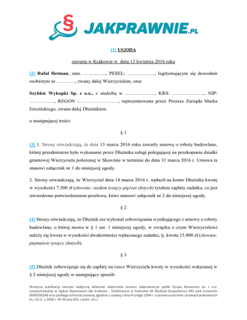[1] UGODA zawarta w Krakowie w dniu 13 kwietnia 2016 roku [2] Rafał Hetman, zam. ………….., PESEL: …………….., legitymującym się dowodem osobistym nr…………, zwany dalej Wierzycielem, oraz Szybkie Wykopki Sp. z o.o., z siedzibą w ………………, KRS: ……………….., NIP: ……………, REGON :……………………, reprezentowana przez Prezesa Zarządu Marka Erecińskiego, zwana dalej Dłużnikiem o następującej treści: §1 [3] 1. Strony oświadczają, że dnia 13 marca 2016 roku zawarły umowę o roboty budowlane, której przedmiotem było wykonanie przez Dłużnika usługi polegającej na przekopaniu działki gruntowej Wierzyciela położonej w Skawinie w terminie do dnia 31 marca 2016 r. Umowa ta stanowi załącznik nr 1 do niniejszej ugody. 2. Strony oświadczają, że Wierzyciel dnia 14 marca 2016 r. wpłacił na konto Dłużnika kwotę w wysokości 7.500 zł (słownie: siedem tysięcy pięćset złotych) tytułem zapłaty zadatku, co jest stwierdzone potwierdzeniem przelewu, które stanowi załącznik nr 2 do niniejszej ugody. §2 [4] Strony oświadczają, że Dłużnik nie wykonał zobowiązania wynikającego z umowy o roboty budowlane, o której mowa w § 1 ust. 1 niniejszej ugody, w związku z czym Wierzycielowi należy się kwota w wysokości dwukrotności wpłaconego zadatku, tj. kwota 15.000 zł (słownie: piętnaście tysięcy złotych). §3 [5] Dłużnik zobowiązuje się do zapłaty na rzecz Wierzyciela kwoty w wysokości wskazanej w § 2 niniejszej ugody w następujący sposób: Niniejsza publikacja stanowi wyłączną własność właściciela serwisu Jakprawnie.pl spółki Grupa Konsensus sp. z o.o. zarejestrowanej w Sądzie Rejonowym dla Krakowa - Śródmieścia w Krakowie XII Wydział Gospodarczy KRS pod numerem 0000506348 oraz podlega ochronie prawnej zgodnie z ustawą z dnia 4 lutego 1994 r. o prawie autorskim i prawach pokrewnych (t.j. Dz.U. z 2006 r. Nr 90 poz.631 z późn. zm.). 1) kwota 7.000 zł zostanie zwrócona Wierzycielowi do dnia 30 kwietnia 2016 roku; 2) kwota 3.000 zł zostanie zwrócona Wierzycielowi do dnia 30 maja 2016 roku; 3) kwota 5.000 zł zostanie zwrócona Wierzycielowi do dnia 30 czerwca 2016 roku. §4 [6] 1. Dłużnik zobowiązuje się do dnia 20 kwietnia 2016 r. przedstawić Wierzycielowi odpis aktu notarialnego, o którym mowa w art. 777 § 1 pkt 4 Kodeksu postępowania cywilnego, w którym podda się dobrowolnie egzekucji do kwoty 15.000 zł. 2. W razie braku przedłożenia odpisu aktu notarialnego w terminie, o którym mowa w ustępie poprzedzającym, niniejsza ugoda przestaje wiązać strony. §5 [7] W razie opóźnienia płatności którejkolwiek z rat wskazanych w § 3 niniejszej ugody kwota określona w § 2 niniejszej ugody staje się natychmiast wymagalna. §6 1. Niniejsza ugoda została sporządzona w dwóch egzemplarzach po jednym dla każdej ze stron. [8] 2. W razie sporu dotyczącego wykonania niniejszej umowy sądem właściwym miejscowo do rozpatrzenia sporu będzie sąd miejsca zamieszkania Wierzyciela . _________________________ ____________________________ Wierzyciel Dłużnik Załączniki: 1. Umowa o roboty budowlane z dnia 13 marca 2016 r. 2. Potwierdzenie przelewu. Niniejsza publikacja stanowi wyłączną własność właściciela serwisu Jakprawnie.pl spółki Grupa Konsensus sp. z o.o. zarejestrowanej w Sądzie Rejonowym dla Krakowa - Śródmieścia w Krakowie XII Wydział Gospodarczy KRS pod numerem 0000506348 oraz podlega ochronie prawnej zgodnie z ustawą z dnia 4 lutego 1994 r. o prawie autorskim i prawach pokrewnych (t.j. Dz.U. z 2006 r. Nr 90 poz.631 z późn. zm.). Objaśnienia: [1] Ugoda jest umową nazwaną prawa cywilnego określoną w art. 917 k.c., na mocy której Strony zobowiązują się do polubownego rozwiązania sporu w oznaczony w ugodzie sposób lub której celem jest zawarcie porozumienia, w którym strony zrzekają się wzajemnie z roszczeń wobec siebie – w całości lub części. [2] W tym miejscu trzeba oznaczyć strony umowy. Obowiązkowo trzeba podać imię i nazwisko/nazwę, adres i miejsce zamieszkania/siedziby (ewentualnie adres do korespondencji) oraz numer PESEL/KRS. Dodatkowo można dodać inne numery identyfikacyjne, np. REGON czy NIP. W oznaczeniach stron istotne jest, aby zawrzeć dane umożliwiające ich identyfikację dla ułatwienia ewentualnego późniejszego dochodzenia roszczeń przed sądem. W niniejszym wzorze Wierzyciel to osoba fizyczna nieprowadząca działalności gospodarczej, dla której warto podać numer PESEL, a Dłużnik to sp. z o.o. posiadająca numer KRS, NIP i REGON. [3]-[4] W tych punktach należy dokładnie wskazać, co jest przedmiotem sporu lub wzajemnych roszczeń i z jakich zdarzeń czy podstaw prawnych one wynikają. W tym miejscu można też zawrzeć wszelkie oświadczenia i informacje dotyczące zdarzeń przeszłych, które spowodowały spór lub go opisują. W niniejszym stanie faktycznym jest to roszczenie Wierzyciela o zwrot kwoty 15.000 zł od Dłużnika z tytułu dwukrotności zadatku, połączone z opisem zdarzenia. W braku odmiennego zastrzeżenia umownego albo zwyczaju zadatek dany przy zawarciu umowy ma to znaczenie, że w razie niewykonania umowy przez jedną ze stron druga strona może bez wyznaczenia terminu dodatkowego od umowy odstąpić i otrzymany zadatek zachować, a jeżeli sama go dała, może żądać sumy dwukrotnie wyższej (art. 394 § 1 k.c.). [5] W tym miejscu znajduje się najważniejszy element ugody, czyli określenie sposobu realizacji roszczeń. W niniejszym przykładzie Strony ustaliły, że ze względu na ciężką sytuację Dłużnika, będzie on zwracał dług ratami, w sposób opisany w ugodzie, tj. w trzech ratach. [6] Zapis, że Dłużnik podda się egzekucji poprzez sporządzenie odpowiedniego aktu notarialnego – na wypadek niewykonania ugody jest zabezpieczeniem dla Wierzyciela. Wskazany przepis prawa ma ten skutek, że Wierzyciel uzyska tytuł egzekucyjny w postaci aktu no