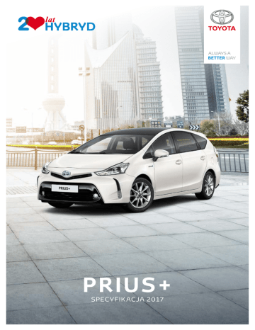 PRIUS+ SPECYFIK ACJA 2017 CENY BRUTTO (PLN) Cennik obowiązuje od 21 grudnia 2016 r. 7 MPV 1,8 Hybrid (136 KM) E-CVT hybryda Lakier metalik 2 300 Lakier biały perłowy Active Premium Prestige 136 900 145 900 164 900 3 200 Nawigacja Toyota Touch 2 with Go (wersje Active i Premium) Dla Ciebie 2 532 zł/mc 2 366 zł/mc od • * Wysokość wpłaty własnej. od 2 500 Dla Twojej firmy 10%* 30%* NAJCZĘŚCIEJ WYBIERANA WERSJA: 7 MPV 1,8 Hybrid (136 KM) E-CVT hybryda Premium zł/mc 1 879 netto 1 190 netto zł/mc od 10%* od 30%* • Zapytaj w salonie o specjalną ofertę 1. Średnie spalanie w mieście wynosi zaledwie 3,8 l/100 km. 2. Wyjątkowy komfort: możliwość podróżowania aż 7 osób w niezwykle wygodnych warunkach. 3. Bogate wyposażenie, m.in.: światła w technologii LED, system multimedialny Toyota Touch 2 z kamerą cofania oraz 17" felgi aluminiowe. Systemy multimedialne Toyota Touch 2 Toyota Touch 2 • • • • • • 1 Toyota Touch 2 with Go Elementy dodatkowe względem Toyota Touch 2: • nawigacja satelitarna z mapami Europy Centralnej i Zachodniej • darmowa aktualizacja map przez 3 lata • darmowy dostęp do usługi TomTom Real Time Traffic przez 3 lata • aplikacje multimedialne, m.in: Pogoda, Paliwo, Parking, Google Street View • komunikaty drogowe TMC dotykowy wyświetlacz 6,1" z obsługą w języku polskim radio, złącza USB i Aux-In, obsługa plików MP3, WMA zestaw głośnomówiący Bluetooth 3.0 z funkcją wyświetlania SMS-ów1 kamera cofania Bluetooth audio: możliwość słuchania muzyki z telefonu1 integracja z odtwarzaczem iPod1 Elementy dodatkowe względem Toyota Touch 2 with Go dostępne dla wersji Prestige: • trójwymiarowe mapy • możliwość połączenia systemu z Internetem za pośrednictwem sieci Wi-Fi • rozpoznawanie komend głosowych Lista kompatybilnych modeli telefonów dostępna w stacjach dilerskich. Wyposażenie dodatkowe Pakiet Protection Wykładzina bagażnika 1 050 PLN Listwy ochronne zderzaków Aluminiowe nakładki progowe z niebieskim logo HYBRID Pakiety dodatkowe 5 000 PLN PAKIET SKYVIEW – Dach panoramiczny wykonany z żywicy z funkcją automatycznego zamykania rolety Dostępny w wersji Premium. Opcje Active Premium 2 500 PLN 2 500 PLN Opcja Opcja Opcja Elektroniczny system zabezpieczenia antykradzieżowego komputera i złącza diagnostycznego2 990 PLN 0 PLN 990 PLN 0 PLN 990 PLN 0 PLN Rozszerzenie zabezpieczenia pojazdu o elektroniczny system antykradzieżowy: ochrony wnętrza, dźwiękowej sygnalizacji włamania oraz identyfikację kierowcy poprzez kartę PROXY w przypadku kradzieży kluczyków samochodu3 880 PLN 880 PLN 880 PLN Nawigacja Toyota Touch 2 with Go Dodatkowa rozszerzona gwarancja do 10 lat na akumulator hybrydowy 1 2 3 1 Gwarancja tylko w przypadku wykonywania regularnych testów akumulatora w Autoryzowanej Stacji Dilerskiej Toyoty. Szczegóły u Sprzedawcy. Bezobsługowy system renomowanej firmy Cobra AT, światowego lidera w branży samochodowych zabezpieczeń elektronicznych. Klasa skuteczności PIMOT: profesjonalna. Koszt brutto z montażem w ASD. Prestige WYPOSAŻENIE Bezpieczeństwo Active Premium Prestige 7 poduszek powietrznych ABS + EBD + BA VSC+ (system stabilizacji pojazdu) E-TRC (elektroniczna kontrola trakcji) HAC (system wspomagający pokonywanie podjazdów) Przednie światła przeciwmgielne Światła do jazdy dziennej typu LED Światła mijania i drogowe typu LED Wewnętrzne lusterko elektrochromatyczne – Czujnik deszczu – Czujnik zmierzchu (automatyczne światła) – Zestaw naprawczy System ochrony przedzderzeniowej (PCS) Wygląd zewnętrzny – – Active Premium Prestige – – Felgi aluminiowe 16" (opony 205/60 R16) Felgi aluminiowe 17" (opony 215/50 R17) – Przyciemniana szyba tylna i tylne boczne – Dach panoramiczny wykonany z żywicy z funkcją automatycznego zamykania rolety – Skyview Active Premium – – Komfort Prestige Tempomat Aktywny tempomat Składane i podgrzewane lusterka z kierunkowskazami Klimatyzacja automatyczna Składany trzeci rząd siedzeń (7 miejsc) System „Inteligentny kluczyk” (otwieranie i uruchamianie bez użycia kluczyka drzwi kierowcy/pasażera/klapy bagażnika) /–/– Skórzana kierownica z przyciskami do obsługi klimatyzacji, telefonu i systemu audio Skórzana kierownica z przyciskami do obsługi klimatyzacji, telefonu i wyświetlacza wielofunkcyjnego – Wyświetlacz projekcyjny HUD na przedniej szybie, wyświetlający informacje o prędkości i trybie jazdy/o manewrach podczas jazdy z włączoną nawigacją – Touch Tracer – wyświetlacz pomocniczy przycisków na kierownicy – Inteligentny system parkowania (IPA) – Centralny kolorowy wyświetlacz ciekłokrystaliczny 4,2" – Kamera cofania – / / / / – – /– / – Podświetlenie przestrzeni na nogi kierowcy i pasażera Siedzenia materiałowe – Siedzenia materiałowe ze skórzanymi boczkami – Siedzenia skórzane – Podgrzewane siedzenia – – – – Kieszenie w oparciach foteli kierowcy i pasażera Elektryczna regulacja podparcia lędźwiowego oraz manualna wysokości fotela kierowcy Elektryczna regulacja fotela kierowcy (8 ustawień) i manualna regulacja fotela pasażera (4 ustawienia) – Rolety przeciwsłoneczne w tylnych drzwiach – – Roleta przestrzeni bagażowej Schowek na okulary Audio Active Premium – – System multimedialny Toyota Touch 2 (6 głośników) z ekranem dotykowym 6,1" System audio JBL z 2 dodatkowymi głośnikami Gniazda USB i Aux-In Prestige DANE TECHNICZNE Zużycie paliwa (UE 715/2007 z późn. zm. i aktami wykonawczymi) 1,8 Hybrid (136 KM) E-CVT hybryda Miasto [litry/100 km] koła 16"/17" 3,8/4,3 Poza miastem [litry/100 km] koła 16"/17" 4,1/4,3 Średnio [litry/100 km] koła 16"/17" 4,1/4,4 Zalecane paliwo bezołowiowa 95 lub więcej Pojemność zbiornika paliwa [litry] 45 Średnia emisja CO2 [g/km] koła 16"/17" 96/101 Norma emisji spalin Euro 6 Silnik spalinowy Liczba i układ cylindrów 4, rzędowy Mechanizm zaworów 16V DOHC VVT-i Pojemno