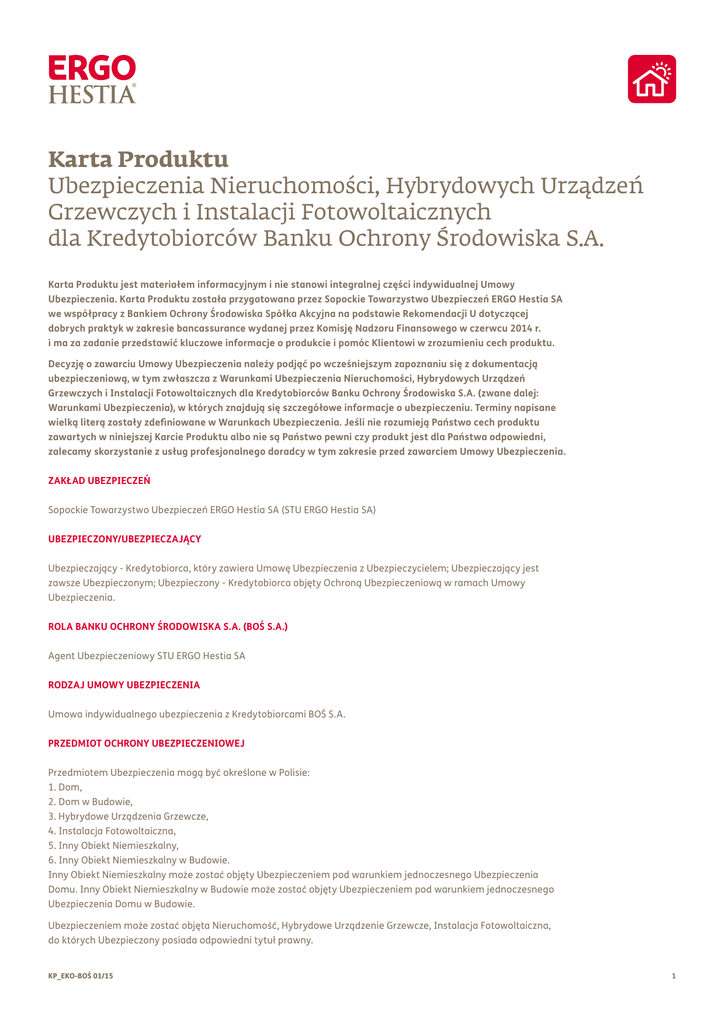 Karta Produktu Ubezpieczenia Nieruchomości, Hybrydowych Urządzeń Grzewczych i Instalacji Fotowoltaicznych dla Kredytobiorców Banku Ochrony Środowiska S.A. Karta Produktu jest materiałem informacyjnym i nie stanowi integralnej części indywidualnej Umowy Ubezpieczenia. Karta Produktu została przygotowana przez Sopockie Towarzystwo Ubezpieczeń ERGO Hestia SA we współpracy z Bankiem Ochrony Środowiska Spółka Akcyjna na podstawie Rekomendacji U dotyczącej dobrych praktyk w zakresie bancassurance wydanej przez Komisję Nadzoru Finansowego w czerwcu 2014 r. i ma za zadanie przedstawić kluczowe informacje o produkcie i pomóc Klientowi w zrozumieniu cech produktu. Decyzję o zawarciu Umowy Ubezpieczenia należy podjąć po wcześniejszym zapoznaniu się z dokumentacją ubezpieczeniową, w tym zwłaszcza z Warunkami Ubezpieczenia Nieruchomości, Hybrydowych Urządzeń Grzewczych i Instalacji Fotowoltaicznych dla Kredytobiorców Banku Ochrony Środowiska S.A. (zwane dalej: Warunkami Ubezpieczenia), w których znajdują się szczegółowe informacje o ubezpieczeniu. Terminy napisane wielką literą zostały zdefiniowane w Warunkach Ubezpieczenia. Jeśli nie rozumieją Państwo cech produktu zawartych w niniejszej Karcie Produktu albo nie są Państwo pewni czy produkt jest dla Państwa odpowiedni, zalecamy skorzystanie z usług profesjonalnego doradcy w tym zakresie przed zawarciem Umowy Ubezpieczenia. Zakład Ubezpieczeń Sopockie Towarzystwo Ubezpieczeń ERGO Hestia SA (STU ERGO Hestia SA) Ubezpieczony/Ubezpieczający Ubezpieczający - Kredytobiorca, który zawiera Umowę Ubezpieczenia z Ubezpieczycielem; Ubezpieczający jest zawsze Ubezpieczonym; Ubezpieczony - Kredytobiorca objęty Ochroną Ubezpieczeniową w ramach Umowy Ubezpieczenia. Rola Banku Ochrony Środowiska S.A. (BOŚ S.A.) Agent Ubezpieczeniowy STU ERGO Hestia SA Rodzaj umowy ubezpieczenia Umowa indywidualnego ubezpieczenia z Kredytobiorcami BOŚ S.A. Przedmiot ochrony ubezpieczeniowej Przedmiotem Ubezpieczenia mogą być określone w Polisie: 1. Dom, 2. Dom w Budowie, 3. Hybrydowe Urządzenia Grzewcze, 4. Instalacja Fotowoltaiczna, 5. Inny Obiekt Niemieszkalny, 6. Inny Obiekt Niemieszkalny w Budowie. Inny Obiekt Niemieszkalny może zostać objęty Ubezpieczeniem pod warunkiem jednoczesnego Ubezpieczenia Domu. Inny Obiekt Niemieszkalny w Budowie może zostać objęty Ubezpieczeniem pod warunkiem jednoczesnego Ubezpieczenia Domu w Budowie. Ubezpieczeniem może zostać objęta Nieruchomość, Hybrydowe Urządzenie Grzewcze, Instalacja Fotowoltaiczna, do których Ubezpieczony posiada odpowiedni tytuł prawny. KP_EKO-BOŚ 01/15 1 Ochroną Ubezpieczeniową objęte mogą zostać Hybrydowe Urządzenia Grzewcze, Pompy Ciepła, Kolektory Słoneczne i Instalacja Fotowoltaiczna o mocy do 10 kW. Zakres ochrony ubezpieczeniowej 1. Z zastrzeżeniem postanowień ust. 2-3 Domy, Inne Obiekty Niemieszkalne, Hybrydowe Urządzenia Grzewcze i/lub Instalacje Fotowoltaiczne objęte są Ochroną Ubezpieczeniową od szkód powstałych wskutek: a) Pożaru, b) Uderzenia Pioruna, c) Wybuchu, d) Dymu i Sadzy, e) Powodzi, f) Zalania, g) Spływu Wód po Zboczach, h) Gradu, i) Naporu Śniegu, j) opadów atmosferycznych, k) Zapadania się Ziemi, l) Osunięcia się Ziemi, m) Lawiny, n) Huraganu, o) Trzęsienia Ziemi, p) Akcji Ratowniczej, q) Upadku Statku Powietrznego, r) Upadku Drzewa lub Masztu, s) Uderzenia Pojazdu, t) Huku Ponaddźwiękowego, u) Wandalizmu. 2. Z zastrzeżeniem postanowień ust. 3, Domy, Inne Obiekty Niemieszkalne w Budowie, Hybrydowe Urządzenia Grzewcze i/lub Instalacje Fotowoltaiczne zamontowane w lub na Nieruchomości w Budowie, objęte są Ochroną Ubezpieczeniową wyłącznie od szkód powstałych wskutek: a) pożaru, b) Uderzenia Pioruna, c) Wybuchu, d) Powodzi, e) Spływu Wód po Zboczach, f) Zapadania się Ziemi, g) Osunięcia się Ziemi, h) Lawiny, i) Trzęsienia Ziemi, j) Akcji Ratowniczej, k) Upadku Statku Powietrznego, l) Upadku Drzewa lub Masztu, m) Uderzenia Pojazdu, n) Katastrofy Budowlanej. 3. Jeżeli w trakcie trwania Ochrony Ubezpieczeniowej, w stosunku do Budynków, o których mowa w ust. 2 powyżej, zostanie wydane przez właściwy organ nadzoru budowlanego pozwolenie na użytkowanie (lub zgodnie z obowiązującymi przepisami prawa umożliwione zostanie użytkowanie) od dnia oddania Budynków do użytkowania objęte są one Ochroną Ubezpieczeniową w zakresie, o którym mowa w ust. 1 powyżej. 4. Jeżeli na Posesji prowadzona jest Budowa, Hybrydowe Urządzenia Grzewcze i Instalacja Fotowoltaiczna objęte są Ochroną Ubezpieczeniową w zakresie określonym w ust. 2 powyżej. 5. Jeżeli na Posesji nie jest prowadzona Budowa, Hybrydowe Urządzenia Grzewcze i Instalacje Fotowoltaiczne objęte są Ochroną Ubezpieczeniową w zakresie określonym w ust. 1. Hybrydowe Urządzenia Grzewcze i Instalacje Fotowoltaiczne mogą zostać objęte Ubezpieczeniem od Kradzieży z Włamaniem i Kradzieży za opłatą dodatkowej składki ubezpieczeniowej, jedynie w przypadku jednoczesnego objęcia jej Ochroną Ubezpieczeniową w zakresie określonym w ust. 1 powyżej. 6. Instalacja Fotowoltaiczna może zostać objęta Ubezpieczeniem od Spadku Wydajności za opłatą dodatkowej składki ubezpieczeniowej, jedynie w przypadku jednoczesnego objęcia jej Ochroną Ubezpieczeniową w zakresie określonym w ust. 5 powyżej. 2 Co otrzymasz w ramach ubezpieczenia? Prosimy o szczególnie uważną lekturę tego punktu. KP_EKO-BOŚ 01/15 Infolinia (+48) 58 558 70 59* *opłata za połączenie zgodnie z cennikiem operatora www.ergohestia.pl Okres ochrony ubezpieczeniowej Okres Ochrony Ubezpieczeniowej wynosi 12 miesięcy. Okres Ubezpieczenia wskazany jest na Polisie. Ochrona Ubezpieczeniowa w stosunku do Ubezpieczonego, rozpoczyna się w dniu następnym po dniu zawarcia Umowy Ubezpieczenia, jednak nie wcześniej niż z dniem opłacenia składki ubezpieczeniowej. Składka ubezpieczeniowa Składka obliczana jest jako iloczyn aktualnie obowiązują
