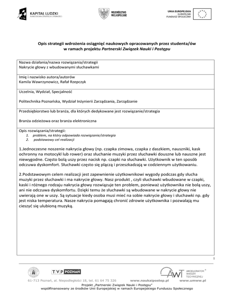 Opis strategii wdrożenia osiągnięć naukowych opracowanych przez studenta/ów w ramach projektu Partnerski Związek Nauki i Postępu Nazwa działania/nazwa rozwiązania/strategii Nakrycie głowy z wbudowanymi słuchawkami Imię i nazwisko autora/autorów Kamila Wawrzynowicz, Rafał Rzepczyk Uczelnia, Wydział, Specjalnośd Politechnika Poznaoska, Wydział Inżynierii Zarządzania, Zarządzanie Przedsiębiorstwo lub branża, dla których dedykowane jest rozwiązanie/strategia Branża odzieżowa oraz branża elektroniczna Opis rozwiązania/strategii: 1. problem, na który odpowiada rozwiązanie/strategia 2. podstawowy cel realizacji 1.Jednoczesne noszenie nakrycia głowy (np. czapka zimowa, czapka z daszkiem, nauszniki, kask ochronny na motocykl lub rower) oraz słuchanie muzyki przez słuchawki douszne lub nauszne jest niewygodne. Często bolą uszy przez nacisk np. czapki na słuchawki. Użytkownik w ten sposób odczuwa dyskomfort. Słuchawki często się plączą i przeszkadzają w codziennym użytkowaniu. 2.Podstawowym celem realizacji jest zapewnienie użytkownikowi wygody podczas gdy słucha muzyki przez słuchawki i ma nakrycie głowy. Nasz produkt , czyli słuchawki wbudowane w czapki, kaski i różnego rodzaju nakrycia głowy rozwiązuje ten problem, ponieważ użytkownika nie bolą uszy, ani nie odczuwa dyskomfortu. Dzięki temu że słuchawki są wbudowane w nakrycie głowy nie uwierają one w uszy. Są sytuacje kiedy osoba musi mied na sobie nakrycie głowy i słuchawki np. gdy jest niska temperatura. Nasze nakrycia pomagają chronid zdrowie użytkownika i pozwalają mu cieszyd się ulubioną muzyką. 1 61-713 Poznań, al. Niepodległości 18, tel. 61 64 75 326 www.naukaipostep.pl www.umww.pl Projekt „Partnerski Związek Nauki i Postępu” współfinansowany ze środków Unii Europejskiej w ramach Europejskiego Funduszu Społecznego Elementy innowacyjne rozwiązania/strategii (jeśli istnieją) Nakrycie głowy jest innowacyjne, ponieważ posiada wbudowane słuchawki. Do tej pory jest mało takich rozwiązao pozwalających użytkownikowi na słuchanie muzyki np. podczas podróżowania dwuśladem. Dzięki naszym produktom klient odczuwa komfort podczas jednoczesnego noszenia nakrycia głowy i słuchania ulubionej muzyki. Słuchawki są chronione wodoodporną obudową, która chroni je przed uszkodzeniem na skutek zmian pogodowych. Spodziewane korzyści dla przedsiębiorstwa wdrażającego rozwiązanie/strategię Pozyskanie nowych klientów przede wszystkim w wieku 15-25 lat przez wypuszczenie na rynek serii produktów, których na rynku jest bardzo mało, a które mogą byd dla nich atrkcyjne, Wzrost dochodów przedsiębiorstwa, Wzrost popularności przedsiębiorstwa, Rozwój przedsiębiorstwa - daną strategię mogą wprowadzid przedsiębiorstwa z branży odzieżowej oraz elektronicznej, sklepy odzieżowe mogą w pewnym stopniu wejśd na rynek urządzeo elektronicznych, sklepy elektroniczne mogą w pewnym stopniu wejśd na rynek odzieżowy Współpraca między przedsiębiorstwami z branży odzieżowej i elektronicznej – pozyskanie, wspólników, Powiększenie rynku działania przedsiębiorstwa. Wyrażamy zgodę na przetwarzanie naszych danych osobowych. 2 61-713 Poznań, al. Niepodległości 18, tel. 61 64 75 326 www.naukaipostep.pl www.umww.pl Projekt „Partnerski Związek Nauki i Postępu” współfinansowany ze środków Unii Europejskiej w ramach Europejskiego Funduszu Społecznego