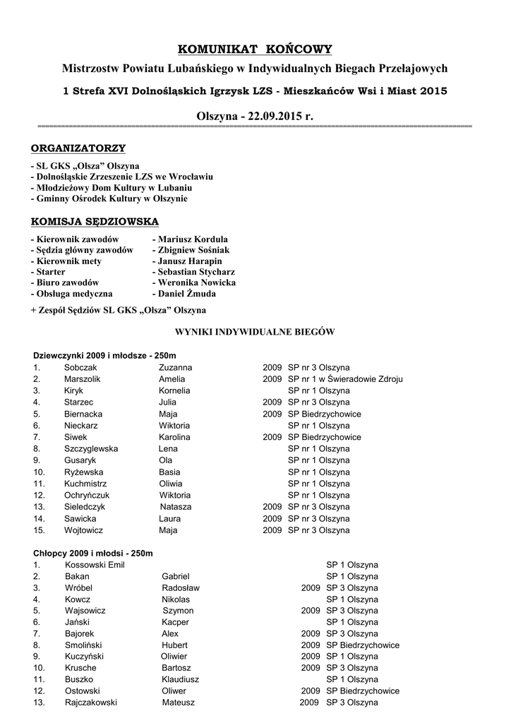 KOMUNIKAT KOŃCOWY Mistrzostw Powiatu Lubańskiego w Indywidualnych Biegach Przełajowych 1 Strefa XVI Dolnośląskich Igrzysk LZS - Mieszkańców Wsi i Miast 2015 Olszyna - 22.09.2015 r. =============================================================================================================== ORGANIZATORZY - SL GKS „Olsza” Olszyna - Dolnośląskie Zrzeszenie LZS we Wrocławiu - Młodzieżowy Dom Kultury w Lubaniu - Gminny Ośrodek Kultury w Olszynie KOMISJA SĘDZIOWSKA - Kierownik zawodów - Sędzia główny zawodów - Kierownik mety - Starter - Biuro zawodów - Obsługa medyczna - Mariusz Kordula - Zbigniew Sośniak - Janusz Harapin - Sebastian Stycharz - Weronika Nowicka - Daniel Żmuda + Zespół Sędziów SL GKS „Olsza” Olszyna WYNIKI INDYWIDUALNE BIEGÓW Dziewczynki 2009 i młodsze - 250m 1. Sobczak Zuzanna 2. Marszolik Amelia 3. Kiryk Kornelia 4. Starzec Julia 5. Biernacka Maja 6. Nieckarz Wiktoria 7. Siwek Karolina 8. Szczyglewska Lena 9. Gusaryk Ola 10. Ryżewska Basia 11. Kuchmistrz Oliwia 12. Ochryńczuk Wiktoria 13. Sieledczyk Natasza 14. Sawicka Laura 15. Wojtowicz Maja Chłopcy 2009 i młodsi - 250m 1. Kossowski Emil 2. Bakan Gabriel 3. Wróbel Radosław 4. Kowcz Nikolas 5. Wajsowicz Szymon 6. Jański Kacper 7. Bajorek Alex 8. Smoliński Hubert 9. Kuczyński Oliwier 10. Krusche Bartosz 11. Buszko Klaudiusz 12. Ostowski Oliwer 13. Rajczakowski Mateusz 2009 SP nr 3 Olszyna 2009 SP nr 1 w Świeradowie Zdroju SP nr 1 Olszyna 2009 SP nr 3 Olszyna 2009 SP Biedrzychowice SP nr 1 Olszyna 2009 SP Biedrzychowice SP nr 1 Olszyna SP nr 1 Olszyna SP nr 1 Olszyna SP nr 1 Olszyna SP nr 1 Olszyna 2009 SP nr 3 Olszyna 2009 SP nr 3 Olszyna 2009 SP nr 3 Olszyna 2009 2009 2009 2009 2009 2009 2009 2009 SP 1 Olszyna SP 1 Olszyna SP 3 Olszyna SP 1 Olszyna SP 3 Olszyna SP 1 Olszyna SP 3 Olszyna SP Biedrzychowice SP 1 Olszyna SP 3 Olszyna SP 1 Olszyna SP Biedrzychowice SP 3 Olszyna 14. 15. 16. 17. 18. 19. 20. 21. 22. 23. 24. Spiżarski Miodowski Zieliński Suświak Mokras Tudruj Bemowski Andrzejewski Melnyk Charliński Pietkiewicz Dziewczęta 2008 - 250m 1. Wieliczkiewicz 2. Gawron 3. Wójcik 4. Choroszewicz 5. Dubiel 6. Markowska 7. Sawicka 8. Roszyk 9. Tabacharska 10. Babij 11. Kurczewska 12. Swarzyńska 13. Cenda 14. Wyspiańska Chłopcy 2008 - 250m 1. Szaniawski 2. Malamis 3. Szelest 4. Drozd 5. Cybulski 6. Rawlik 7. Rychlik 8. Frankowski 9. Kubanik 10. Duś 11. Staroń 12. Brodziak 13. Dębski 14. Krajewski 15. Andrzejewski 16. Krawczyk 17. Alber 18. Dzioba 19. Roskowiński 20. Remez 21. Ośmiałowski 22. Fedczak 23. Kowalczyk 24. Baciak 25. Stachniuk 26. Buczyński 27. Bąbiński 28. Szelest 29. Hyliński 30. Bahryj Konrad Filip Jan Dominik Bartek Daniel Mateusz Bartosz Michał Filip Natan Maja Milena Magdalena Małgorzata Wiktoria Emilia Gabriela Natalia Klaudia Lena Oliwia Maja Jacek Jakub Igor Kacper Gabriel Piotr Wiktor Paweł Gracjan Patryk Mateusz Florian Arek Kamil Maciej Sergiusz Jakub Jakub Mateusz Marcel Filip Dariusz Olek SP 1 Olszyna 2009 SP Biedrzychowice SP 1 Olszyna SP 1 Olszyna SP 1 Olszyna 2009 SP Biedrzychowice SP 1 Olszyna SP 1 Olszyna 2008 SP Biedrzychowice SP 1 Olszyna SP 1 Olszyna SP 3 Olszyna SP 3 Olszyna SP 1 Świeradów Zdrój SP 3 Olszyna SP 3 Olszyna SP 1 Olszyna ZS Zaręba SP 1 Olszyna SP 1 Olszyna SP 1 Olszyna SP 1 Olszyna SP 3 Olszyna SP Biedrzychowice SP 1 Olszyna SP 1 Świeradów Zdrój SP 4 Lubań SP 3 Olszyna SP 3 Olszyna SP 1 Olszyna SP 3 Olszyna SP 3 Olszyna SP 1 Olszyna SP 1 Olszyna SP 1 Olszyna SP Biedrzychowice ZS Zaręba SP Biedrzychowice SP Biedrzychowice SP 1 Olszyna SP 3 Olszyna SP 3 Olszyna SP 1 Olszyna SP 1 Olszyna SP 3 Olszyna SP Biedrzychowice SP 3 Olszyna SP 1 Olszyna SP 3 Olszyna SP 1 Olszyna SP 3 Olszyna SP 1 Olszyna SP 1 Olszyna ZS Zaręba SP 1 Olszyna 31. 32. Baran Jenczelewski Dziewczęta 2007 - 250m 1. Kędzierska 2. Brodowska 3. Przybylak 4. Jabłonowska 5. Bigaj 6. Bokisz 7. Kurczewska 8. Starzec 9. Bobowska 10. Niechwiadowicz 11. Charlińska 12. Cieplik 13. Sarzyńska 14. Harasimow 15. Seerk 16. Szczęsna 17. Kawałko 18. Buturla 19. Grubizna 20. Rutkowska 21. Kończyk 22. Chilińska 23. Bernadzka 24. Polerecka 25. Szeliga 26. Smajda 27. Lelko 28. Kumosz 29. Szczyrbuła 30. Bździuch 31. Juszkiewicz 32. Ignaciuk 33. Markowska Chłopcy 2007 - 250m 1. Janowicz 2. Majer 3. Oliwier 4. Błaszczyk 5. Zygmunt 6. Matoga 7. Pietrykowski 8. Kuczykowski 9. Krawczyk 10. Paś 11. Łasocha 12. Ładocha 13. Drozd 14. Kurczewski 15. Ostrowski 16. Stycharz 17. Trojanowski 18. Krajewski 19. Wyspiański 20. Strzałkowski 21. Szymola 22. Starzec Nikolas Lena Milena Gabriela Anna Nikola Lena Julia Oliwia Julia Wiktoria Maja Zuzanna Nina Zuzanna Lena Kaja Bartosz Julia Milena Wiktoria Martyna Wiktoria Natalia Dominika Martyna Jagoda Daria Iwa Weronika Tatianna Oliwia Kornelia Weronika Dawid Kacper Bzdęga Cypian Piotr Dominik Dawid Krzysztof Szymon Rafał Samuel Seweryn Bartłomiej Marcin Maciej Kacper Mateusz Sebastian Bartosz Jakub Augustyn Gabriel SP 1 Olszyna SP 1 Olszyna SP Siekierczyn SP Biedrzychowice SP 3 Olszyna SP 1 Świeradów Zdrój SP 1 Olszyna SP 1 Świeradów Zdrój SP 3 Olszyna SP 3 Olszyna SP 3 Olszyna SP 1 Olszyna SP 1 Olszyna SP 1 Olszyna SP 3 Olszyna SP 1 Olszyna SP 1 Olszyna SP 1 Olszyna SP 1 Olszyna ZS Zaręba SP Biedrzychowice SP 1 Olszyna SP 3 Olszyna SP 3 Olszyna SP 1 Olszyna SP 1 Olszyna SP Biedrzychowice SP 3 Olszyna SP 3 Olszyna SP 1 Olszyna SP 1 Olszyna SP 1 Olszyna SP 1 Olszyna SP 1 Olszyna SP Biedrzychowice SP 1 Olszyna SP Siekierczyn SP 3 Olszyna SP 3 Olszyna SP 1 Olszyna SP 1 Olszyna SP 1 Olszyna SP 1 Olszyna SP Biedrzychowice SP 3 Olszyna SP 1 Olszyna SP 1 Olszyna ZS Zaręba SP 3 Olszyna SP Biedrzychowice SP 1 Olszyna SP 1 Olszyna SP Biedrzychowice SP 1 Olszyna SP Biedrzychowice SP 1 Olszyna SP 3 Olszyna 23. 24. 25. 26. 27. 28. 29. 30. 31. Krasny Krawczyk Szeliga Nowak Pożytko Szpila Janiszyn Miodowski Zawada Szymon Krystian Maksymilian Piotr Michał Radosław Kamil Klaudiusz Norbert Dziewczęta 2006 - 350m 1. 