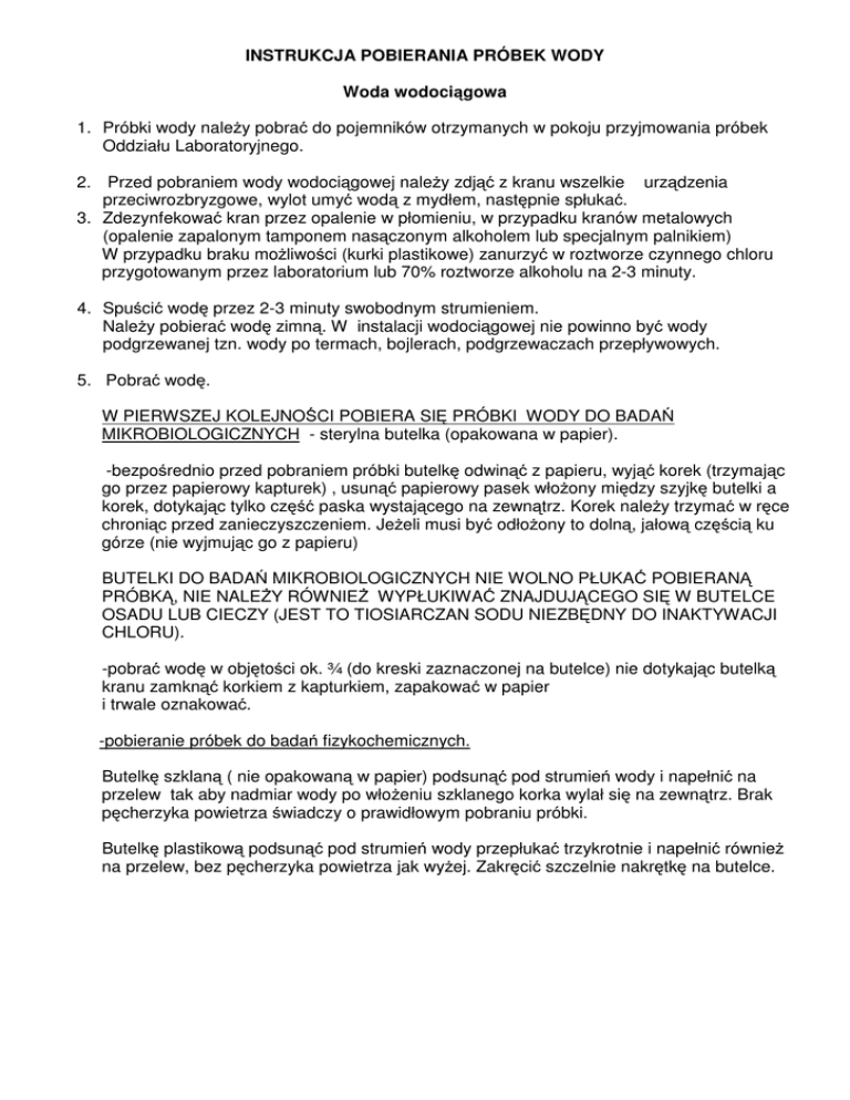 INSTRUKCJA POBIERANIA PRÓBEK WODY Woda wodociągowa 1. Próbki wody należy pobrać do pojemników otrzymanych w pokoju przyjmowania próbek Oddziału Laboratoryjnego. 2. Przed pobraniem wody wodociągowej należy zdjąć z kranu wszelkie urządzenia przeciwrozbryzgowe, wylot umyć wodą z mydłem, następnie spłukać. 3. Zdezynfekować kran przez opalenie w płomieniu, w przypadku kranów metalowych (opalenie zapalonym tamponem nasączonym alkoholem lub specjalnym palnikiem) W przypadku braku możliwości (kurki plastikowe) zanurzyć w roztworze czynnego chloru przygotowanym przez laboratorium lub 70% roztworze alkoholu na 2-3 minuty. 4. Spuścić wodę przez 2-3 minuty swobodnym strumieniem. Należy pobierać wodę zimną. W instalacji wodociągowej nie powinno być wody podgrzewanej tzn. wody po termach, bojlerach, podgrzewaczach przepływowych. 5. Pobrać wodę. W PIERWSZEJ KOLEJNOŚCI POBIERA SIĘ PRÓBKI WODY DO BADAŃ MIKROBIOLOGICZNYCH - sterylna butelka (opakowana w papier). -bezpośrednio przed pobraniem próbki butelkę odwinąć z papieru, wyjąć korek (trzymając go przez papierowy kapturek) , usunąć papierowy pasek włożony między szyjkę butelki a korek, dotykając tylko część paska wystającego na zewnątrz. Korek należy trzymać w ręce chroniąc przed zanieczyszczeniem. Jeżeli musi być odłożony to dolną, jałową częścią ku górze (nie wyjmując go z papieru) BUTELKI DO BADAŃ MIKROBIOLOGICZNYCH NIE WOLNO PŁUKAĆ POBIERANĄ PRÓBKĄ, NIE NALEŻY RÓWNIEŻ WYPŁUKIWAĆ ZNAJDUJĄCEGO SIĘ W BUTELCE OSADU LUB CIECZY (JEST TO TIOSIARCZAN SODU NIEZBĘDNY DO INAKTYWACJI CHLORU). -pobrać wodę w objętości ok. ¾ (do kreski zaznaczonej na butelce) nie dotykając butelką kranu zamknąć korkiem z kapturkiem, zapakować w papier i trwale oznakować. -pobieranie próbek do badań fizykochemicznych. Butelkę szklaną ( nie opakowaną w papier) podsunąć pod strumień wody i napełnić na przelew tak aby nadmiar wody po włożeniu szklanego korka wylał się na zewnątrz. Brak pęcherzyka powietrza świadczy o prawidłowym pobraniu próbki. Butelkę plastikową podsunąć pod strumień wody przepłukać trzykrotnie i napełnić również na przelew, bez pęcherzyka powietrza jak wyżej. Zakręcić szczelnie nakrętkę na butelce. Woda studzienna – pobrana bezpośrednio ze studni -wodę pobrać przy pomocy wiadra (lub innego naczynia czerpalnego) , przeznaczonego tylko do wody, czystego, wyparzonego) Z butelki wyjąć korek trzymając za papierowy kapturek, usunąć pasek, nalać wodę z wiadra do butelki, nie dotykać szyjki butelki brzegiem wiadra. Nie zanurzać butelki w wiadrze. Następnie napełnić butelki do badań fizykochemicznych: szklaną nie opakowaną w papier oraz butelkę plastikową. Dalszy tryb postępowania jak w przypadku wody wodociągowej. Butelki z pobraną próbką natychmiast po pobraniu należy dostarczyć do Oddziału Laboratoryjnego od godz. 7:30-12:00 po wcześniejszym uzgodnieniu terminu badań. Próbki powinny być transportowane w termotorbie z wkładami lodowymi ( lub w lodówce samochodowej) w temp. 2-8ºC. Jeżeli nie ma możliwości transportowania w warunkach chłodniczych (termotorbie) czas od momentu pobrania do momentu dostarczenia próbki nie powinien przekroczyć 2h, próbki powinny być transportowane w ciemności. Wszystkie inne rodzaje próbek wody oraz inne sposoby pobierania próbek należy indywidualnie konsultować z Oddziałem Laboratoryjnym. SPOSÓB POBIERANIA PRÓBKI ORAZ WARUNKI JEJ TRANSPORTU MAJĄ ISTOTNY WPŁYW NA UZYSKANE WYNIKI BADAŃ. LABORATORIUM NIE PONOSI ODPOWIEDZIALNOŚCI ZA POBÓR, WARUNKI TRANSPORTU PRÓBY POBIERANEJ PRZEZ KLIENTA.