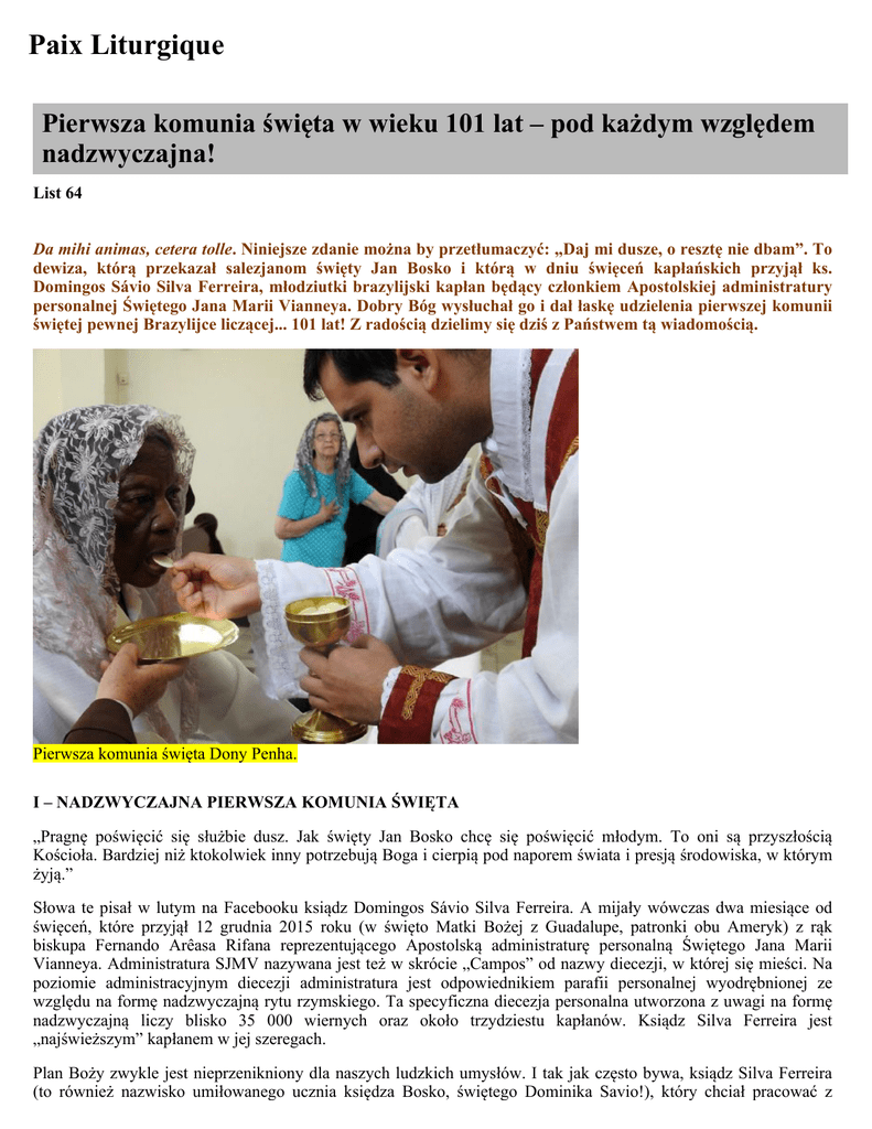 Paix Liturgique Pierwsza komunia święta w wieku 101 lat – pod każdym względem nadzwyczajna! List 64 Da mihi animas, cetera tolle. Niniejsze zdanie można by przetłumaczyć: „Daj mi dusze, o resztę nie dbam”. To dewiza, którą przekazał salezjanom święty Jan Bosko i którą w dniu święceń kapłańskich przyjął ks. Domingos Sávio Silva Ferreira, młodziutki brazylijski kapłan będący członkiem Apostolskiej administratury personalnej Świętego Jana Marii Vianneya. Dobry Bóg wysłuchał go i dał łaskę udzielenia pierwszej komunii świętej pewnej Brazylijce liczącej... 101 lat! Z radością dzielimy się dziś z Państwem tą wiadomością. Pierwsza komunia święta Dony Penha. I – NADZWYCZAJNA PIERWSZA KOMUNIA ŚWIĘTA „Pragnę poświęcić się służbie dusz. Jak święty Jan Bosko chcę się poświęcić młodym. To oni są przyszłością Kościoła. Bardziej niż ktokolwiek inny potrzebują Boga i cierpią pod naporem świata i presją środowiska, w którym żyją.” Słowa te pisał w lutym na Facebooku ksiądz Domingos Sávio Silva Ferreira. A mijały wówczas dwa miesiące od święceń, które przyjął 12 grudnia 2015 roku (w święto Matki Bożej z Guadalupe, patronki obu Ameryk) z rąk biskupa Fernando Arêasa Rifana reprezentującego Apostolską administraturę personalną Świętego Jana Marii Vianneya. Administratura SJMV nazywana jest też w skrócie „Campos” od nazwy diecezji, w której się mieści. Na poziomie administracyjnym diecezji administratura jest odpowiednikiem parafii personalnej wyodrębnionej ze względu na formę nadzwyczajną rytu rzymskiego. Ta specyficzna diecezja personalna utworzona z uwagi na formę nadzwyczajną liczy blisko 35 000 wiernych oraz około trzydziestu kapłanów. Ksiądz Silva Ferreira jest „najświeższym” kapłanem w jej szeregach. Plan Boży zwykle jest nieprzenikniony dla naszych ludzkich umysłów. I tak jak często bywa, ksiądz Silva Ferreira (to również nazwisko umiłowanego ucznia księdza Bosko, świętego Dominika Savio!), który chciał pracować z młodzieżą został kapelanem domu spokojnej starości pod wezwaniem Matki Bożej z góry Karmel. W placówce czekała go wyjątkowa łaska: zbawienie duszy Dony Penha, 101-letniej pensjonariuszki. Jak dowiadujemy się za pośrednictwem agencji ACI Digital w artykule z 28 września 2016 (czytaj tutaj), Dona Penha przyjechała do ośrodka w zeszłym roku. Domem opiekują się siostry zakonne i w domowej kaplicy regularnie odprawiana jest za pensjonariuszy Msza Święta. „Dona Penha na początku przychodziła na liturgie dla towarzystwa, z innymi paniami, aż pewnego dnia poprosiła o spowiedź”, jak wspomina pracująca w domu opieki Josiane. „Ksiądz Silva Ferreira zdał sobie sprawę, że penitentka nigdy w życiu nie przyjmowała Sakramentu Eucharystii, więc poprosił siostry o przygotowanie jej do pierwszej komunii.” We wtorek 27 września 2016 roku, stu jednoletnia kobieta przez ręce młodego kapelana otrzymała więc łaskę i doznała wielkiej radości przyjęcia po raz pierwszy Najświętszego Sakramentu. „Wszyscy, którzy jej towarzyszyli zrozumieli, że było to rzeczywiście jej wielkie pragnienie. Mimo podeszłego wieku jest osobą o bardzo jasnym umyśle. Przygotowała się i przyjęła komunię świętą całym sercem – potwierdza Josiane. To była cudowna chwila, która uświadomiła nam, że nigdy nie jest za późno, aby przyjąć Najświętszy Sakrament i która umocniła nas w wierze.” To pod wszelkimi względami nadzwyczajne wydarzenie – od formy mszy świętej celebrowanej przez księdza Silva Ferreira poczynając – dowodzi, że ani czas, ani wzgląd na ludzkie opinie nie mogą zdeterminować człowieka, który naprawdę szuka Boga. Pierwsza komunia, z której zdjęcia zostały opublikowane na Facebooku i obiegły dziesiątki użytkowników, przestała być wydarzeniem prywatnym, ograniczonym do zamkniętego grona uczestniczących w ceremonii pensjonariuszy i personelu. Zyskała szeroki rozgłos, szczególnie dzięki artykułowi agencji ACI, czyli naczelnej katolickiej agencji informacyjnej obszaru południowoamerykańskiego. Ksiądz Silva Ferreira wraz z rodzicami podczas ceremonii sakramentu kapłaństwa. II – UWAGI PAIX LITURGIQUE 1) Apostolska administratura personalna Świętego Jana Marii Vianneya jest od 2002 roku prowadzona przez J.E. Fernando Arêasa Rifana. Narodziła się ze sprzeciwu pewnego brazylijskiego biskupa wobec posoborowych zawirowań. W latach 1949-1981 biskup diecezji Campos (w Stanie Rio de Janeiro), Antônio de Castro-Mayer nie zgodził się na porzucenie mszału tradycyjnego i dał początek bractwu kapłańskiemu wiernemu tradycyjnej doktrynie i tradycyjnej liturgii Kościoła: Bractwu Kapłańskiemu Świętego Jana Marii Vianneya. Biskup de Castro Mayer wspólnie z biskupem Lefebvrem wyświęcił w 1988 roku biskupów Bractwa św. Piusa X. Jego następcą został Licinio Rangel, który krótko przed swoim odejściem do Pana, pod koniec roku 2001 doczekał kanonicznego uznania Bractwa. Otrzymało ono status doraźny jako apostolska administratura personalna, którą można porównać do diecezji zrzeszającej kapłanów i wiernych związanych z liturgią tradycyjną. 2) Jedną z cech charakterystycznych dla wielu kapłanów oddanych sprawowaniu liturgii tradycyjnej jest to, że posiadają ducha misyjnego. Wspomniana pierwsza komunia święta w sumie jest skromnym symbolem szerokiej działalności apostolskiej prowadzonej przez księdza Silvę Ferreira, młodego kapłana zapalonego do pracy dla pożytku dusz. Zrozumiał on, że misja zaczyna się często w bliskości tabernakulum, tam, gdzie Jezus w Hostii skryty wzywa nas i czeka na nas. W wielu diecezjach świata, a szczególnie w Europie, brakuje księży w służbie dusz. Niewielu wszak biskupów odważa się powierzyć misje kapłanom wyświęconym dla formy nadzwyczajnej. Chodzi o rodzaj misji „przekrojowych”, 