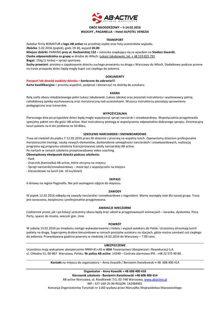 OBÓZ MŁODZIEŻOWY – 5-14.02.2016 WŁOCHY , PAGANELLA – Hotel ALPOTEL VENEZIA TRANSPORT Autokar firmy BOMATUR z logo AB active na przedniej szybie oraz listą uczestników wyjazdu. Zbiórka: 5.02.2016 (piątek), godz.19.30, wyjazd 20.00 Miejsce zbiórki: PARKING przy ul. Racławickiej 132 – zatoczka znajdująca się za wjazdem na Stadion Gwardii. Osoba odpowiedzialna za grupę w drodze do Włoch: Łukasz Jakubowski, tel. + 48 519 825 791 Bagaż: 15kg (1 torba) + sprzęt sportowy Suchy prowiant: prosimy o zapakowanie dziecku suchego prowiantu na drogę z Warszawy do Włoch. Dodatkowo podczas przerw na trasie przejazdu dzieci będą mogły kupić coś ciepłego do jedzenia. DOKUMENTY Paszport lub dowód osobisty dziecka – konieczne do zabrania!!! Karta kwalifikacyjna – prosimy wypełnić, podpisać i dostarczyć na zbiórkę do autokaru. KADRA Rolę szefa obozu młodzieżowego pełni Łukasz Jakubowski. Łukasz (deska) oraz pozostali instruktorzy i wychowawcy pełnią całodobową opiekę wychowawczą oraz merytoryczną nad uczestnikami. Wszyscy instruktorzy posiadają uprawnienia pedagogiczne oraz trenerskie. WYPOŻYCZALNIA Pierwszego dnia po przyjeździe dzieci będą mogły wypożyczyć sprzęt narciarski i snowboardowy. Wypożyczalnia przygotowała specjalny pakiet cen dla gości AB active. Nasi instruktorzy pomogą w wypożyczeniu odpowiednio dobranego sprzętu. Orientacyjny koszt pakietu na 6 dni jeżdżenia to 50-80eu. SZKOLENIE NARCIARSKIE I SNOWBOARDOWE Trwa od niedzieli do piątku 7-12.02.2016 przez 6h dziennie z przerwą na wspólny lunch. Zapewniamy dzieciom profesjonalne merytorycznie treningi, naukę nowych elementów, doskonalenie umiejętności narciarskich i snowboardowych, realizację programu wg programu szkolenia licencjonowanej szkoły narciarskiej AB active. Po nartach w ramach szkolenia przeprowadzamy video coaching. Obowiązkowy ekwipunek dziecka podczas szkolenia: - Kask - Znacznik (kamizelka) AB active, które otrzyma na miejscu - Sprzęt narciarski/snowboardowy – może być z wypożyczalni na miejscu - Kieszonkowe na lunch (ok. 10 eu/dzień) SKIPASS 6 dniowy na region Paganella. Nie jest wymagane zdjęcie do skipassu. ZAWODY W piątek 12.02.2016 odbędą się zawody narciarskie i snowboardowe z nagrodami. Mamy wynajęty stok dla naszej grupy. Trasa jest oznaczona, bezpieczna i profesjonalnie przygotowana. ANIMACJE WIECZORNE Codziennie przed, jak i po kolacji uczestnicy obozu będą brać udział w przygotowanych animacjach – karaoke, dyskoteka, Pizza Party, spacer do miasta, wieczór gier, inne. POWRÓT W sobotę 13.02.2016 po śniadaniu nastąpi wykwaterowanie z hotelu i wyjazd autokaru do Polski. Uczestnicy otrzymają lunch pakiety na drogę. Sugerujemy drobne kieszonkowe w ramach postojów autokaru na stacjach, gdzie można zamówić coś ciepłego do jedzenia. Przewidywana godzina powrotu w niedzielę 14.02.2016 do Warszawy – 7.00 rano. UBEZPIECZENIE Uczestnicy mają wykupione ubezpieczenie NNW+KL+AS w AXA Towarzystwo Ubezpieczeń i Reasekuracji S.A. ul. Chłodna 51, 00-867 Warszawa, Polska. Nr polisy AB active 14349 – Centrala alarmowa IPA : +48 22 575 90 80. Kontakt na miejscu do organizatora – Anna Kowalik / Beniamin Kwiatkowski + 48 608 400 414 Organizator - Anna Kowalik + 48 608 400 418 Kierownik szkolenia - Beniamin Kwiatkowski +48 608 400 414 AB active Warszawa, ul. Rzodkiewki 7/2, 02-748 Warszawa, www.abactive.pl NIP : 527-169-25-96 REGON: 142484901 Koncesja Organizatorów Turystyki nr 1160 wydana przez Marszałka Województwa Mazowieckiego
