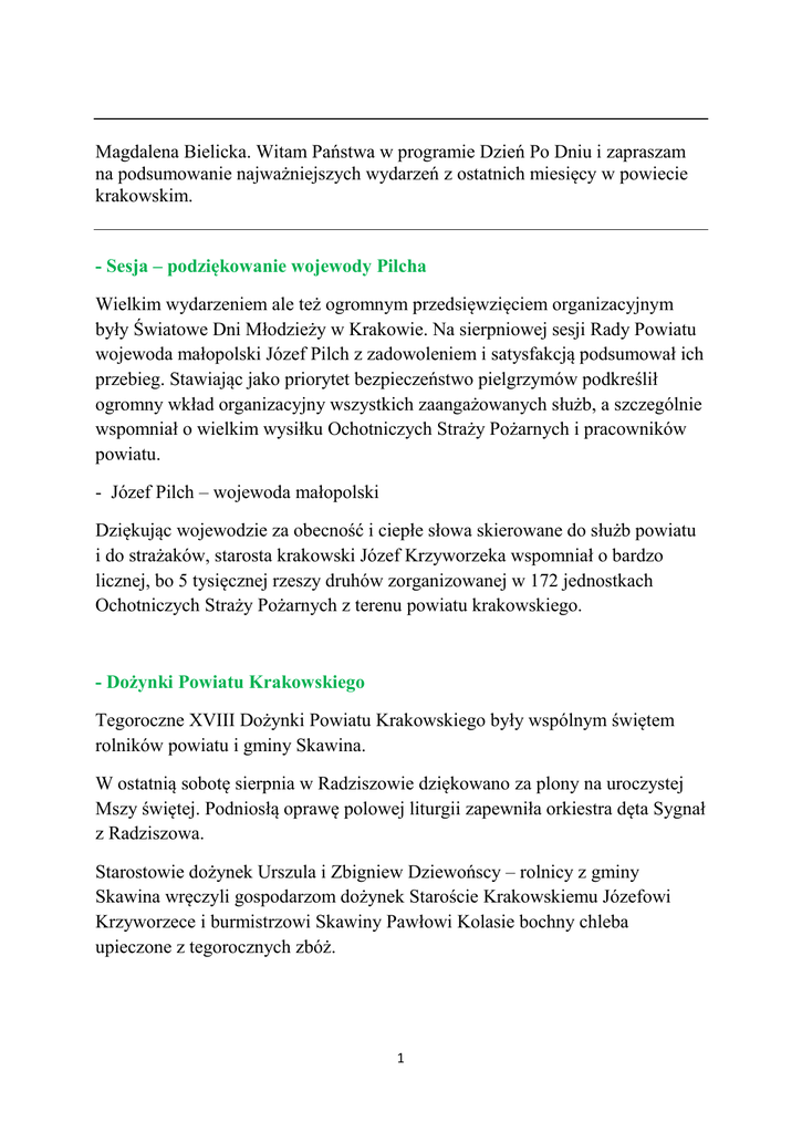 Magdalena Bielicka. Witam Państwa w programie Dzień Po Dniu i zapraszam na podsumowanie najważniejszych wydarzeń z ostatnich miesięcy w powiecie krakowskim. - Sesja – podziękowanie wojewody Pilcha Wielkim wydarzeniem ale też ogromnym przedsięwzięciem organizacyjnym były Światowe Dni Młodzieży w Krakowie. Na sierpniowej sesji Rady Powiatu wojewoda małopolski Józef Pilch z zadowoleniem i satysfakcją podsumował ich przebieg. Stawiając jako priorytet bezpieczeństwo pielgrzymów podkreślił ogromny wkład organizacyjny wszystkich zaangażowanych służb, a szczególnie wspomniał o wielkim wysiłku Ochotniczych Straży Pożarnych i pracowników powiatu. - Józef Pilch – wojewoda małopolski Dziękując wojewodzie za obecność i ciepłe słowa skierowane do służb powiatu i do strażaków, starosta krakowski Józef Krzyworzeka wspomniał o bardzo licznej, bo 5 tysięcznej rzeszy druhów zorganizowanej w 172 jednostkach Ochotniczych Straży Pożarnych z terenu powiatu krakowskiego. - Dożynki Powiatu Krakowskiego Tegoroczne XVIII Dożynki Powiatu Krakowskiego były wspólnym świętem rolników powiatu i gminy Skawina. W ostatnią sobotę sierpnia w Radziszowie dziękowano za plony na uroczystej Mszy świętej. Podniosłą oprawę polowej liturgii zapewniła orkiestra dęta Sygnał z Radziszowa. Starostowie dożynek Urszula i Zbigniew Dziewońscy – rolnicy z gminy Skawina wręczyli gospodarzom dożynek Staroście Krakowskiemu Józefowi Krzyworzece i burmistrzowi Skawiny Pawłowi Kolasie bochny chleba upieczone z tegorocznych zbóż. 1 Tradycyjnemu wręczaniu wieńców przygrywała Kapela Ludowa z Radziszowa. Przeprowadzono konkursy na najbardziej okazałe stoisko regionalne i najpiękniejszy wieniec dożynkowy. Dożynkom towarzyszyły liczne atrakcje: degustacje potraw kuchni regionalnych, zabawy dla dzieci, a wieczorem odbyła się huczna zabawa taneczna. ------------------------------------------------------------------------------- Zawody OSP w Rudawie, gm. Zabierzów W VIII Powiatowych Zawodach Sportowo-Pożarniczych Jednostek Ochotniczych Straży Pożarnych powiatu krakowskiego na stadionie sportowym Ludowego Klubu Sportowego „Orlęta Rudawa” w gminie Zabierzów zmagało się 10 drużyn żeńskich oraz 18 męskich. Druhowie konkurowali ze sobą w ćwiczeniach bojowych oraz w sztafecie pożarniczej. W kategorii drużyn żeńskich zwyciężyła Ochotnicza Straż Pożarna z Bębła. Najsprawniejsi spośród mężczyzn byli druhowie z Bosutowa z gminy Zielonki. Zwycięzcy będą reprezentować powiat krakowski w zawodach na szczeblu wojewódzkim. Najlepsze drużyny otrzymały puchary i nagrody pieniężne, a wszystkie drużyny, które brały udział w tegorocznych zawodach otrzymały pamiątkowe dyplomy. Zawody pod patronatem Starosty Krakowskiego zorganizowali: Zarząd Oddziału Powiatowego Związku Ochotniczych Straży Pożarnych RP, Komendant Miejski Państwowej Straży Pożarnej oraz Wójt Gminy Zabierzów. ------------------------------------------------------------------------------Święto Warzyw – Igołomia-Wawrzeńczyce Gmina Igołomia-Wawrzeńczyce wspierana przez Centrum Kultury i Promocji w Igołomi-Wawrzeńczycach zorganizowała po raz dziewiąty Małopolskie Święto Warzyw. Po rozpoczynających święto uroczystościach kościelnych i poświęceniu koszy z warzywami uczestnicy udali się na teren lotniska w Pobiedniku na dalsze świętowanie. 2 Tytułami Liderów Produkcji wyróżnieni zostali Bernadeta Paluch i Mariusz Tkaczyk. Otrzymali oni odznaki honorowe "Zasłużony dla Rolnictwa" od Ministra Rolnictwa i Rozwoju Wsi. Kulminacyjnym punktem oficjalnej imprezy było wręczanie koszy warzyw jako symbolu święta. Podczas warzywnej imprezy można było oglądać tańce i posłuchać przebojów muzyki biesiadnej, cygańskiej, góralskiej oraz tanecznej. Zorganizowano konkursy pod nazwą: „Z papryką na Ty”, "Estetyczna zagroda i posesja wiejska", "Największe warzywo". Na gości święta warzyw czekały różne atrakcje, m.in. Wesołe Miasteczko, stoiska degustacyjne Kół Gospodyń Wiejskich oraz sztandarowa potrawa regionalna Kociołek Warzywny. Odważniejsi mogli wziąć udział w lotach widokowych. Patronat nad świętem objęli: Minister Rolnictwa i Rozwoju Wsi Krzysztof Jurgiel, Wojewoda Małopolski Józef Pilch, Marszałek Województwa Małopolskiego Jacek Krupa i Starosta Krakowski Józef Krzyworzeka. ------------------------------------------------------------------------------- XI Powiatowy Przegląd Orkiestr Dętych w Zielonkach Piękna, słoneczna pogoda towarzyszyła niedzielnemu słuchaniu orkiestr biorących udział w XI Powiatowym Przeglądzie Orkiestr Dętych, który odbył się w Parku Wiejskim w Zielonkach. Przegląd nie jest konkursem - to pokaz dorobku artystycznego orkiestr działających na terenie Powiatu Krakowskiego. Każda z sześciu orkiestr zaprezentowała się indywidualnie na scenie wykonując po cztery utwory. Goście Przeglądu wysłuchali bogatego repertuaru opartego na popularnych melodiach, muzyce filmowej i tradycyjnych marszach. Niespodzianką był występ grupy cheerleaderek działającej przy Centrum Kultury, Promocji i Rekreacji w Zielonkach, które wystąpiły w rytm utworu „Go West” wykonanego przez orkiestrę z Zielonek. Zwieńczeniem przeglądu było wykonanie przez wszystkie zespoły trzech utworów pod batutą Stanisława Damiana. Wspólny koncert wszystkich orkiestr spotkał się z ogromnym aplauzem zgromadzonej publiczności. 3 Projekt został zrealizowany przez Stowarzyszenie Wspierania Rodziny i Społeczności Wiejskiej „Zachariasz” przy wsparciu finansowym Powiatu Krakowskiego. ------------------------------------------------------------------------------Turniej Rycerski na Zamku Tenczyn w Rudnie Od pięciu lat u podnóża zamku Tenczyn w Rudnie turyści i mieszkańcy gminy Krzeszowice obserwują zmagania rycerskie. W pierwszy weekend września w Turnieju Rycerskim o topór Andrzeja