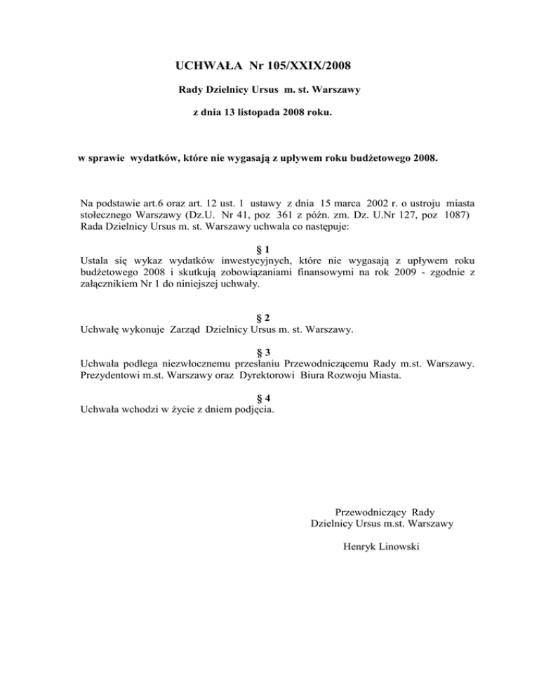 UCHWAŁA Nr 105/XXIX/2008 Rady Dzielnicy Ursus m. st. Warszawy z dnia 13 listopada 2008 roku. w sprawie wydatków, które nie wygasają z upływem roku budŜetowego 2008. Na podstawie art.6 oraz art. 12 ust. 1 ustawy z dnia 15 marca 2002 r. o ustroju miasta stołecznego Warszawy (Dz.U. Nr 41, poz 361 z późn. zm. Dz. U.Nr 127, poz 1087) Rada Dzielnicy Ursus m. st. Warszawy uchwala co następuje: §1 Ustala się wykaz wydatków inwestycyjnych, które nie wygasają z upływem roku budŜetowego 2008 i skutkują zobowiązaniami finansowymi na rok 2009 - zgodnie z załącznikiem Nr 1 do niniejszej uchwały. §2 Uchwałę wykonuje Zarząd Dzielnicy Ursus m. st. Warszawy. §3 Uchwała podlega niezwłocznemu przesłaniu Przewodniczącemu Rady m.st. Warszawy. Prezydentowi m.st. Warszawy oraz Dyrektorowi Biura Rozwoju Miasta. §4 Uchwała wchodzi w Ŝycie z dniem podjęcia. Przewodniczący Rady Dzielnicy Ursus m.st. Warszawy Henryk Linowski Załącznik nr 1 do Uchwały Nr 105/XXIX/2008 Rady Dzielnicy Ursus m.st. Warszawy z dnia 13 listopada 2008 roku. Wykaz i plan finansowy wydatków, które nie wygasają z upływem roku 2008 Lp. Nazwa zadania Klasyfikacja budŜetowa dział rozdział 1 1 2 Przebudowa skrzyŜowania ulic Lalki, Jagiełły, Balickiej wraz z odwodnieniem (budowa kanalizacji deszczowej w ul. Jagiełły na odcinku LalkiWojciechowskiego) 3 600 4 60014 2 Budowa budynku komunalnego przy ul. Rakuszanki wraz z przedszkolem w parterze 700 70005 3 Zakup Nieruchomości przy ul. Prawniczej 54 na cele rehabilitacyjne 852 85203 Kwota w zł Uzasadnienie (informacja o zawartych umowach, rozstrzygniętych przetargach oraz inne istotne dane 5 6 W bieŜącym roku rozstrzygnięto postępowania przetargowe na dwuetapowe wykonanie przebudowy przedmiotowego skrzyŜowania. Dnia 27.10.2008 r. podpisano umowę na wykonanie I etapu, który obejmuje budowę kanalizacji deszczowej w ulicy Jagiełły na odcinku Lalki - Wojciechowskiego. Natomiast dnia 07.11.2008 r. podpisana została umowa na II etap, obejmujący przebudowę w zakresie: branŜy drogowej, oświetlenia,sieci elektroenergetycznej 1 380 152 i telekomunikacyjnej. W chwili obecnej trwają procedury związane z zatwierdzeniem projektu organizacji ruchu na czas trwania prac budowlanych. PrzedłuŜające się uzgodnienia u Inzyniera Ruchu dla m.st. Warszawy powodują opóźnienie w rozpoczęciu prac. W związku z powyŜszym istnieje ryzyko, Ŝe środki finansowe przeznaczone na ten rok mogą nie zostać wydatkowane zgodnie z obowiązującym planem inwestycyjnym Dzielnicy Ursus, a zatem zobowiązania finansowe mogą skutkować w przyszłym roku budŜetowym. W dniu 17.04.2008 r. podpisano umowę z Wykonawcą, na opracowanie dokumentacji projektowej budowy budynku komunalnego przy ul. Rakuszanki w Warszawie. Ze względu na brak jednoznacznej opinii Państwowego Powiatowego Inspektora Sanitarnego i koniecznością wystąpienia o opinię do 259 403 Głównego Inspektora Sanitarnego wydłuŜa się czas uzyskania decyzji o warunkach zabudowy, a co za tym idzie istnieje ryzyko nie oddania projektu w terminie. W związku z powyŜszym środki finansowe przeznaczone na ten rok mogą nie zostać wydatkowane zgodnie z obowiązującym planem inwestycyjnym Dzielnicy Ursus. W ramach wnioskowanej kwoty planowany jest zakup nieruchomości przy ul. Prawniczej 54, której wartość określono na kwotę 2.700.000 zł. W związku z przesunięciem terminu podpisania aktu notarialnego kupna zabudowanej nieruchomości o pow. 1449 m. kw. przy ul. Prawniczej 54 w Warszawie, stanowiącej własność Kongregacji Sióstr Szpitalnych od Najświętszego Serca Jezusa przez przedstawicieli m.st. Warszawy, istnieje duŜe 2 700 000 prawdopodobieństwo realizacji transakcji zakupu dopiero na początku 2009 roku. Przedstawiciele Kongregacji nie dostarczyli na dzień 07.11.2008 roku niezbędnych dokumentów potwierdzających prawo przystąpienia do aktu. W związku z powyŜszym środki finansowe przeznaczone na ten rok mogą nie zostać wydatkowane zgodnie z obowiązującym planem inwestycyjnym Dzielnicy Ursus. Razem: 4 339 555 ………………………………………………….. Burmistrz Dzielnicy Ursus m.st. Warszawy