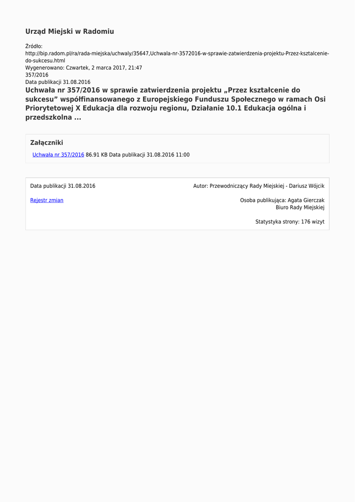 Urząd Miejski w Radomiu Źródło: http://bip.radom.pl/ra/rada-miejska/uchwaly/35647,Uchwala-nr-3572016-w-sprawie-zatwierdzenia-projektu-Przez-ksztalceniedo-sukcesu.html Wygenerowano: Czwartek, 2 marca 2017, 21:47 357/2016 Data publikacji 31.08.2016 Uchwała nr 357/2016 w sprawie zatwierdzenia projektu „Przez kształcenie do sukcesu” współfinansowanego z Europejskiego Funduszu Społecznego w ramach Osi Priorytetowej X Edukacja dla rozwoju regionu, Działanie 10.1 Edukacja ogólna i przedszkolna ... Załączniki Uchwała nr 357/2016 86.91 KB Data publikacji 31.08.2016 11:00 Data publikacji 31.08.2016 Rejestr zmian Autor: Przewodniczący Rady Miejskiej - Dariusz Wójcik Osoba publikująca: Agata Gierczak Biuro Rady Miejskiej Statystyka strony: 176 wizyt