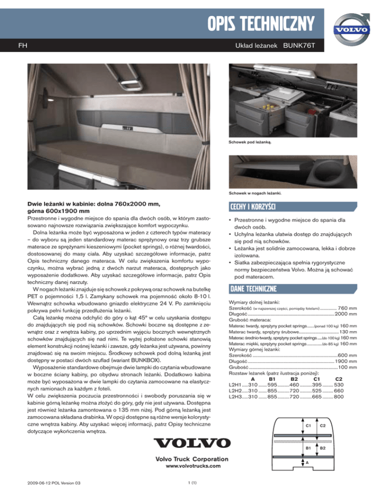 OPIS TECHNICZNY Układ leżanek BUNK76T FH Schowek pod leżanką. Schowek w nogach leżanki. Dwie leżanki w kabinie: dolna 760x2000 mm, górna 600x1900 mm Cechy i korzyści Przestronne i wygodne miejsce do spania dla dwóch osób, w którym zastosowano najnowsze rozwiązania zwiększające komfort wypoczynku. Dolna leżanka może być wyposażona w jeden z czterech typów materacy – do wyboru są jeden standardowy materac sprężynowy oraz trzy grubsze materace ze sprężynami kieszeniowymi (pocket springs), o różnej twardości, dostosowanej do masy ciała. Aby uzyskać szczegółowe informacje, patrz Opis techniczny danego materaca. W celu zwiększenia komfortu wypoczynku, można wybrać jedną z dwóch narzut materaca, dostępnych jako wyposażenie dodatkowe. Aby uzyskać szczegółowe informacje, patrz Opis techniczny danej narzuty. W nogach leżanki znajduje się schowek z pokrywą oraz schowek na butelkę PET o pojemności 1,5 l. Zamykany schowek ma pojemność około 8-10 l. Wewnątrz schowka wbudowano gniazdo elektryczne 24 V. Po zamknięciu pokrywa pełni funkcję przedłużenia leżanki. Całą leżankę można odchylić do góry o kąt 45° w celu uzyskania dostępu do znajdujących się pod nią schowków. Schowki boczne są dostępne z zewnątrz oraz z wnętrza kabiny, po uprzednim wyjęciu bocznych wewnętrznych schowków znajdujących się nad nimi. Te wyżej położone schowki stanowią element konstrukcji nośnej leżanki i zawsze, gdy leżanka jest używana, powinny znajdować się na swoim miejscu. Środkowy schowek pod dolną leżanką jest dostępny w postaci dwóch szuflad (wariant BUNKBOX). Wyposażenie standardowe obejmuje dwie lampki do czytania wbudowane w boczne ściany kabiny, po obydwu stronach leżanki. Dodatkowo kabina może być wyposażona w dwie lampki do czytania zamocowane na elastycznych ramionach za każdym z foteli. W celu zwiększenia poczucia przestronności i swobody poruszania się w kabinie górną leżankę można złożyć do góry, gdy nie jest używana. Dostępna jest również leżanka zamontowana o 135 mm niżej. Pod górną leżanką jest zamocowana składana drabinka. W opcji dostępne są różne wersje kolorystyczne wnętrza kabiny. Aby uzyskać więcej informacji, patrz Opisy techniczne dotyczące wykończenia wnętrza. • Przestronne i wygodne miejsce do spania dla dwóch osób. • Uchylna leżanka ułatwia dostęp do znajdujących się pod nią schowków. • Leżanka jest solidnie zamocowana, lekka i dobrze izolowana. • Siatka zabezpieczająca spełnia rygorystyczne normy bezpieczeństwa Volvo. Można ją schować pod materacem. DANE TECHNICZNE Wymiary dolnej leżanki: Szerokość (w najszerszej części, pomiędzy fotelami). ............. 760 mm Długość..........................................................................2000 mm Grubość materaca: Materac twardy, sprężyny pocket springs........(ponad 100 kg) 160 mm Materac twardy, sprężyny śrubowe..................................... 130 mm Materac średnio-twardy, sprężyny pocket springs......(do 100 kg) 160 mm Materac miękki, sprężyny pocket springs................(do 85 kg) 160 mm Wymiary górnej leżanki: Szerokość.........................................................................600 mm Długość.......................................................................... 1900 mm Grubość............................................................................100 mm Rozstaw leżanek (patrz ilustracja poniżej): A B1 B2 C1 C2 L2H1......310........ 595...........460...........395.......... 530 L2H2......310........ 855...........720...........525.......... 660 L2H3......310........ 855...........720...........665.......... 800 C1 C2 B1 B2 A 2009-06-12 POL Version 03 1 (1)