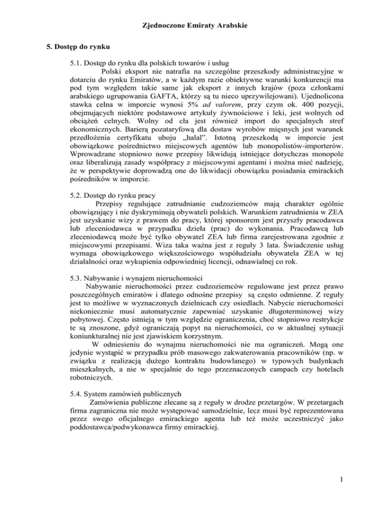Zjednoczone Emiraty Arabskie 5. Dostęp do rynku 5.1. Dostęp do rynku dla polskich towarów i usług Polski eksport nie natrafia na szczególne przeszkody administracyjne w dotarciu do rynku Emiratów, a w kaŜdym razie obiektywne warunki konkurencji ma pod tym względem takie same jak eksport z innych krajów (poza członkami arabskiego ugrupowania GAFTA, którzy są tu nieco uprzywilejowani). Ujednolicona stawka celna w imporcie wynosi 5% ad valorem, przy czym ok. 400 pozycji, obejmujących niektóre podstawowe artykuły Ŝywnościowe i leki, jest wolnych od obciąŜeń celnych. Wolny od cła jest równieŜ import do specjalnych stref ekonomicznych. Barierą pozataryfową dla dostaw wyrobów mięsnych jest warunek przedłoŜenia certyfikatu uboju „halal”. Istotną przeszkodą w imporcie jest obowiązkowe pośrednictwo miejscowych agentów lub monopolistów-importerów. Wprowadzane stopniowo nowe przepisy likwidują istniejące dotychczas monopole oraz liberalizują zasady współpracy z miejscowymi agentami i moŜna mieć nadzieję, Ŝe w perspektywie doprowadzą one do likwidacji obowiązku posiadania emirackich pośredników w imporcie. 5.2. Dostęp do rynku pracy Przepisy regulujące zatrudnianie cudzoziemców mają charakter ogólnie obowiązujący i nie dyskryminują obywateli polskich. Warunkiem zatrudnienia w ZEA jest uzyskanie wizy z prawem do pracy, której sponsorem jest przyszły pracodawca lub zleceniodawca w przypadku dzieła (prac) do wykonania. Pracodawcą lub zleceniodawcą moŜe być tylko obywatel ZEA lub firma zarejestrowana zgodnie z miejscowymi przepisami. Wiza taka waŜna jest z reguły 3 lata. Świadczenie usług wymaga obowiązkowego większościowego współudziału obywatela ZEA w tej działalności oraz wykupienia odpowiedniej licencji, odnawialnej co rok. 5.3. Nabywanie i wynajem nieruchomości Nabywanie nieruchomości przez cudzoziemców regulowane jest przez prawo poszczególnych emiratów i dlatego odnośne przepisy są często odmienne. Z reguły jest to moŜliwe w wyznaczonych dzielnicach czy osiedlach. Nabycie nieruchomości niekoniecznie musi automatycznie zapewniać uzyskanie długoterminowej wizy pobytowej. Często istnieją w tym względzie ograniczenia, choć stopniowo restrykcje te są znoszone, gdyŜ ograniczają popyt na nieruchomości, co w aktualnej sytuacji koniunkturalnej nie jest zjawiskiem korzystnym. W odniesieniu do wynajmu nieruchomości nie ma ograniczeń. Mogą one jedynie wystąpić w przypadku prób masowego zakwaterowania pracowników (np. w związku z realizacją duŜego kontraktu budowlanego) w typowych budynkach mieszkalnych, a nie w specjalnie do tego przeznaczonych campach czy hotelach robotniczych. 5.4. System zamówień publicznych Zamówienia publiczne zlecane są z reguły w drodze przetargów. W przetargach firma zagraniczna nie moŜe występować samodzielnie, lecz musi być reprezentowana przez swego oficjalnego emirackiego agenta lub teŜ moŜe uczestniczyć jako poddostawca/podwykonawca firmy emirackiej. 1