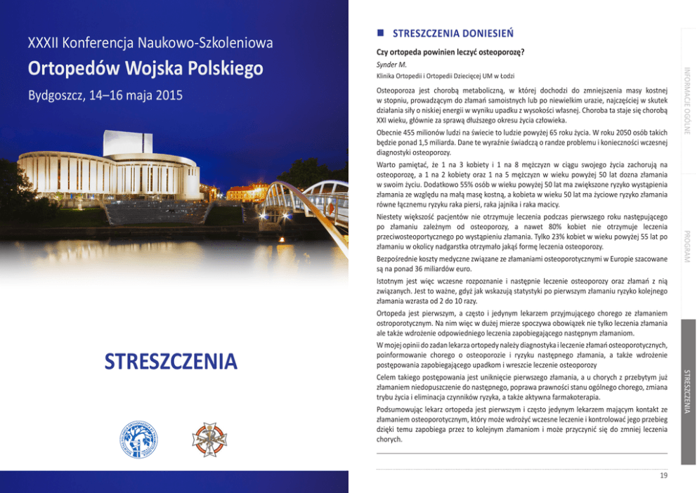 XXXII Konferencja Naukowo-Szkoleniowa Bydgoszcz, 14–16 maja 2015 Synder M. Klinika Ortopedii i Ortopedii Dziecięcej UM w Łodzi 19 STRESZCZENIA Osteoporoza jest chorobą metaboliczną, w której dochodzi do zmniejszenia masy kostnej w stopniu, prowadzącym do złamań samoistnych lub po niewielkim urazie, najczęściej w skutek działania siły o niskiej energii w wyniku upadku z wysokości własnej. Choroba ta staje się chorobą XXI wieku, głównie za sprawą dłuższego okresu życia człowieka. Obecnie 455 milionów ludzi na świecie to ludzie powyżej 65 roku życia. W roku 2050 osób takich będzie ponad 1,5 miliarda. Dane te wyraźnie świadczą o randze problemu i konieczności wczesnej diagnostyki osteoporozy. Warto pamiętać, że 1 na 3 kobiety i 1 na 8 mężczyzn w ciągu swojego życia zachorują na osteoporozę, a 1 na 2 kobiety oraz 1 na 5 mężczyzn w wieku powyżej 50 lat dozna złamania w swoim życiu. Dodatkowo 55% osób w wieku powyżej 50 lat ma zwiększone ryzyko wystąpienia złamania ze względu na małą masę kostną, a kobieta w wieku 50 lat ma życiowe ryzyko złamania równe łącznemu ryzyku raka piersi, raka jajnika i raka macicy. Niestety większość pacjentów nie otrzymuje leczenia podczas pierwszego roku następującego po złamaniu zależnym od osteoporozy, a nawet 80% kobiet nie otrzymuje leczenia przeciwosteoportycznego po wystąpieniu złamania. Tylko 23% kobiet w wieku powyżej 55 lat po złamaniu w okolicy nadgarstka otrzymało jakąś formę leczenia osteoporozy. Bezpośrednie koszty medyczne związane ze złamaniami osteoporotycznymi w Europie szacowane są na ponad 36 miliardów euro. Istotnym jest więc wczesne rozpoznanie i następnie leczenie osteoporozy oraz złamań z nią związanych. Jest to ważne, gdyż jak wskazują statystyki po pierwszym złamaniu ryzyko kolejnego złamania wzrasta od 2 do 10 razy. Ortopeda jest pierwszym, a często i jedynym lekarzem przyjmującego chorego ze złamaniem ostroporotycznym. Na nim więc w dużej mierze spoczywa obowiązek nie tylko leczenia złamania ale także wdrożenie odpowiedniego leczenia zapobiegającego następnym złamaniom. W mojej opinii do zadan lekarza ortopedy należy diagnostyka i leczenie złamań osteoporotycznych, poinformowanie chorego o osteoporozie i ryzyku następnego złamania, a także wdrożenie postępowania zapobiegającego upadkom i wreszcie leczenie osteoporozy Celem takiego postępowania jest uniknięcie pierwszego złamania, a u chorych z przebytym już złamaniem niedopuszczenie do następnego, poprawa prawności stanu ogólnego chorego, zmiana trybu życia i eliminacja czynników ryzyka, a także aktywna farmakoterapia. Podsumowując lekarz ortopeda jest pierwszym i często jedynym lekarzem mającym kontakt ze złamaniem osteoporotycznym, który może wdrożyć wczesne leczenie i kontrolować jego przebieg dzięki temu zapobiega przez to kolejnym złamaniom i może przyczynić się do zmniej leczenia chorych. PROGRAM STRESZCZENIA Czy ortopeda powinien leczyć osteoporozę? INFORMACJE OGÓLNE Ortopedów Wojska Polskiego n STRESZCZENIA DONIESIEŃ System zapobiegania złamaniom w Polsce Współczesne możliwości leczenia złamań osteoporotycznych Czerwiński E. , Amarowicz J. Dudko S., Kusz D., Wojciechowski P., Kopeć K., Mierzwiński M. 1,2 1 INFORMACJE OGÓLNE PROGRAM Prezentacja przypadków osteoporozy pomenopauzalnej leczonych Denosumabem Oddział Chirurgii Urazowej i Ortopedycznej 7 Szpitala Marynarki Wojennej w Gdańsku W pracy omówiono kwalifikacje do leczenie Denosumabem osteoporozy pomenopauzalnej u kobiet spełniających kryteria refundacji obowiązujące od maja 2012 r. do sierpnia 2014 r., kiedy wprowadzono rozszerzone wskazania refundacyjne. Przedstawiono korzyści leczenia w postaci: 1. Niewystąpienia nowych złamań. 2. Stabilizacji w badaniach densytometrycznych. 3. Poprawę, bądź utrzymanie sprawności ruchowej i samoobsługi. 4. Brak objawów nietolerancji leczenia. 20 Złamania nasady dalszej kości promieniowej – wpływ sposobu zaopatrzenia na uzyskane wyniki ze szczególnym uwzględnieniem osteoporozy Jarowicz T., Wodzisławski W., Śliwowski J., Nowak T. Klinika Ortopedii i Traumatologii Narządu Ruchu 4 Wojskowego Szpitala Klinicznego z Polikliniką we Wrocławiu Złamania nasady dalszej kości promieniowej są najczęstszymi złamaniami z jakimi spotyka się ortopeda–traumatolog w codziennej praktyce. Zdarzają się najczęściej w 3 grupach wiekowych: u dzieci i młodzieży; młodych dorosłych — złamania wysokoenergetyczne i u osób starszych, zwłaszcza kobiet po 60. roku życia — złamania niskoenergetyczne na tle osteoporozy. Ze względu na niejednokrotnie skomplikowany charakter stanowią one nadal poważne wyzwanie. W starzejącym się społeczeństwie należy upatrywać narastania skali problemu. W latach 2002–2013 w naszej Klinice wykonaliśmy 159 repozycji i stabilizacji złamania nasady dalszej kości 21 STRESZCZENIA STRESZCZENIA Gawlikowski J. Cel. Przedstawienie uwag na temat współczesnych możliwości leczenia złamań osteoporotycznych (ZO). Materiał. Chorzy leczeni z powodu ZO w latach 2005–2014. Metody. Analiza dokumentacji medycznej uwzględniająca etiologię, lokalizację i sposoby leczenia. Wyniki. Wydzielono grupy chorych operowanych z powodu ZO: kobiety w wieku powyżej 65 lat, leczeni przewlekle doustnymi lekami przeciwzakrzepowymi (schorzenia kardiologiczne, choroby naczyń tętniczych, żylnych, dializowani), RZS (NLPZ, przewlekłe stosowanie leków sterydowych, leki cytostatyczne, obniżona aktywność ruchowa), przewlekłe niedożywienie (alkoholizm, choroby przewodu pokarmowego). Typowe lokalizacje ZO: trzony kręgów piersiowych i lędźwiowych, dalszy koniec kości promieniowej, bliższy koniec kości udowej, bliższy koniec kości ramiennej, okołoprotezowe ZO po aloplastyce stawu biodrowego i kolanowego. Techniki operacyjne w ZO: 1) szyjki kości udowej – aloplastyka (całkowita cemento