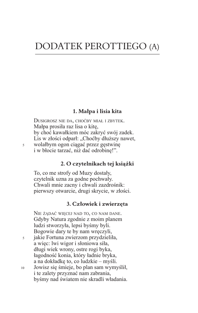 DODATEK PEROTTIEGO (A) 1. Małpa i lisia kita Dusigrosz nie da, choćby miał i zbytek. Małpa prosiła raz lisa o kitę, by choć kawałkiem móc zakryć swój zadek. Lis w złości odparł: „Choćby dłuższy nawet, 5 wolałbym ogon ciągać przez gęstwinę i w błocie tarzać, niż dać odrobinę!”. 2. O czytelnikach tej książki To, co me strofy od Muzy dostały, czytelnik uzna za godne pochwały. Chwali mnie zacny i chwali zazdrośnik: pierwszy otwarcie, drugi skrycie, w złości. 3. Człowiek i zwierzęta Nie żądać więcej nad to, co nam dane. Gdyby Natura zgodnie z moim planem ludzi stworzyła, lepsi byśmy byli. Bogowie dary te by nam wręczyli, 5 jakie Fortuna zwierzom przydzieliła, a więc: lwi wigor i słoniowa siła, długi wiek wrony, ostre rogi byka, łagodność konia, który ładnie bryka, a na dokładkę to, co ludzkie ‒ myśli. 10 Jowisz się śmieje, bo plan sam wymyślił, i te zalety przyznać nam zabrania, byśmy nad światem nie skradli władania. 110 Fedrus Bajki Tak się musimy cieszyć tym, co mamy, wraz z krótkim czasem na ziemi nam danym 15 i tylko tego możemy się tykać, na co zezwala nam los śmiertelnika. 4. Merkury i życzenia kobiet Tych samych rzeczy tyczy przykład wtóry. Gdy u dwóch kobiet gościł bóg Merkury, panie mu dały kwaterę dość kiepską: pierwsza w kołysce usypiała dziecko, 5 druga dla zysku sprzedawała ciało. Nie chciał odpłacić im za trud zbyt mało, rzekł więc na koniec, stojąc już w drzwi progu: „Wszystko, co chcecie, bom jest jednym z bogów, zaraz wam spełnię!”. Matka więc zaklina, 10 by jak najprędzej z brodą ujrzeć syna; drugiej niech wszystko lepi się do ręki. Bóg znika, wchodzą do domu panienki: niemowlę płacze, na twarzy ma bródkę, co rozbawiło strasznie prostytutkę, 15 tak że ze śmiechu gile z nosa lecą, smarków dotyka więc rączką kobiecą. Aż do podłogi śluz nią wyciągała ‒ tak, wcześniej szydząc, też śmieszną się stała. 5. Prawda i kłamstwo Wiersz chcę o prawdzie i kłamstwie ułożyć. Gdy Prometeusz nową erę stworzył, starannie Prawdę tak z gliny zagniatał, by stanowiła zbiory praw dla świata. 5 Jowisz go wzywa, więc na moment znika. Warsztat zostawił w rękach czeladnika, którego świeżo przyjął do roboty… a był nim Podstęp. Ten, pełen ochoty, swą wprawną ręką tworzy dzieło, które 10 twarz ma tę samą, członki i figurę. Czasu zabrakło, by ulepić całość: nóg nie mógł skończyć – miał gliny za mało. Mistrz szybko wraca, więc Podstęp ‒ jak trusia ‒ z trwogi na własnym miejscu zaraz usiadł. 20 15 Dodatek Perottiego (A) 3,13–7 111 Rzeźbiarz się dziwi statuom bliźniaczym, a że końcowy efekt chciał zobaczyć, oba posągi każe kłaść do pieca, w gotowych ducha zaś tchnieniem roznieca. Prawda wnet kroki robi całkiem duże, kaleka stoi, bo brak jej wszak nóżek. Fałszywą kopię, co złej pracy skutkiem, Kłamstwem nazwano, bo nogi ma krótkie. Ten opis kłamstwa to mądrość nienowa, ja zaś popieram mądre ludzi słowa. 6. Ułomność Udawać słabość nigdy nie zaszkodzi, lecz prawda na jaw zazwyczaj wychodzi. 7. Kary Hadesu Nie patrz na słowa, lecz szukaj znaczenia. Iksjon się kręci na kole w Podziemiach. Co to oznacza? ‒ Tak się Los obraca. Syzyfa kara to okropna praca: 5 musi on taszczyć na szczyt kamień, który pomimo trudu znów stacza się z góry ‒ znak to, że męka końca nigdy nie ma. Tantal zaś stoi i kona z pragnienia pośrodku rzeki ‒ to jest skąpca wzorzec, 10 który ma skarby, lecz ich tknąć nie może. Po wodę chodzą Danaosa córy, lecz im wycieka z dzbanów ciecz przez dziury ‒ zginie grosz, który na zbytek wydałeś. Dziewięć hektarów125 Tityjos swym ciałem 15 pokrył w Hadesie, a jego wątroba odrasta, kiedy przyjdzie nowa doba ‒ zrozumieć dobrze musisz taką karę: przybywa zmartwień z każdym ziem hektarem. Tak właśnie skryto nauki wśród słówek, 20 by mądry pojął, ale nie półgłówek. 125 Dziewięć hektarów (novem… iugera) ‒ w oryginale odwołanie do rzymskiej miary powierzchni: iugerum. Obejmowała ona obszar ziemi, który można było zaorać w ciągu jednego dnia parą wołów (iugum ‒ ‘jarzmo’). Wynosił 240 x 120 stóp rzymskich, czyli 28 800 stóp kwadratowych (tj. ok. 2523 m2). 112 Fedrus Bajki 8. Wyrocznia delficka126 Tak o wyroczni bajka opowiada: Powiedz, Apollo, co się ludziom nada; ty na Parnasie i w Delfach też mieszkasz.127 Trzęsą się laury, już dygocze wieszczka, 5 już drżą trójnogi, już dudni w świątyni, światło dnia blednie. Kto te cuda czyni? Pytia128 pod wpływem bóstwa głos zabiera: „Słów boga z Delos129 wysłuchajcie teraz! Bądźcie pobożni, dotrzymujcie słowa, 10 każdy niech bliskich i swój kraj uchowa i niechaj mieczem się z wrogiem rozprawi! Bądźcie pomocni, dla biednych łaskawi, dobrym odpłaćcie, zwalczajcie szalbierzy, karzcie bezbożnych! Zło pomścić należy, 15 jak i kalanie łoża małżeńskiego! Nie wierz nikomu! Wystrzegaj się złego!”. Mówiąc te słowa, w szał wpada dziewczyna ‒ wie, że na próżno ludzkość upomina. 126 Wyrocznia delficka (De oraculo Apollinis) – słynna i prastara wyrocznia, którą starożytni uważali za centrum zamieszkanego świata, bo kiedy Zeus, król bogów, wypuś cił dwa orły na dwóch jego krańcach, spotkały się one właśnie w Delfach, w ten sposób wyznaczając środek ziemi. Pierwszym mieszkańcem Delf była smoczyca Pytho, potomstwo Gai, mityczny latający wąż, który posiadał dar jasnowidzenia (zresztą wcześniej Delfy zwały się Pytho). Wedle jednej z wersji mitu została wysłana przez Herę, by zabić jej rywalkę o względy Zeusa – Leto (łac. Latona), ale przyszło jej zapłacić za tę misję śmiercią, Leto urodziła bowiem Artemidę i Apollona, który zabił Pytho za atak na matkę. Krew potwora wsiąkła w delficką ziemię, naznaczając ją jako miejsce przyszłej wyroczni. 127 Apollo (Ph