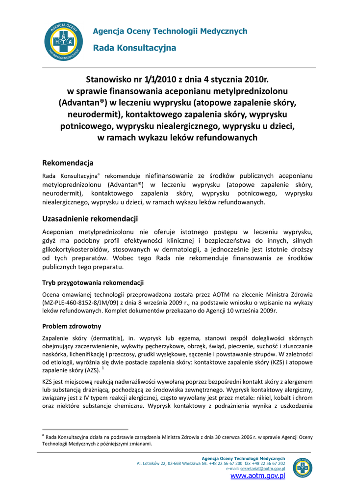 Agencja Oceny Technologii Medycznych Rada Konsultacyjna Stanowisko nr 1/1/2010 z dnia 4 stycznia 2010r. w sprawie finansowania aceponianu metylprednizolonu (Advantan®) w leczeniu wyprysku (atopowe zapalenie skóry, neurodermit), kontaktowego zapalenia skóry, wyprysku potnicowego, wyprysku niealergicznego, wyprysku u dzieci, w ramach wykazu leków refundowanych Rekomendacja Rada Konsultacyjnaa rekomenduje niefinansowanie ze środków publicznych aceponianu metyloprednizolonu (Advantan®) w leczeniu wyprysku (atopowe zapalenie skóry, neurodermit), kontaktowego zapalenia skóry, wyprysku potnicowego, wyprysku niealergicznego, wyprysku u dzieci, w ramach wykazu leków refundowanych. Uzasadnienie rekomendacji Aceponian metylprednizolonu nie oferuje istotnego postępu w leczeniu wyprysku, gdyż ma podobny profil efektywności klinicznej i bezpieczeństwa do innych, silnych glikokortykosteroidów, stosowanych w dermatologii, a jednocześnie jest istotnie droższy od tych preparatów. Wobec tego Rada nie rekomenduje finansowania ze środków publicznych tego preparatu. Tryb przygotowania rekomendacji Ocena omawianej technologii przeprowadzona została przez AOTM na zlecenie Ministra Zdrowia (MZ-PLE-460-8152-8/JM/09) z dnia 8 września 2009 r., na podstawie wniosku o wpisanie na wykazy leków refundowanych. Komplet dokumentów przekazano do Agencji 10 września 2009r. Problem zdrowotny Zapalenie skóry (dermatitis), in. wyprysk lub egzema, stanowi zespół dolegliwości skórnych obejmujący zaczerwienienie, wykwity pęcherzykowe, obrzęk, świąd, pieczenie, suchość i złuszczanie naskórka, lichenifikację i przeczosy, grudki wysiękowe, sączenie i powstawanie strupów. W zależności od etiologii, wyróżnia się dwie postacie zapalenia skóry: kontaktowe zapalenie skóry (KZS) i atopowe zapalenie skóry (AZS). 1 KZS jest miejscową reakcją nadwrażliwości wywołaną poprzez bezpośredni kontakt skóry z alergenem lub substancją drażniącą, pochodzącą ze środowiska zewnętrznego. Wyprysk kontaktowy alergiczny, związany jest z IV typem reakcji alergicznej, często wywołany jest przez metale: nikiel, kobalt i chrom oraz niektóre substancje chemiczne. Wyprysk kontaktowy z podrażnienia wynika z uszkodzenia a Rada Konsultacyjna działa na podstawie zarządzenia Ministra Zdrowia z dnia 30 czerwca 2006 r. w sprawie Agencji Oceny Technologii Medycznych z późniejszymi zmianami. Agencja Oceny Technologii Medycznych Al. Lotników 22, 02-668 Warszawa tel. +48 22 56 67 200 fax +48 22 56 67 202 e-mail: [email protected] www.aotm.gov.pl Stanowisko Rady Konsultacyjnej AOTM 1/1/2010 z dnia 4 stycznia 2010r. warstwy rogowej skóry w wyniku ekspozycji na stężoną substancję drażniącą lub długotrwałego narażenia na małe dawki. 1 AZS jest to zespół zmian zapalnych skóry, związanych z defektem bariery skórnej i nadwrażliwością miejscową. Choroba charakteryzuje się zmianami wypryskowymi z wybitnie nasilonym świądem i lichenizacją. Etiologia i patogeneza są nie wyjaśnione. Podkreśla się rolę czynników genetycznych, atopii i zaburzenia mechanizmów odpornościowych skóry. AZS często współistnieje z alergicznym nieżytem nosa i astmą, co sugeruje mechanizm zależny od przeciwciał IgE. 1 KZS występuje u ok. 1-3% populacji, natomiast AZS dotyka ok. 20% populacji pediatrycznej i 1-3% populacji dorosłej. Ostatnimi czasy obserwuje się wzrost zapadalności na choroby alergiczne skóry. 2 Obecna standardowa terapia Postawą terapii AZS i KZS jest miejscowe stosowanie emolientów, jako preparatów leczniczo-pielęgnacyjnych, oraz preparatów glikokortykosteroidów lub inhibitorów kalcyneuryny. 3 W razie nieskuteczności standardowego leczenia miejscowego, można zastosować fototerapię (PUVA) lub leczenie ogólne: doustne preparaty glikokortykosteroidów lub leki przeciwhistaminowe. W wybranych, ciężkich przypadkach stosuje się leczenie immunosupresyjne: cyklosporynę, metotreksat. 3 Proponowana terapia Aceponian metyloprednizolonu jest syntetycznym kortykosteroidem o silnym działaniu. Stosowany miejscowo wykazuje działanie przeciwzapalne i przeciwświądowe, a także obkurczające naczynia krwionośne. Po podaniu na skórę, stężenie aceponianu metyloprednizolonu jest największe w naskórku i skórze właściwej. W naskórku i skórze właściwej aceponian metyloprednizolonu jest metabolizowany w wyniku hydrolizy do głównego metabolitu 17-propionianu 6α-metylprednizolonu, który ma większe powinowactwo do wewnątrzkomórkowych receptorów glikokortykosteroidowych. 4 Aceponian metyloprednizolonu zarejestrowany jest w leczeniu wyprysku (atopowe zapalenie skóry, neurodermit), kontaktowego zapalenia skóry, wyprysku potnicowego, wyprysku niealergicznego, oraz wyprysku u dzieci. Wskazania wnioskowane pokrywają się z rejestracyjnymi. 4, 5 Aceponian metyloprednizolonu, zarówno w postaci kremu, maści, jak i emulsji nanosi się cienką warstwą na chorobowo zmienioną skórę raz na dobę. Leku nie należy stosować u dorosłych dłużej niż przez 12 tygodni, a u dzieci nie dłużej niż przez 4 tygodnie. 4 Aceponian metyloprednizolonu jest przeciwwskazany do stosowania w ciąży. Nie należy go też stosować w przypadkach bakteryjnej, grzybiczej lub wirusowej etiologii zmian skórnych. 4 Skuteczność proponowanej terapii Przedstawione dowody naukowe, w postaci mało wiarygodnych badań RCT, porównywały aceponian metyloprednizolonu do innych silnych glikokortykosteroidów stosowanych w AZS lub KZS: dipropionianu betametazonu i furoinianu mometazonu. Analizowano zmianę rozległości oraz nasilenia zmian skórnych i nie uzyskano istotnej różnicy w żadnym z obserwowanych punktów końcowych, w porównaniu do obu konkurencyjnych preparatów. 5 Analizę efektywności klinicznej uzupełniono wynikami badań obserwacyjnych bez grupy kontrolnej, które nie wniosły nowych, istotnych informacji. 5 Zdaniem eksperta klinicznego, nie ma dowodów na przewagę jed