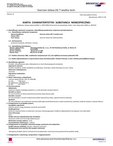 Brenntag Polska Sp. z o.o. ul. J. Bema 21, 47-224 Kędzierzyn-Koźle tel (48/77) 4721500, fax (48/77) 4721600 Siarczan żelaza (II) 7-wodny tech. Wersja: III Data sporządzenia karty: __________ Aktualizacja: 2010-11-30 KARTA CHARAKTERYSTYKI SUBSTANCJI NIEBEZPIECZNEJ (podstawa: Rozporządzenie(WE) nr 1907/2006 Parlamentu Europejskiegi i Rady z dnia 18 grudnia 2006 ws. REACH) 1. Identyfikacja substancji / preparatu. Identyfikacja producenta, importera lub dystrybutora. 1.1. Identyfikacja substancji / preparatu. Nazwa handlowa: Siarczan żelaza (II) 7-wodny tech. Nazwa INCI: Inne nazwy: siarczan żelaza (II) siedmiowodny 1.2. Zastosowanie. przemysł metalowy, tekstylny, nawozy 1.3. Identyfikacja dystrybutora. Nazwa i adres firmy: Brenntag Polska Sp. z o.o., 47-224 Kedzierzyn-Koźle, ul. Bema 21 Numer REGON: 531174447 Numer telefonu: 48 (77) 47 21 500 Numer faxu: 48 (77) 47 21 600 1.4. Telefon alarmowy: 988, z telefonów stacjonarnych 112, lub najbliższa terenowa jednostka PSP. 1.5. Osoba odpowiedzialna za opracowanie karty charakterystyki: Violetta Pańczyk, e-mail: [email protected] 2. Identyfikacja zagrożeń: Produkt sklasyfikowany jako niebezpieczny w myśl obowiązujących przepisów. Zagrożenia zdrowia: Produkt szkodliwy, działa szkodliwie po połknięciu, drażniący, działa drażniący na oczy i skórę. Własności niebezpieczne: nieznane Zagrożenie środowiska: nieznane 3. Skład i informacja o składnikach: siarczan żelaza (II) (Xn; R22, Xi; R36/38) Nr CAS: 7782-63-0 Nr indeksowy: 026-003-01-4 Nr WE: 231-753-5 4. Pierwsza pomoc: Wdychanie: Zapewnic dopływ swieżego powietrza, w razie potrzeby wezwać lekarza Kontakt ze skórą: W razie kontaktu ze skórą natychmiast przemyć dużą ilością wody. Kontakt z oczami: W razie kontaktu z oczami natychmiast płukać dużą ilością wody, zapewnić pomoc lekarską Spożycie: W razie połknięcia sprowokować wymioty (tylko gdy poszkodowany jest w pełni przytomny), podawać wodę do wypicia, wezwać lekarza. 5. Postępowanie w przypadku pożaru: Szczególne zagrożenia: Podczas pożaru mogą wydzielać się tlenki siarki (SO3). Środki gaśnicze: Materiał niepalny.Pożary w obecności siarczanu żelazawego gasić środkami odpowiednimi do palących się materiałów Inne informacje: brak Środki ochrony indywidualnej dla strażaków: Stosować środki ochrony dróg oddechowych. Minimalna energia zapłonu: [mJ] Przewodnictwo elektryczne: [ pS/m] 6. Postępowanie w przypadku niezamierzonego uwolnienia do środowiska: Środki ochrony osobistej: okulary i rękawice ochronne Postępowanie przy wycieku lub wysypie substancji: Rozsypany produkt zebrać mechanicznie do pojemnika, zanieczyszczoną powierzchnię spłukać wodą. 7. Postępowanie z substancją / preparatem i magazynowanie: Karta opracowana przez firmę Brenntag Polska Sp. z o.o. Strona 1 z 4 Brenntag Polska Sp. z o.o. ul. J. Bema 21, 47-224 Kędzierzyn-Koźle tel (48/77) 4721500, fax (48/77) 4721600 Siarczan żelaza (II) 7-wodny tech. Magazynowanie: Przechowywać w szczelnie zamkniętym pojemniku, wsuchym, zadaszonym pomieszczeniu, w temperaturze pokojowej, chronić przed czynnikami atmosferycznymi. Zalecana temperatura magazynowania: 15-25°C. Postępowanie z substancją lub preparatem: Unikać kontaktu produktu ze skórą i oczami 8. Kontrola narażenia i środki ochrony indywidualnej: Stosowane środki ochrony osobistej powinny spełniać wymogi Rozporządzenia Ministra Gospodarki z dnia 21 grudnia 2005 r. w sprawie zasadniczych wymagań dla środków ochrony indywidualnej (Dz.U. Nr 259, poz. 2173). Ochrona dróg oddechowych: maska przeciwpyłowa z filtrem P3 Ochrona oczu: okulary ochronne Ochrona rąk: rękawice ochronne (naturalny lateks) Techniczne środki ochronne: wentylacja pomieszczenia Inne wyposażenie ochronne: odzież i buty ochronne Kontrola zagrożenia: NDS, NDSCh - nie ustalono (wg Rozporządzenia MPiPS z dn. 29 listopada 2002 ; Dz.U. Nr 217, poz. 1833, z późniejszymi zmianami) Zalecenia dotyczące procedury monitoringu zawartości składników niebezpiecznych w powietrzu – metodyka pomiarów: -Rozporządzenie Ministra Zdrowia z dnia 20 kwietnia 2005 r. w sprawie badań i pomiarów czynników szkodliwych dla zdrowia w środowisku pracy (Dz.U. Nr 73, poz.645) -PN-89/Z-01001/06. Ochrona czystości powietrza. Nazwy, określenia i jednostki. Terminologia dotycząca badań jakości powietrza na stanowiskach pracy. -PN Z-04008-7:2002. Ochrona czystości powietrza. Pobieranie próbek. Zasady pobierania próbek powietrza w środowisku pracy i interpretacja wyników. -PN-EN-689: 2002. Powietrze na stanowiskach pracy – wytyczne oceny narażenia inhalacyjnego na czynniki chemiczne przez porównanie z wartościami dopuszczalnymi i strategia pomiarowa. Uwaga: Gdy stężenie substancji jest ustalone i znane, doboru środków ochrony indywidualnej należy dokonywać z uwzględnieniem stężenia substancji występującego na danym stanowisku pracy, czasu ekspozycji oraz czynności wykonywanych przez pracownika. W sytuacji awaryjnej, jeżeli stężenie substancji na stanowisku pracy nie jest znane, stosować środki ochrony indywidualnej o najwyższej zalecanej klasie ochrony. Pracodawca jest obowiązany zapewnić, aby stosowane środki ochrony indywidualnej oraz odzież i obuwie robocze posiadały właściwości ochronne i użytkowe oraz zapewnić odpowiednie ich pranie, konserwacje, naprawę i odkażanie. Zalecane badania wstępne i okresowe pracowników należy przeprowadzać zgodnie z Rozporządzeniem Ministra Zdrowia i Opieki Społecznej z dnia 30 maja 1996 r. w sprawie przeprowadzania badań lekarskich pracowników, zakresu profilaktycznej opieki zdrowotnej nad pracownikami oraz orzeczeń lekarskich wydanych do celów przewidzianych w Kodeksie Pracy (Dz.U. Nr 69/1996r. poz. 332, ze zmianami Dz.U. Nr 37/2001r. poz. 451) 9. Właściwości fizyczne i chemiczne: Ogólne właściwości: ciało stałe barwy zielonkawej, bez zapachu Temperatura zapłonu, [°C] Tem