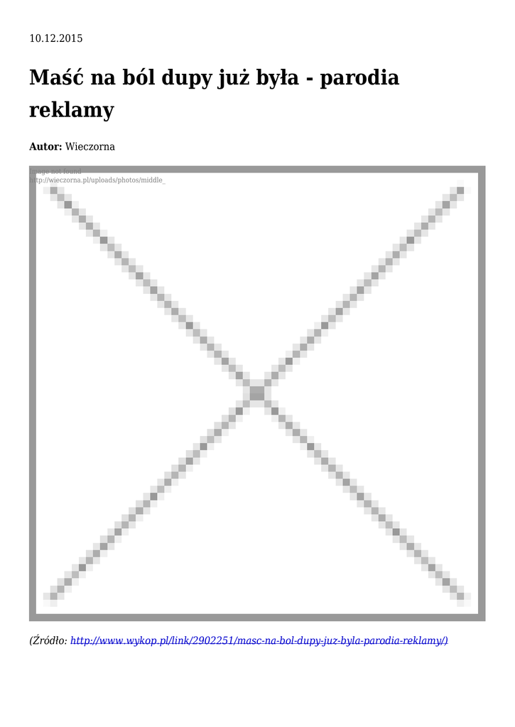 10.12.2015 Maść na ból dupy już była - parodia reklamy Autor: Wieczorna Image not found http://wieczorna.pl/uploads/photos/middle_ (Źródło: http://www.wykop.pl/link/2902251/masc-na-bol-dupy-juz-byla-parodia-reklamy/) wydaje ci się, że idealny środek na wszystko nie istnieje? mylisz się.