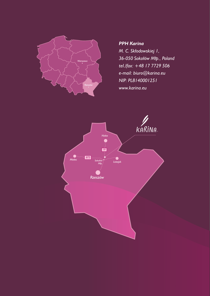 PPH Karina M. C. Skłodowskiej 1, 36-050 Sokołów Młp., Poland tel./fax: +48 17 7729 506 e-mail: [email protected] NIP: PL8140001251 www.karina.eu Warszawa Rzeszów ® Nisko 19 Mielec 875 Sokołów Młp. Rzeszów Leżajsk ® www.karina.eu Index / Index SPIS TREŚCI 2 Rajstopy / Tights / Damenstrumpfhose 4-6 Pończochy / Waist stockings / Strapsstrümpfe 6 Podkolanówki / Knee-length socks / Kniestrümpfe 7-8 Skarpetki / Socks / Baumwollsocken 9-13 Kolory i wymiary / Colors & sizes / Farben & Größen 14-15 About Us / Über die Firma O NAS “KARINA” Firma “KARINA” powstała w 1991 r. i od początku swojej działalności zajmuje się produkcją i sprzedażą wyrobów pończoszniczych. Podczas naszej długoletniej obecności na rynku opracowaliśmy szereg sposobów zapewniania jakości i bezpieczeństwa wyrobów: The company “KARINA” was established in 1991. From the early beginnings we have been involved in the production and marketing of hosiery. Throughout our long presence in the market we have developed a wide array of ways of ensuring the quality and safety of products: Die Firma “KARINA” entstand im 1991 und von Anfang an beschäftigt sie sich mit der Herstellung und dem Verkauf von Strumpfprodukten. Während unserer langen Anwesenheit auf dem Markt haben wir eine ganze Reihe von Methoden entwickelt, um Qualität und Sicherheit unserer Produkte zu sichern: podczas produkcji nasze wyroby są wielokrotnie sprawdzane, a najmniejsza wada powoduje odrzucenie wyrobu, maszyny to najnowszej klasy automaty sterowane komputerem, wszelkie urządzenia są cyklicznie przeglądane i konserwowane, zaopatrujemy się tylko u zaufanych dostawców przędzy, dbamy, aby materiał spełniał wszelkie wymogi bezpieczeństwa. during the production process the quality of our products is verified many times and in case any tiniest defect is detected, the product is rejected, the machines we use are the most recent computer-operated automatic machines, all machines are periodically subjected to control and maintenance, we buy only from reliable yarn suppliers we take all efforts to ensure the compliance of our products with all safety requirements. während des Herstellungsprozesses wird mehrmals die Qualität unserer Produkte geprüft und der kleinste Mangel verursacht, dass das Erzeugnis zurückgewiesen wird, wir verfügen über die mit Computer gesteuerten Maschinen von höchster Qualität, alle Anlagen sind regelmäßig geprüft und kontrolliert, unser Garn kommt von den zuverlässigen Lieferanten, Stoff alle Sicherheitsanforderungen erfüllt. Mocnymi stronami naszej działalności są: nowoczesny park maszynowy, nowoczesny budynek przystosowany do produkcji rajstop i skarpetek, wysoka jakość i bezpieczeństwo produktów, terminowość dostaw, konkurencyjna cena, wyspecjalizowani, lojalni pracownicy, osobisty kontakt z odbiorcami, sieć zaufanych dostawców materiałów. Our advantages involve: Unsere Stärken sind: modern machine facilities, a modern building adjusted to the production of tights and socks, high quality and safety of products, on-time deliveries, competitive prices, specialist and loyal employees, personal contact with recipients, a network of reliable material suppliers. ein moderner Maschinenpark ein modernes, der Herstellung der Strumpfhosen und der Strümpfe angepasstes Gebäude hohe Qualität und Sicherheit der Produkte ein Konkurrenzpreis unsere loyale Fachmitarbeiter persönlicher Kontakt mit den Kunden ein Netz von zuverlässigen Stofflieferanten Dzięki sieci dystrybucyjnej zajmujemy się także sprzedażą i dystrybucją produkowanych przez nas rajstop, skarpetek, podkolanówek i pończoch do sklepów i hurtowni. Sprzedaż wyrobów odbywa się przez stałą współpracę z hurtowniami i sprzedawcami detalicznymi. Thanks to our distribution network we are also involved in the sales and distribution of tights, socks, knee-length socks and stockings we produce to retail shops and wholesale stores. Marketing of our products is possible because of constant cooperation with wholesale stores and retail sellers. Dank unseres Vertriebsnetzes beschäftigen wir uns auch mit dem Verkauf und Vertrieb der von uns hergestellten Strumpfhosen, Socken und Kniestrümpfen an Geschäfte und Großhandlungen. Wir verkaufen unsere Produkte durch feste Zusammenarbeit mit den Groß- und Einzelhändlern. Klient jest dla nas najważniejszy, to jego zadowolenie daje nam motywację do dalszej wytężonej pracy, umożliwiając dynamiczny rozwój i stałe zwiększanie konkurencyjności. Our Customer is most important to us and it is the satisfaction of our Customers which gives us motivation to work harder to achieve dynamic development and constant increase in our competitiveness. Serdecznie zapraszamy do współpracy! You are kindly invited to cooperate with us! Der Kunde ist für uns am wichtigsten. Seine Zufriedenheit motiviert uns, weiter intensiv zu arbeiten und ermöglicht uns eine dynamische Entwicklung und ständige Vergrößerung unserer Konkurrenzfähigkeit. Wir laden Sie herzlich zu der Zusammenarbeit ein! 3 Rajstopy / Tights / Damenstrumpfhose Lady tights / Damenstrumpfhose RAJSTOPY DAMSKIE Pończochy / Waist Stockings / Strapsstrümpfe “Talia” Podkolanówki / Knee-Length Socks / Kniestrümpfe matowe, przeźroczyste, rajstopy damskie, typu elastil, o grubości 20 den, część majtkowa i palców pełna, wzmocniona, o grubości 30 den, szeroki, nieuciskający, elastyczny pas biodrowy, specjalne strefy „nielecących oczek” zwiększające trwałość, zagęszczona dzianina, zwiększająca wytrzymałość. SYMBOLE / SYMBOLS / SYMBOLE: 40, 30, 20, 10, 00 ROZMIARY / SIZES / GRÖßEN: XXL/5, XL/4, L/3, M/2, S/1 WWW www.karina.eu/product/20 SKŁAD: COMPOSITION: MATERIAL: poliamid: 97%, elastan: 3% polyamid: 97%, elastane: 3% polyamid: 97%, elasthan: 3% opaque, transparent lady tights of elastil type, 20 den, full and reinforced panty part and toe part with density 30 den, wide, n