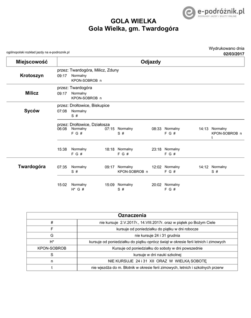 GOLA WIELKA Gola Wielka, gm. Twardogóra Wydrukowano dnia 02/03/2017 ogólnopolski rozkład jazdy na e-podroznik.pl Miejscowość Odjazdy przez: Twardogóra, Milicz, Zduny Krotoszyn 09:17 Normalny KPON-SOBROB n przez: Twardogóra Milicz 09:17 Normalny KPON-SOBROB n przez: Drołtowice, Biskupice Syców 07:08 Normalny S # przez: Drołtowice, Działosza 06:08 15:38 Twardogóra 07:35 15:02 Normalny F G # 07:15 Normalny Normalny F G # 18:18 Normalny Normalny S # 09:17 Normalny Normalny H* G # 15:09 Normalny 08:33 Normalny S # 14:13 Normalny F G # KPON-SOBROB n t 23:18 Normalny F G # F G # 12:02 Normalny KPON-SOBROB n 14:12 Normalny F G # S # 20:02 Normalny S # F G # Oznaczenia # nie kursuje 2.V.2017r., 14.VIII.2017r. oraz w piątek po Bożym Ciele F kursuje od poniedziałku do piątku w dni robocze G nie kursuje 24 i 31 grudnia H* kursuje od poniedziałku do piątku oprócz świąt w okresie ferii letnich i zimowych KPON-SOBROB Kursuje od poniedziałku do soboty w dni powszednie S kursuje w dni nauki szkolnej n NIE KURSUJE 24 i 31 XII ORAZ W WIELKĄ SOBOTĘ t nie wjezdża do m. Błotnik w okresie ferii zimowych, letnich i szkolnych przerw
