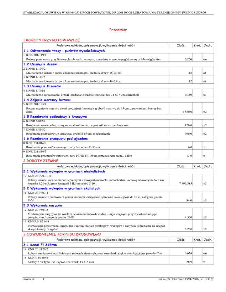 STABLIZACJA OSUWISKA W KM 6+050 DROGI POWIATOWEJ NR 2001 ROGI-LUBATOWA NA TERENIE GMINY IWONICZ ZDRÓJ Przedmiar 1 ROBOTY PRZYGOTOWAWCZE Podstawa nakładu, opis pozycji, wyliczenie ilości robót Ilość Krot. Jedn. 1.1 Odtworzenie trasy i punktów wysokościowych 1 KNR 201/119/4 Roboty pomiarowe przy liniowych robotach ziemnych, trasa dróg w terenie pagórkowatym lub podgórskim 0,250 km 18 szt 12 szt 0,380 ha 1.2 Usunięcie drzew 2 KNNR 1/101/2 Mechaniczne ścinanie drzew z karczowaniem pni, średnice drzew 16-25·cm 3 KNNR 1/101/5 Mechaniczne ścinanie drzew z karczowaniem pni, średnice drzew 46-55·cm 1.3 Usunięcie krzewów 4 KNNR 1/102/5 Mechaniczne karczowanie, krzaki i podszycie średniej gęstości (od 31-60 % powierzchni) 1.4 Zdjęcie warstwy humusu 5 KNR 201/125/1 Ręczne usuniecie warstwy ziemi urodzajnej (humusu), grubość warstwy do 15·cm, z przerzutem, humus bez darni 1 850,0 m2 120,0 m2 390,0 m2 1.5 Rozebranie podbudowy z kruszywa 6 KNNR 6/802/4 Rozebranie nawierzchni, masy mineralno-bitumiczne grubość 4·cm, mechanicznie 7 KNNR 6/801/2 Rozebranie podbudowy, z kruszywa, grubość 15·cm, mechanicznie 1.6 Rozebranie przepustu pod zjazdem 8 KNR 231/816/2 Rozebranie przepustów rurowych, rury betonowe Fi·50·cm 9 KNR 231/816/3 Rozebranie przepustów rurowych, rury PEHD Fi·100·cm z przewozem na odl. 12km 6,0 m 13,0 m 2 ROBOTY ZIEMNE Podstawa nakładu, opis pozycji, wyliczenie ilości robót Ilość Krot. Jedn. 2.1 Wykonanie wykopów w gruntach nieskalistych 10 KNR 201/207/1 (1) Roboty ziemne koparkami podsiębiernymi z transportem urobku samochodami samowyładowczymi do 1·km, koparka 1,20·m3, grunt kategorii I-II, samochód 5-10·t 7 499,585 m3 84,0 m3 4 500 m3 6 200 m2 2.2 Wykonanie wykopów w gruntach skalistych 11 KNR 201/307/4 Roboty ziemne z przewozem gruntu taczkami, odspojenie i przewóz na odległość do 10·m, kategoria gruntu V-VI 2.3 Wykonanie nasypów 12 KNR 201/503/2 Mechaniczne zasypywanie wnęk za ściankami budowli wodno - inżynieryjnych przy wysokości nasypu powyżej 4·m, kategoria gruntu III-IV 13 KNKRB 1/314/8 Plantowanie powierzchni skarp, dna i korony stałych przekopów, wykopów i nasypów (obrobienie na czysto) skarp i korony nasypów 3 ODWODNIENIE KORPUSU DROGOWEGO Podstawa nakładu, opis pozycji, wyliczenie ilości robót Ilość Krot. Jedn. 3.1 Kanał Fi 315mm 14 KNR 201/120/2 Roboty pomiarowe przy liniowych robotach ziemnych, trasa strumieni i rzek o szerokości dna powyżej 7·m 15 KNNR 4/1308/5 Kanały z rur typu PVC łączone na wcisk, Fi·315·mm strona nr: 1 0,029 km 28,9 m Zuzia (C) DataComp 1994-2006(lic. 12112) ODWODNIENIE KORPUSU DROGOWEGO Podstawa nakładu, opis pozycji, wyliczenie ilości robót Ilość 16 KNR 228/501/9 (1) Obsypka rurociągu kruszywem dowiezionym, piasek Krot. Jedn. 8,7 m3 1 szt 5 0.5 m 3.2 Studzienki 17 KNNR 4/1413/3 (1) Studnie rewizyjne z kręgów betonowych w gotowym wykopie, Fi·1200·mm, głębokość 5,5·m 18 KNNR 4/1413/4 Studnie rewizyjne z kręgów betonowych w gotowym wykopie, Fi·1200·mm, za każde 0,5·m różnicy głębokości 19 KNR 228/501/9 (1) Obsypka rurociągu kruszywem dowiezionym, piasek 20 KNNR 4/1413/3 (1) Studnie rewizyjne z kręgów betonowych w gotowym wykopie, Fi·1200·mm, głębokość6,0·m 21 KNNR 4/1413/4 Studnie rewizyjne z kręgów betonowych w gotowym wykopie, Fi·1200·mm, za każde 0,5·m różnicy głębokości 22 KNR 228/501/9 (1) Obsypka rurociągu kruszywem dowiezionym, piasek 23 KNNR 4/1413/3 (1) Studnie rewizyjne z kręgów betonowych w gotowym wykopie, Fi·1200·mm, głębokość 5,0·m 24 KNNR 4/1413/4 Studnie rewizyjne z kręgów betonowych w gotowym wykopie, Fi·1200·mm, za każde 0,5·m różnicy głębokości 25 KNR 228/501/9 (1) Obsypka rurociągu kruszywem dowiezionym, piasek 26 KNNR 4/1413/3 (1) Studnie rewizyjne z kręgów betonowych w gotowym wykopie, Fi·1200·mm, głębokość6,5·m 27 KNNR 4/1413/4 Studnie rewizyjne z kręgów betonowych w gotowym wykopie, Fi·1200·mm, za każde 0,5·m różnicy głębokości 28 KNR 228/501/9 (1) Obsypka rurociągu kruszywem dowiezionym, piasek 8,25 m3 1 szt 6 0.5 m 9 m3 1 szt 4 0.5 m 7,5 m3 1 szt 7 0.5 m 9,75 m3 15,7 m3 0,026 km 26,0 m 3.3 Obudowa kanału odprowadzającego i wylotu drenu 29 KNR 233/806/1 Obudowa wylotu kanału i wylotu drenu w rowie odprowadzającym ( kaskada z betonu B25) 3.4 Dreny podłużne Fi 250mm 30 KNR 201/120/2 Roboty pomiarowe przy liniowych robotach ziemnych, trasa strumieni i rzek o szerokości dna powyżej 7·m 31 KSNR 10/115/6 Rurociągi układane ręcznie w wykopach umocnionych o głębokości ponad 2 m, Fi·25·cm, dren perforowany owinięty włókniną 32 KNR 228/501/9 (1) Obsypka rurociągu kruszywem dowiezionym, żwir wraz z zabezpieczeniem folią z PE 33 KNKRB 1/321/7 Umocnienie ścian wykopów wraz z rozbiórka palami szalunkowymi stalowymi (wypraskami) w gruntach suchych; wykopy o szer. do 1 m; umocnienie ażurowe głębokość wykopu do 3 m ; kat. gruntu III-V 107,38 m3 156,0 m2 0,012 km 3.5 Dreny podłużne Fi 250mm (drenaż terenowy) 34 KNR 201/120/2 Roboty pomiarowe przy liniowych robotach ziemnych, trasa strumieni i rzek o szerokości dna powyżej 7·m 35 KSNR 10/115/6 Rurociągi układane ręcznie w wykopach umocnionych o głębokości ponad 2 m, Fi·25·cm, dren perforowany owinięty włókniną 36 KNR 228/501/9 (1) Obsypka rurociągu kruszywem dowiezionym, żwir wielofrakcyjny 37 KNKRB 1/321/7 Umocnienie ścian wykopów wraz z rozbiórka palami szalunkowymi stalowymi (wypraskami) w gruntach suchych; wykopy o szer. do 1 m; umocnienie ażurowe głębokość wykopu do 3 m ; kat. gruntu III-V 12 m 37,8 m3 96 m2 0,129 km 129,0 m 3.6 Dreny podłużne Fi 150mm (drenaż odcinający z zabezpieczeniem folią) 38 KNR 201/120/2 Roboty pomiarowe przy liniowych robotach ziemnych, trasa strumieni i rzek o szerokości dna powyżej 7·m 39 KSNR 10/115/4 (1) Rurociągi układane ręcznie w wykopach umocnionych o głębokości ponad 2 m, Fi·15·cm, rurki perforowane owinięte włók