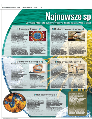 Gazeta Wyborcza, str.8 / Tylko Zdrowie, 2014-11-05 Najnowsze sp Czym się różni nóż cybernetyczny od noża gamma? Co jest już Terapia celowana Klasyczna chemioterapia to skuteczna, ale trochę „ślepa” forma leczenia, w dodatku bardzo toksyczna. Środki w niej stosowane atakują wszystkie niezróżnicowane, szybko dzielące się komórki organizmu. Są wśród nich oczywiście komórki rakowe, ale również wiele innych, których bynajmniej nie chcemy się pozbywać. Wyjściem mają być właśnie terapie celowane (za początek ery ich stosowania wielu uznaje wprowadzenie w 2001 r. glivecu dla pacjentów z niektórymi rodzajami białaczek i tzw. guzami podścieliska przewodu pokarmowego). Leki celowane nie działają na cały organizm, lecz wyłącznie na komórki, które uległy złośliwej transformacji, co podnosi nie tylko skuteczność terapii, ale też wiąże się z mniejszymi obciążeniami dla pacjenta (pewne skutki uboczne są i tu , ale o wiele mniej toksyczne niż w klasycznej chemii). Głównym punktem „zainteresowania” terapii celowanych są białka zaangażowane w pracę szlaków sygnałowych komórek raka. Zablokowanie tych białek (a tym samych szlaków) skutkuje np. tym, że złośliwa komórka nie jest w stanie się dzielić i ulega apoptozie, czyli zaprogramowanej śmierci. Radioterapia protonowa Dzięki niej można leczyć nowotwory mózgu, ale też np. nowotwory położone blisko ważnych narządów, które w przypadku klasycznej radioterapii byłyby narażone na poważne uszkodzenia. Wytwarzane zaś w cyklotronie protony z wielką precyzją kierują się w stronę guza i niszczą wyłącznie złośliwe komórki (radioterapię protonową dość często wykorzystuje się w onkologii pediatrycznej). Jeżeli chodzi o nasz kraj, powyższy opis to na razie pieśń przyszłości, choć już może nie tak odległej. Najprawdopodobniej w 2015 r. pierwsi pacjenci zostaną przyjęci do Centrum Cyklotronowego „Bronowice” (Kraków) mającego stać się głównym elementem Narodowego Centrum Radioterapii Hadronowej. W zamyśle ma to być czołowy polski ośrodek – zarówno badawczy, jak Elektrochemioterapia Metoda ta stosowana jest głównie u pacjentów z guzami nowotworowymi zlokalizowanymi w skórze i tkance podskórnej. Celem elektrochemioterapii jest przede wszystkim polepszenie jakości życia chorego, co w większości przypadków rzeczywiście się udaje. Terapia polega na krótkookresowej destabilizacji błon komórkowych, która następuje pod wpływem zastosowanego pola magnetycznego. W ten sposób udaje się podnieść efektywność stężenia podawanej pacjentowi chemioterapii. To bezpieczna i w zasadzie pozbawiona skutków ubocznych metoda stosowana na przykład w przypadku nieoperacyjnych, zaawansowanych guzów zlokalizowanych w powłokach ciała, w leczeniu pierwotnych nowotworów skóry (czerniaka czy raka skóry) oraz w terapii przerzutów nowotworów powstających w skórze lub tkance podskórnej, które nie kwalifikują się do innej terapii. Metoda ta jest refundowana w Polsce (choć nie we wszystkich wskazaniach). Nóż cybernetyczny Mają go trzy ośrodki w Polsce – w Poznaniu, Gliwicach i Wieliszewie pod Warszawą. Cyber knife to nowoczesne, zautomatyzowane urządzenie do radiochirurgii – nieinwazyjnego usuwania guzów nowotworowych w obrębie głowy oraz innych części ciała. Zabieg polega na napromienianiu guza wiązkami promieniowania X o wysokiej energii wysyłanych z różnych kierunków, tak by zdrowe tkanki w sąsiedztwie guza zaabsorbowały jak najmniejszą dawkę energii jonizującej. Technika jest niezwykle precyzyjna – działa z dokładnością do ułamków milimetra. Jest mało obciążająca dla chorego – nie wymaga nawet znieczulenia. Nóż cybernetyczny najczęściej stosuje się w przypadku dobrze odgraniczonych od otoczenia guzów litych, ale też Nanotechnologie W jaki sposób staramy się dziś stosować nanotechnologię w onkologii? Weźmy choćby nowotwór, o którym ostatnio jest wyjątkowo głośno – raka trzustki. Jedną z najnowszych terapii stosowanych w jego przypadku jest podawanie nab-paklitakselu w połączeniu z gemcytabiną. Zarówno gemcytabina, jak i paklitaksel są znanymi od dawna lekami przeciwnowotworowymi. Kluczowy jest tu przedrostek „nab”. Oznacza albuminę (białko), która jest łatwo transportowana przez krew i równie łatwo wychwytywana www.facebook.com/tylkozdrowie i terapeutyczny – specjalizujący się w radioterapii protonowej (w skład tworzącego go konsorcjum wchodzą m.in. Instytut Fizyki Jądrowej PAN i warszawski Instytut Onkologii im. Marii Skłodowskiej-Curie wraz ze swoimi oddziałami). Obecnie terapię protonową (wykorzystującą cyklotron Instytutu Fizyki Jądrowej w Krakowie) stosuje się w przypadku czerniaka gałki ocznej. Zabieg jest refundowany przez NFZ. przez komórki rakowe, które traktują ją jako substancję odżywczą. Dzięki temu do tych komórek trafia więcej połączonego z albuminą leku – paklitakselu. Używając konsumpcyjnych porównań – rakowa komórka łapie albuminę, chcąc się najeść, a przy okazji je śmiertelną dla siebie truciznę. Metoda ta z jednej strony podnosi skuteczność leku, a z drugiej – bardzo ogranicza jego ewentualne skutki uboczne. W podobny sposób naukowcy starają się wykorzystać również inne nanocząsteczki w innych lekach onkologicznych. w guzach płuca (dzięki nożowi cybernetycznemu można precyzyjnie operować guzy poruszające się podczas np. oddychania), wątroby, w raku trzustki czy w przypadku odległych przerzutów innych nowotworów złośliwych (cyber knife często stosuje się jako metodę leczenia paliatywnego, którego celem jest przede wszystkim poprawa jakości życia chorego). We wszystkich ośrodkach zabiegi są bezpłatne. ZWROTNIK RAKA Więcej o metodach leczenia znaleźć można na portalu onkologicznym Zwrotnikraka.pl. W przystępny sposób są tutaj wyjaśnione trudne poj