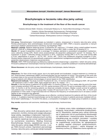Mieczysława Jurczyk1, Karolina Jurczyk2, Janusz Skowronek3 Brachyterapia w leczeniu raka dna jamy ustnej Brachytherapy in the treatment of the floor of the mouth cancer 1 Katedra Zdrowia Matki i Dziecka, Uniwersytet Medyczny im. Karola Marcinkowskiego w Poznaniu 2 Katedra i Klinika Stomatologii Zachowawczej i Periodontologii Uniwersytet Medyczny im. Karola Marcinkowskiego w Poznaniu 3 Zakład Brachyterapii, Wielkopolskie Centrum Onkologii w Poznaniu Streszczenie Cel pracy. Teleradioterapia i brachyterapia są metodami z wyboru, stosowanymi w leczeniu raka dna jamy ustnej. Poniżej prezentujemy dane potwierdzające skuteczność brachyterapii HDR i PDR w leczeniu pacjentów w różnych klinicznych stadiach zaawansowania nowotworu wg klasyfikacji TNM. Materiał i metody. Badania obejmują grupę 73 pacjentów (61 mężczyzn i 12 kobiet), którzy zostali poddani leczeniu HDR-BT i PDR-BT w Wielkopolskim Centrum Onkologii w latach 2001–2005, w wieku 38–79 (średnia 57,1). Wyniki. W I grupie 9 pacjentów zmarło w przeciągu 12 miesięcy, jednakże w pozostałych przypadkach zaobserwowano całkowitą remisję (CR). Średni okres przeżywalności dla pacjentów paliatywnych wynosił 7,9 miesięcy. Po 4 tygodniach w grupie I całkowitą remisję zauważono w 87%, częściową remisję (PR) w 8,7% oraz brak remisji (NR) w 4,3%; odpowiednio w grupie II – 22,7%, PR – 54.5%, NR – 18,2% oraz dodatkowo progresja wystąpiła w 4,6%. Wysoka dawka miejscowa nie spowodowała zwiększenia częstotliwości występowania powikłań, chociaż u wszystkich pacjentów obserwowano miejscowe zaczerwienienie. Wnioski. HDR i PDR brachyterapia są efektywną częścią leczenia skojarzonego u pacjentów z rakiem dna jamy ustnej. W leczeniu paliatywnym brachyterapia może być leczeniem z wyboru u pacjentów poddanych wcześniej teleradioterapii. Słowa kluczowe: rak dna jamy ustnej, teleradioterapia, brachyterapia, dawka frakcyjna. Abstract Objectives. For floor of the mouth cancer, due to its rapid growth and localization, surgical treatment is a limited option. External beam radiotherapy (EBRT) and brachytherapy are the treatment of choice. The purpose of this work was to present data on the survival and effectiveness of HDR and PDR brachytherapy (HDR – BT, PDR – BT) treatment in a group of patients with different clinical stages of cancer based on the TNM classification. Material and methods. The study involved 73 patients (61 men, 12 women) which had undergone HDR – BT and PDR – BT treatment in GCC in 2001–2005. Ages ranged from 38 to 79, median – 57.1. Results. In the first group of patients 9 of 43 died within 12 months of follow-up. Four weeks after the end of the treatment complete remission (CR) was seen in 87.0%, partial remission (PR) in 8.7% and no remission (NR) in 4.3% cases. After 12 months in all the remaining patients we observed complete remission. Median overall survival for palliative care patients was 7.9 months. In this group after 4 weeks CR was found in 22.7 %, PR – in 54.5%, NR – in 18.2% and progression in 4.6% cases. A high local dose did not influence the frequency of complications but in all cases a certain degree of skin erythema was detected. Conclusions. 1. HDR and PDR brachytherapy are an effective combined treatment for patients with floor of the mouth cancer. 2. In palliative treatment brachytherapy can be the treatment of choice in patients previously irradiated with external beam radiotherapy. 3. To confirm the above, a comparative investigation of a larger group of patients is needed. Key words: squamous cell carcinoma, teletherapy, brachytherapy, fractional dose. Wstęp Rak dna jamy ustnej obok raka języka jest nowotworem, na który, biorąc pod uwagę całą populację ludzką, zapadają w większości mężczyźni – palacze tytoniu. Z danych statystycznych wynika, że ostatnio rejestruje się wzrost zachorowalności na wymienione nowotwory. Według American Brachytherapy Society, zapadalność roczna na raka dna jamy ustnej sięga 28 000 rocznie, z czego 7000 chorych umiera. Ogniskiem pierwotnego rozwoju raka dna jamy ustnej jest obręb leukoplaDENTAL FORUM /2/2010/XXXVIII kii, miejsce urazu nisko osiadającej protezy, erytroplazja, liszaj płaski i włóknienie podśluzówkowe [1]. Nowotwory złośliwe jamy ustnej różnicują się w zależności od ich pochodzenia tkankowego na nabłonkowe i mezenchymalne. Nowotwory te charakteryzują się szybkim rozrostem i wysoką złośliwością kliniczną [2]. Występuje wzmożona częstotliwość przerzutów do sąsiadujących w okolicy węzłów chłonnych podżuchwowych, podbródkowych szyjnych i węzła leżącego na okostnej żuchwy [1]. Właściwa ocena ogniska noPRACE ORYGINALNE 59 Mieczysława Jurczyk, Karolina Jurczyk, Janusz Skowronek wotworu, przeprowadzona na podstawie wywiadu onkologicznego, badania przedmiotowego, badania radiologicznego i badania mikroskopowego, pozwala na podjęcie trafnej decyzji terapeutycznej o dalszym leczeniu pacjenta. Cel badań Celem badań jest potwierdzenie skuteczności zastosowania brachyterapii w leczeniu pacjentów z rakiem dna jamy ustnej. Materiał i metody Badania obejmują grupę 73 pacjentów (61 mężczyzn i 12 kobiet), którzy zostali poddani leczeniu brachyterapią HDR-BT i PDR-BT w Wielkopolskim Centrum Onkologii w latach 2001– 2005, w wieku 38–79 (średnia 57,1). 62 pacjentów było leczonych przy użyciu brachyterapii HDR, 11 przy użyciu brachyterapii PDR. 28 pacjentów było poddanych leczeniu z uwagi na wznowę po teleradioterapii EBRT (n = 25) oraz po leczeniu chirurgicznym (n = 3). 43 pacjentów było leczonych radykalnie (grupa I), 30 paliatywnie (grupa II). Dwóch pacjentów z grupy I było leczonych BT wyłącznie, pozostałych 41 w połączeniu z teleterapią EBRT. Paliatywni pacjenci najczęściej poddawani byli wyłącznie brachyterapii (n = 20) lub w połączeniu z chirurgią paliatywną (n = 5). Analizę przeprowadzono w okresach po