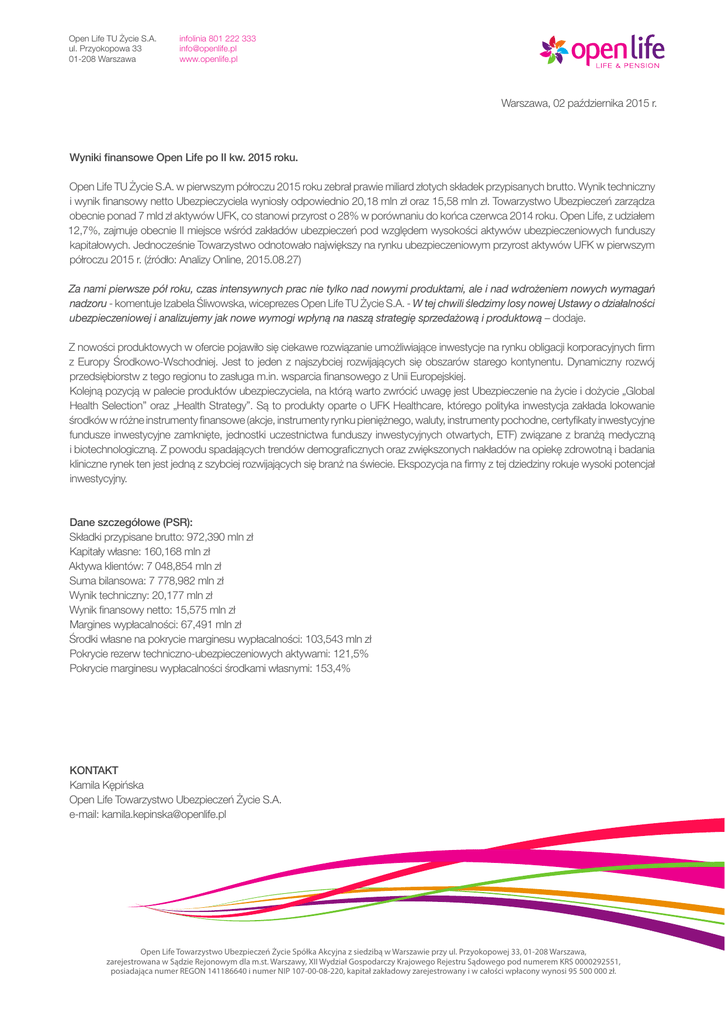 Warszawa, 02 października 2015 r. Wyniki finansowe Open Life po II