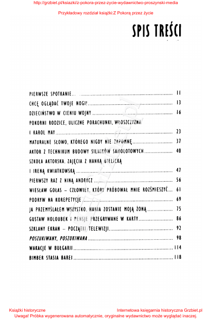 http://grzbiet.pl/ksiazki/z-pokora-przez-zycie-wydawnictwo-proszynski-media Przykładowy rozdział książki:Z Pokorą przez życie PIERWSH IPOTKAHIE.. li CHC( OGLĄDA( TWOJE HOGI 1 ••• l] DZIECIŃIIWO W CIENIU WOJNY .. 16 POKORHI RODZICE, ULICZNE PORACHUNKI. WtOilClYZNA ll l KAROL MAY.. . MATURALNE IŁOWO. KTÓREGO NIGDY NIE ZAPOHH(.. 31 AKTOR l TECHNIKUM BUDOWY IILNIKÓW lAMOLOTOWYCH.. 40 llKOtA AKIORIKA. lAJ(CIA l l HANKĄ BIELICKĄ 47 IRENĄ KWIATKOWIKĄ.. PIERWI!Y RAT l NINĄ 16 ANORYCZ.. WIEilAW GOtAI- CltOWIEK, KTÓRY PRÓBOWAt MNIE RO!ŚHIEI!Yi.. 61 POORYW HA KOREPETYC)E.. 69 JA PRHHYŚLAIEH WIZYITKO. HANIA ZOliANIE HOJĄ ŻONĄ.. B GUllAW HOLOUBEK l PEHIJE PRZEGRYWANE W KARTY... 86 \!KLANY EKRAN - POC!ĄTKI TELEWIZJI.. POSZUKIWANY, POSZUKIWANA.. 92 98 WAKACJE W 8UlGIRII.. ............. 114 81MBER ITAliA BAREI.. .. .... 118 Książki historyczne Internetowa księgarnia historyczna Grzbiet.pl Uwaga! Próbka wygenerowana automatycznie, oryginalne wydawnictwo może wyglądać inaczej. http://grzbiet.pl/ksiazki/z-pokora-przez-zycie-wydawnictwo-proszynski-media Przykładowy rozdział książki:Z Pokorą przez życie l l PIII!II!IIIIHII MARIA CZUBlilEK O WOJCifCHU POKORZE .................................... 121 KABARET !TAR!ZYCH PANÓW, OUDEK l OWCA ................................. 124 PRlYGOOY NIE TYLKO P!A CYWILA .. REJ! POO PR~O .. ....................... 134 .. .................................... 139 .. ZA KULI!AHI KABARETU OLGI LIPIŃ!KIEJ .................................. 147 l ZON~ W OOHU, l ŻON~ W PRACY.. . .. .................................. 161 PODRÓŻE DO AMERYKI -W OOWIEOZINACH U POLONII PANEH TO JE !TE H TU 164 . ................. 176 JAKIEGO PANA' CHAMA, NIE PANA' . JA'. ......................................................... X JAK AlTERNATYWY 4, "B" JAK BRUNET . ................. 182 .C" JAK U. OflfRTER/Y ... ClTfROl/EJTOlATEK, KRY!Y! WIEKU ŚREDNIEGO l Hl!..... PRL - PROBLEMY l CENZUR~. AlTERNATYWAHI 4 l CÓRK~.. !YCIE TOWAR!Y!KIE. C!Yll JAK TO 176 WIECZOROWĄ PORĄ, BYŁO NAPRAWD\... . 197 .. ... 201 .. ............ 214 llO KRY!TYNA JANOA O WOJCIECHU POKORZE.. W GOŚCINIE U KRY!JYNY JANOY.. . .221 CEZARY ŻAK O WOJCIECHU POKOR!E ....... lll NIE !AHYH AKTOR!TWEH CltOWIEK ŻYJE - RE!Y!ERIA.. HAH TAK !AHO JAK TY HIA!TO HOJE, A W NIM.. ............ ll8 ..ll4 .ll8 MAGICZNE KAMIENIE.. . . WALIZKI ZA DRZWIAMI - PRZEPI! NA UDANE HALŻEŃ!TWO.. .. Hl LICENCJA NA KIEROWANIE...... ... W RODZINA - NAJWIĘK!ZY !KARB.. ..... 251 ACH, TE WNUCZĘTA.. JEON~ NOG~ NA TAMTYM ŚWIECIE.. KAŻDA OliALKA UlALEI NlA.. .. .. 260 . ..................... 264 ........ 219 GÓRALE. BOAZERIA l DZIAŁKOWY ZLOT !!AHA NÓW ......................... lB6 POL!KIE !ER lALE ..... .......................................... 293 Książki historyczne Internetowa księgarnia historyczna Grzbiet.pl Uwaga! Próbka wygenerowana automatycznie, oryginalne wydawnictwo może wyglądać inaczej. http://grzbiet.pl/ksiazki/z-pokora-przez-zycie-wydawnictwo-proszynski-media Przykładowy rozdział książki:Z Pokorą przez życie IPIITII!CI ! UTORIIW01 JA li( DO TEGO NIE NADAJ(!.. . DIIEHDZIEIIĄT LIT HIN(LO JAK JEDEN DZIEŃ.. JAN KOBUIZEWIKI O WOJCIECHU POKORZE.. POKORNY DO TERAZ... ARTUR BARCli O WOJCIECHU POKORZE ... HILOG.. . OD AUTORA.. . PODZI(KOWANIA.. IPII RÓL.. INDEll OIÓB... .......... 298 .. ..................... JDJ .. ... l 16 ................................. 119 .. ............................. J2l .................. llS ................ JJ5 ................ JJ1 . .......................... JJ9 .................................... m Książki historyczne Internetowa księgarnia historyczna Grzbiet.pl Uwaga! Próbka wygenerowana automatycznie, oryginalne wydawnictwo może wyglądać inaczej. http://grzbiet.pl/ksiazki/z-pokora-przez-zycie-wydawnictwo-proszynski-media Przykładowy rozdział książki:Z Pokorą przez życie ~PI~ RÓl Kapelusz 1953 reż. Le onard Buczkawski - film fabularny. Pr:::.vgoda na Mariensztacie. statysta słomkowy, reż. Kazimierz Rudzki, Ludwik Sempoliński- spek takl teatralny, PWST Warszawa Parady. reż. Ewa Bonacka- spektakl teatralny. Teatr Dramatyczny Warsza wa. rola: Aktor. Leander 1956 reż. Bohdan Korzeniewski - spektakl teatralny. Teatr Polski Warszawa. statysta Swięta Joanna. 1957 Jak wam się podoba. reż Władysław Krasnowiecki - spektakl teatralny, PWST Warszawa. rola: Wiliam (III rok) 1959 Piosenki przy księżycu. reż. Piotr Fry- drych- widowisko telewizyjne Z minionych lat. reż. Konrad Swinarski-spektakl telewizyjny, Teatr Telewizji reż. Halina MikoAndrzej Sadowski- spektakl teatralny, Teatr Dramatyczny Warsza Romulus Wielki. łajska, 1958 Róża podwórza. reż. Piotr Friedrich -spektakl telewizyjny Król - spektakl telewizyjny, rola· Blond Wizyta starszej pani. reż. Ludwik Re wa, rola: Teodoryk W małym dworku, reż. Wanda La skowska - spektakl teatralny, Teatr Dramatyczny Warszawa. rola: fózel Maszejko ne- spektakl teatralny, Teatr Drama tyczny Warszawa, rola: Dziennikarz, 1960 reporter Proces Joanny D'Arc w Ruen w roku Książki historyczne Internetowa księgarnia historyczna Grzbiet.pl Uwaga! Próbka wygenerowana automatycznie, oryginalne wydawnictwo może wyglądać inaczej. http://grzbiet.pl/ksiazki/z-pokora-przez-zycie-wydawnictwo-proszynski-media Przykładowy rozdział książki:Z Pokorą przez życie 141 l mUl rllll IHII 1431, reż. Konrad Swinarski- spek takl telewizyjny, rola: Adiutant ob serwatora angielskiego Ptaki, reż. Konrad Swinarski- spek takl teatralny, Teatr Dramatyczny Warszawa, rola: Poeta, Poborca, Syn wyrodny Mąż swojej żony, reż. Stanisław Ba reja - film fabularny, rola: Mietek, malan pokojowy Zezowate szczęście, reż. Andrzej Munk- film fabularny, rola: podcho rąży w obozie Zawadiaka mimo woli, reż. Wanda Laskowska - spektakl telewizyjny. Teatr Telewizji Uczta morderców, reż. Wanda La skowska - spektakl teatralny. Teatr Dramatyczny Warszawa. rola: Robert się lubić~ reż. Konrad Swinarski- spektakl telewiz