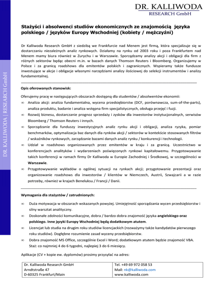 Stażyści i absolwenci studiów ekonomicznych ze znajomością języka polskiego / języków Europy Wschodniej (kobiety / mężczyźni) Dr Kalliwoda Research GmbH z siedzibą we Frankfurcie nad Menem jest firmą, która specjalizuje się w dostarczaniu niezależnych analiz rynkowych. Działamy na rynku od 2003 roku i poza Frankfurtem nad Menem mamy biura również w Zurychu i w Warszawie. Sporządzamy analizy akcji i obligacji dla firm z różnych sektorów będąc obecni m.in. w bazach danych Thomson Reuters i Bloomberg. Organizujemy w Polsce i za granicą roadshows dla emitentów polskich i zagranicznych. Wspieramy także fundusze inwestujące w akcje i obligacje własnymi narzędziami analizy ilościowej do selekcji instrumentów i analizy fundamentalnej. ______________________________________________________________________________________ Opis oferowanych stanowisk: Oferujemy pracę w następujących obszarach dostępną dla studentów / absolwentów ekonomii: • Analiza akcji: analiza fundamentalna, wycena przedsiębiorstw (DCF, porównawcza, sum-of-the-parts), analiza produktu, badanie i analiza wstępna firm specjalistycznych, obsługa przejęć i fuzji. • Rozwój biznesu, dostarczanie prognoz sprzedaży i zysków dla inwestorów instytucjonalnych, serwisów Bloomberg / Thomson Reuters i innych. • Sporządzanie dla funduszy inwestycyjnych analiz rynku akcji i obligacji, analiza ryzyka, pomiar benchmarków, optymalizacja baz danych dla rynków akcji / sektorów w kontekście stosowanych filtrów / wskaźników rynkowych, zarządzanie bazami danych analiz rynku / konkurencji i technologii. • Udział w roadshows organizowanych przez emitentów w kraju i za granicą. Uczestnictwo w konferencjach analityków i wydarzeniach poświęconych rynkowi kapitałowemu. Przygotowywanie takich konferencji w ramach firmy Dr Kalliwoda w Europie Zachodniej i Środkowej, w szczególności w Warszawie. • Przygotowywanie wykładów o ogólnej sytuacji na rynkach akcji; przygotowanie prezentacji oraz organizowanie roadshows dla inwestorów / klientów w Niemczech, Austrii, Szwajcarii a w razie potrzeby, również w krajach Beneluksu / Francji / Danii. ______________________________________________________________________________________ Wymagania dla stażystów / zatrudnionych: • Duża motywacja w obszarach wskazanych powyżej. Umiejętność sporządzania wycen przedsiębiorstw i silny warsztat analityczny. • Doskonałe zdolności komunikacyjne, dobra / bardzo dobra znajomość języka angielskiego oraz polskiego. Inne języki Europy Wschodniej będą dodatkowym atutem. • Licencjat lub studia na drugim roku studiów licencjackich (rozważymy także kandydatów pierwszego roku studiów). Dogłębne rozumienie zasad wyceny przedsiębiorstw. • Dobra znajomość MS Office, szczególnie Excel i Word; dodatkowym atutem będzie znajomość VBA. Staż: co najmniej 4 do 6 tygodni, najlepiej 3 do 6 miesięcy. Aplikacje (CV + kopie ew. dyplomów) prosimy przysyłać na adres: Dr. Kalliwoda Research GmbH Arndtstraße 47 D-60325 Frankfurt/Main Tel. +49 69 972 058 53 Mail: [email protected] www.kalliwoda.com