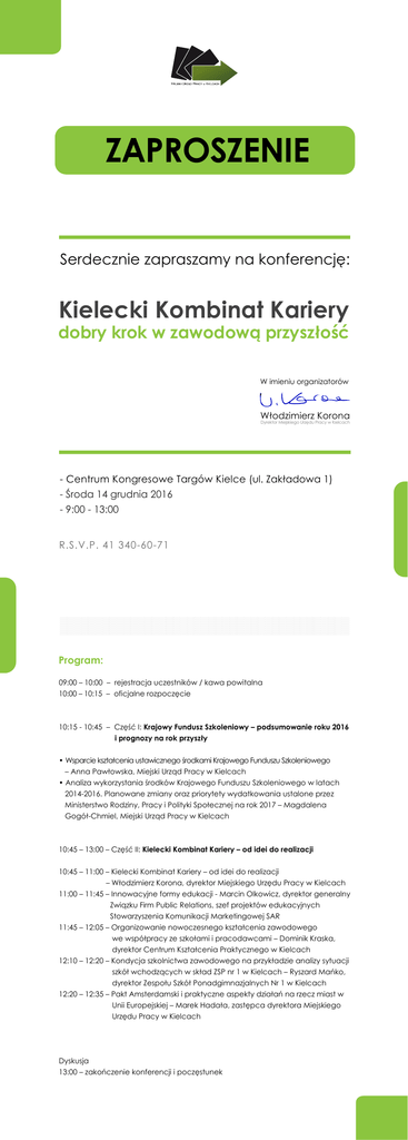 ZAPROSZENIE Serdecznie zapraszamy na konferencję: Kielecki Kombinat Kariery dobry krok w zawodową przyszłość W imieniu organizatorów Włodzimierz Korona Dyrektor Miejskiego Urzędu Pracy w Kielcach - Centrum Kongresowe Targów Kielce (ul. Zakładowa 1) - Środa 14 grudnia 2016 - 9:00 - 13:00 R.S.V.P. 41 340-60-71 Program: 09:00 – 10:00 – rejestracja uczestników / kawa powitalna 10:00 – 10:15 – oficjalne rozpoczęcie 10:15 - 10:45 – Część I: Krajowy Fundusz Szkoleniowy – podsumowanie roku 2016 i prognozy na rok przyszły • Wsparcie kształcenia ustawicznego środkami Krajowego Funduszu Szkoleniowego – Anna Pawłowska, Miejski Urząd Pracy w Kielcach • Analiza wykorzystania środków Krajowego Funduszu Szkoleniowego w latach 2014-2016. Planowane zmiany oraz priorytety wydatkowania ustalone przez Ministerstwo Rodziny, Pracy i Polityki Społecznej na rok 2017 – Magdalena Gogół-Chmiel, Miejski Urząd Pracy w Kielcach 10:45 – 13:00 – Część II: Kielecki Kombinat Kariery – od idei do realizacji 10:45 – 11:00 – Kielecki Kombinat Kariery – od idei do realizacji – Włodzimierz Korona, dyrektor Miejskiego Urzędu Pracy w Kielcach 11:00 – 11:45 – Innowacyjne formy edukacji - Marcin Olkowicz, dyrektor generalny Związku Firm Public Relations, szef projektów edukacyjnych Stowarzyszenia Komunikacji Marketingowej SAR 11:45 – 12:05 – Organizowanie nowoczesnego kształcenia zawodowego we współpracy ze szkołami i pracodawcami – Dominik Kraska, dyrektor Centrum Kształcenia Praktycznego w Kielcach 12:10 – 12:20 – Kondycja szkolnictwa zawodowego na przykładzie analizy sytuacji szkół wchodzących w skład ZSP nr 1 w Kielcach – Ryszard Mańko, dyrektor Zespołu Szkół Ponadgimnazjalnych Nr 1 w Kielcach 12:20 – 12:35 – Pakt Amsterdamski i praktyczne aspekty działań na rzecz miast w Unii Europejskiej – Marek Hadała, zastępca dyrektora Miejskiego Urzędu Pracy w Kielcach Dyskusja 13:00 – zakończenie konferencji i poczęstunek