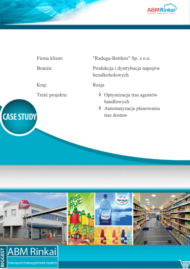 Wdrożenie systemu ABM Rinkai TMS Firma klient: "Raduga-Bottlers" Sp. z o.o. Branża: Produkcja i dystrybucja napojów bezalkoholowych Kraj: Rosja Treść projektu: Optymizacja tras agentów handlowych Automatyzacja planowania tras dostaw Wdrożenie systemu ABM Rinkai TMS Raduga-Bottlers Producent szerokiego spektra napojów bezalkoholowych pod znakiem towarowym "Raduga", "Marocznyj", "Fruktowa Planeta", "FreeFruit", "Chistyj glotok", "Podziemnyj dar" CEL PROJEKTU Optymizacja i automatyzacja planowania tras agentów handlowych i dostaw. Wdrożenie systemu ABM Rinkai TMS PRZESŁANKI Wysokie wydatki transportowe przy wykorzystaniu w pełni wynajętego transportu; Trudność zarządzania zasobami z uwzględnieniem sezonowości; Brak sytemu planowania i kontroli tras. WDROŻENIE W trakcie realizacji projektu wyjawiono 25% zapasów czasowych u agentów handlowych podczas sezonu. Była przyjęta decyzja wykorzystać wyjawiony rezerw dla rozszerzenia bazy klientów i zwiększenia intensywności pracy działu handlowego (częstotliwość wizyt). W zwolnione okna czasowe były zaplanowane dodatkowe wizyty. Podczas sezonu częstotliwość odwiedzin większości punktów handlowych wynosi nie mniej niż 2-3 razy w tygodniu. Podczas nie sezonu częstotliwość jest znacznie mniejsza. Dzięki automatyzacji formowania tras agentów handlowych za pomocą systemu ABM Rinkai TMS była wykonana optymizacja pracy działu handlowego z uwzględnieniem sezonowości. Wdrożenie systemu ABM Rinkai TMS pozwoliło o 35 % zmniejszyć wydatki na dostawę wszystkich zamówień, gdyż ilość niezbędnych samochodów zmniejszyła się z 60 do 38 i utrzymuje się na tym poziomie. W związku z rozszerzeniem działalności firmy system może lekko skalować się dla jakichkolwiek wielkości dostaw. WYNIKI Optymizacja i automatyzacja tras dostaw i agentów handlowych; Zmniejszenie wpływy ludzkiego czynnika; Zwiększenie efektywności działu handlowego.