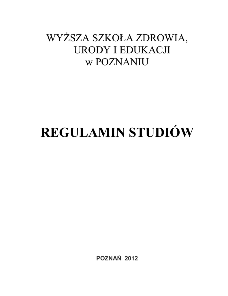 WYŻSZA SZKOŁA ZDROWIA, URODY I EDUKACJI w POZNANIU REGULAMIN STUDIÓW POZNAŃ 2012 Spis treści: 1. Postanowienia ogólne ……………………………………………...……………2 2. Przyjęcie na studia ………………………………………………………………2 3. Prawa i obowiązki studenta ……………………………………………………..3 4. Rok akademicki …………………………………………………………………5 5. Opiekun roku …………………………………………………………………….5 6. Organizacja studiów, plan studiów i program nauczania ………………………..6 7. Zaliczenia i egzaminy ……………………………………………………………8 8. Zaliczenie semestru, powtarzanie semestru lub przedmiotu, warunkowe zezwolenie na podjęcie studiów w semestrze następnym ……………….……..11 9. Skreślenie z listy studentów, wznowienie studiów …………………………….12 10. Nagrody ……………………………………………………………………….13 11. Zmiany w toku studiów ……………………………………………………….14 12. Przeniesienia na lub z innej Uczelni, zmiana specjalności studiów …………..17 13. Ukończenie studiów …………………………………………………………..18 14. Przepisy końcowe ……………………………………………………………..21 1 1. Postanowienia ogólne §1 Podstawowymi aktami prawnymi określającymi zasady funkcjonowania Uczelni Wyższej oraz regulującymi prawa i obowiązki studentów są: Ustawa z dnia 27 lipca 2005 roku - Prawo o szkolnictwie wyższym (Dz.U. Nr 164 poz. 1365 z późn. zm.), zwanej dalej ustawą, rozporządzenie Ministra Nauki i Szkolnictwa Wyższego z dnia 19 lipca 2011 r. w sprawie warunków jakim muszą odpowiadać postanowienia regulaminu studiów w uczelniach. Statut Wyższej Szkoły Zdrowia, Urody i Edukacji w Poznaniu, zwanej dalej Uczelnią. §2 Student obowiązany jest postępować zgodnie z treścią ślubowania i regulaminem studiów, przestrzegać przepisów obowiązujących w uczelni, wykonywać zarządzenia władz Uczelni i jej organów, dbać o dobre imię Uczelni oraz szanować jej tradycje i zwyczaje. 2. Przyjęcie na studia §3 Zasady i tryb przyjmowania na studia określa Senat. 1. Osoba przyjęta na studia nabywa prawa studenta z chwilą immatrykulacji i złożenia ślubowania, którego treść określa statut uczelni. 2. Student otrzymuje legitymację studencką. Student może otrzymać indeks. Indeks jest dokumentem przedstawiającym przebieg i wyniki studiów. Indeks może być prowadzony w formie elektronicznej. Decyzję o wprowadzeniu indeksu w formie elektronicznej dla całej Uczelni podejmuje rektor. Legitymacja studencka podlega zwrotowi po przerwaniu lub ukończeniu studiów, w przypadku absolwentów studiów I stopnia do dnia 31 października roku ukończenia tych studiów. §4 1. Student ponosi koszty nauki w Uczelni. 2 2. Rodzaje i wysokość wszystkich opłat określa kanclerz. Opłaty o których mowa w ust.1 wnoszone są przez studentów na podstawie umowy zawieranej z Uczelnią. §5 1. Przełożonym wszystkich studentów Uczelni jest rektor. 2. Przełożonym studentów Wydziału jest dziekan. 3. Jedynym reprezentantem ogółu studentów jest Samorząd Studencki. 3. Prawa i obowiązki studenta §6 Student ma prawo do: 1) zdobywania wiedzy, rozwijania własnych zainteresowań naukowych i sportowych w ramach zajęć programowych oraz korzystania w tym celu z pomieszczeń, urządzeń i środków Uczelni oraz z pomocy ze strony pracowników, 2) uczestniczenia w wykładach, ćwiczeniach, seminariach oraz innych obowiązkowych formach dydaktycznych, 3) zrzeszania się w kołach naukowych oraz uczestnictwa w pracach badawczych prowadzonych przez Uczelnię, 4) uzyskania dyplomu ukończenia studiów, o ile spełnione zostaną warunki ukończenia studiów, 5) poszanowania godności osobistej i podmiotowego traktowania we wszystkich kontaktach z Organami i wszystkimi pracownikami Uczelni, 6) wnoszenia odwołań od decyzji przełożonych, zgodnie z obowiązującymi przepisami, 7) urlopu od zajęć w Uczelni, na zasadach określonych w niniejszym Regulaminie, 8) ochrony zdrowia i pomocy lekarskiej przewidzianej dla studentów, 9) wybierania swoich przedstawicieli oraz ubiegania się o wybór do organów Samorządu Studenckiego, Senatu Uczelni, 10) studiowania w ramach indywidualnego planu studiów i programu nauczania oraz indywidualnej organizacji studiów (IOS), 11) uczestniczenia w innych zajęciach prowadzonych na Uczelni za zgodą prowadzącego, 12) studiowania poza kierunkiem podstawowym, na zasadach określonych w niniejszym Regulaminie, 13) udziału w ocenie jakości prowadzenia zajęć dydaktycznych przez pracowników dydaktycznych na zasadach określonych w statucie Uczelni, 3 13) uzyskiwania stypendiów na zasadach określonych w regulaminie ustalania wysokości, przyznawania i wypłacania świadczeń pomocy materialnej dla studentów, 14) student niepełnosprawny może starać się o: zmianę warunków uczestnictwa w zajęciach, zgodę na dostosowanie formy i terminów egzaminów do jego uzasadnionych potrzeb oraz pomoc w uzyskaniu materiałów dydaktycznych niezbędnych do studiowania, 15. W staraniach, o których mowa w p. 14 studentów niepełnosprawnych wspiera opiekun roku. §7 Do obowiązków studenta należy: 1) systematyczne zdobywanie wiedzy i rozwijanie umiejętności, ujętych w programie nauczania i planie studiów, 2) przestrzeganie postanowień zawartych w Regulaminie studiów oraz innych przepisów regulujących funkcjonowanie Uczelni, 3) dbanie o godność studenta i dobre imię Uczelni, 4) staranne i rzetelne prowadzenie indeksu w przypadku jego otrzymania, 5) podporządkowanie się przepisom zapewniającym bezpieczeństwo i porządek na terenie Uczelni oraz respektowanie poleceń o