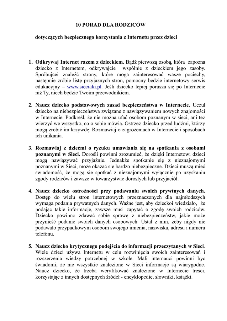 10 PORAD DLA RODZICÓW dotyczących bezpiecznego korzystania z Internetu przez dzieci 1. Odkrywaj Internet razem z dzieckiem. Bądź pierwszą osobą, która zapozna dziecko z Internetem, odkrywajcie wspólnie z dzieckiem jego zasoby. Spróbujcei znaleźć strony, które moga zainteresować wasze pociechy, następnie zróbie listę przyjaznych stron, pomocny będzie internetowy serwis edukacyjny – www.sieciaki.pl. Jeśli dziecko lepiej porusza się po Internecie niż Ty, niech będzie Twoim przewodnikiem. 2. Naucz dziecko podstawowych zasad bezpieczeństwa w Internecie. Uczul dziecko na niebezpieczeństwa związane z nawiązywaniem nowych znajomości w Internecie. Podkreśl, że nie można ufać osobom poznanym w sieci, ani też wierzyć we wszystko, co o sobie mówią. Ostrzeż dziecko przed ludźmi, którzy mogą zrobić im krzywdę. Rozmawiaj o zagrożeniach w Internecie i sposobach ich unikania. 3. Rozmawiaj z dziećmi o ryzuku umawiania się na spotkania z osobami poznanymi w Sieci. Dorośli powinni zrozumieć, że dzięki Internetowi dzieci mogą nawiązywać przyjaźnie. Jednakże spotkanie się z nieznajomymi poznanymi w Sieci, może okazać się bardzo niebezpieczne. Dzieci muszą mieć swiadomość, że mogą sie spotkać z nieznajomymi wyłącznie po uzyskaniu zgody rodziców i zawsze w towarzystwie dorosłych lub przyjaciół. 4. Naucz dziecko ostrożności przy podawaniu swoich prywtnych danych. Dostęp do wielu stron internetowych przeznaczonych dla najmłodszych wymaga podania prywatnych danych. Ważne jest, aby dzieckoi wiedziało, że podając takie informacje, zawsze musi zapytać o zgodę swoich rodziców. Dziecko powinno zdawać sobie sprawę z niebezpieczeństw, jakie może przynieść podanie swoich danych osobowych. Ustal z nim, żeby nigdy nie podawało przypadkowym osobom swojego imienia, nazwiska, adresu i numeru telefonu. 5. Naucz dziecko krytycznego podejścia do informacji przeczytanych w Sieci. Wiele dzieci używa Internetu w celu rozwinięcia swoich zainteresowań i rozszerzenia wiedzy potrzebnej w szkole. Mali internauci powinni byc świadomi, że nie wszystkie znalezione w Sieci informacje są wiarygodne. Naucz dziecko, że trzeba weryfikować znalezione w Internecie treści, korzystając z innych dostępnych źródeł - encyklopedie, słowniki, książki. 6. Bądź wyrozumiały dla swojego dziecka. Często zdarza się, że dzieci przypadkowo znajdują się na stronach adresowanych do dorosłych. Bywa, że w obawie przed karą, boją się do tego przyznać. Ważne jest, żeby dziecko Ci ufało i mówiło o tego typu sytuacjach, by wiedziało, że zawsze kiedy poczuje się niezręcznie, coś je zawstydzi lub przestraszy, może się do Ciebie zwrócić. 7. Zgłszaj nielegalne i szkodliwe treści. Wszyscy musimy wziąć odpowiedzialność za niewłaściwe czy nielegalne treści w Internecie. Nasze działania pomogą likwidować np. zjawisko pornografii dziecięcej rozpowszechnianej przy użyciu stron internetowych, chatów, e-maila itp. Nielegalne treści mozna zgłaszać na policję lub do współpracującego z nią punktu kontaktowego ds. zwalczania nielegalnych treści w Internecie – Hotline`u (www.dyzurnet.pl). Hotline kooperuje również z operatorami telekomunikacyjnycmi i serwisami w celu doprowadzenia do usunięcia nielegalnych materiałów z Sieci. 8. Zapoznaj dzieci z NETYKIETĄ – KODEKS DOBREGO ZACHOWANIA W INTERNECIE. Przypominaj dzieciom o zasadach dobrego wychowania. W każdej dziedzinie naszego życia, podobnie więc w Internecie, obowiązują takie reguły: powinno sie być miłym, używać odpowiedniego słownictwa. Zasady Netykiety zwolno czytać nie swoich e-maili, kopiować zastrzeżonych materiałów. 9. Poznaj sposób korzystania z Internetu przez Twoje dziecko. Przyjrzyj się jak twoje dziecko korzysta z Internetu, jakie storony lubi oglądać i jak zachowuje zię w Sieci. Staraj sie poznać znajomych, z którymi dziecko koresponduje za pośrednictwem Internetu. Ustalcie zasady korzystania z Sieci oraz zasady postepowania w razie nietypowych sytauacji. 10.Pamiętaj, że pozytywne strony Internetu przeważają nad jego negatywnymi stonami. Internet jest doskonałym źródłem wiedzy, jak również dostarczycielem rozrywki. Pozwól swojemu dziecku w świadomy i bezpieczny sposób w pełni korzystać z oferowanego przez Sieć bogactwa. Portal Sieciaki.pl proponuje, aby rodzice zawarli ze swoim dzieckiem umowę dotyczącą korzystania przez nie z Internetu. Warunkiem skuteczności funkcjonowania takiej umowy jest dobre porozumienie rodzica i dziecka. Dziecko powinno odczuwać, że jest współautorem tej umowy i że jego zdanie jest brane pod uwagę. Należy z dzieckiem rozmawiać o korzyściach i zagrożeniach związanych z korzystania z Internetu oraz organizacji czasu na obowiązki i przyjemności w ciągu dnia. Rezultatem takiej dyskusji może być w następujący sposób spisana umowa: NASZA UMOWA O INTERNECIE Zasady, które ustaliliśmy wspólnie z rodzicami odnośnie korzystania przeze mnie z internetu. 1. Jeśli podczas korzystania Internetu coś mnie zaniepokoi lub przestraszy rozłączę się i jak najszybciej opowiem Wam o tej sytuacji. 2. Nie będę podawać nikomu w internecie swojego prawdziwego imienia i nazwiska, ani żadnych innych danych, takich jak adres, numer telefonu, nazwa i adres mojej szkoły. 3. Bez Waszej zgody nie spotkam sie z nikim, kogo poznałem porzez Internet. Powiadomię Was, jesli ktokolwiek zaproponuje mi spotkanie. 4. Nie będę odpowiadać na obraźliwe i agresywne wiadomości. Obiecuję, że sam w czasie korzystania z Sieci nie będę posługiwać sie wulgarnym językiem. Data i miejsce Podpis Twojego dziecka Jako rodzice czujemy sie odpowiedzialni za przekazanie Ci zasadbezpiecznego korzystania z Internetu. Chcemy, abyś stał sie świadomym i odpowiedzialnym użytkownikiem Sieci. 1. Zależy nam na tym, abyś korzystał z Internetu i interesuje nas w jaki sposób spędzasz w nim czas. 2. Chcem