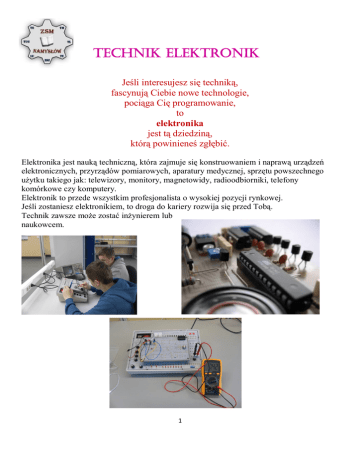 technik elektronik Jeśli interesujesz się techniką, fascynują Ciebie nowe technologie, pociąga Cię programowanie, to elektronika jest tą dziedziną, którą powinieneś zgłębić. Elektronika jest nauką techniczną, która zajmuje się konstruowaniem i naprawą urządzeń elektronicznych, przyrządów pomiarowych, aparatury medycznej, sprzętu powszechnego użytku takiego jak: telewizory, monitory, magnetowidy, radioodbiorniki, telefony komórkowe czy komputery. Elektronik to przede wszystkim profesjonalista o wysokiej pozycji rynkowej. Jeśli zostaniesz elektronikiem, to droga do kariery rozwija się przed Tobą. Technik zawsze może zostać inżynierem lub naukowcem. 1 Charakterystyka zawodu Elektronika jest nauką techniczną, która zajmuje konstruowaniem i naprawą urządzeń elektronicznych, przyrządów pomiarowych, aparatury medycznej, sprzętu powszechnego użytku takiego jak: telewizory, monitory, magnetowidy, radioodbiorniki, telefony komórkowe czy komputery. Zajmuje się instalacją, montażem, konserwacją i naprawą aparatury i urządzeń elektronicznych. Jest też odpowiedzialny za organizację pracy w placówkach badawczo-rozwojowych, zakładach wytwórczych i naprawczych oraz w innych gałęziach przemysłu i jednostkach, gdzie są szeroko stosowane urządzenia elektroniczne. Technik elektronik może zajmować się serwisem urządzeń elektrotechnicznych i elektronicznych. Już dzisiaj pomyśl o tym, co chcesz robić w przyszłości! Dlaczego warto wybrać ten zawód? Postęp w dziedzinie elektroniki i technologii elektronicznej oraz nasycenie produktami różnych sfer działalności ludzkiej, wymaga istnienia licznej kadry specjalistów. Jednym z nich jest właśnie technik elektronik. Jest to zawód przyszłości. W chwili obecnej nie ma zbyt wielu urządzeń, w których nie znalazłaby się odrobina elektroniki. Jest ona w sprzęcie powszechnego użytku: w pralkach, lodówkach, zmywarkach, telewizorach, monitorach, samochodach, komputerach telefonach komórkowych aparatach fotograficznych, kamerach 2 Technik elektronik może wykonywać prace techniczne indywidualnie lub zespołowo, a po uzyskaniu doświadczenia zawodowego pełnić funkcje mistrzów i kierowników zespołów pracowniczych. 3 Jakie możliwości daje zawód technik elektronik Zawód technik elektronik, to zawód przyszłości, dający wiele wyzwań i możliwości samorealizacji. Obecnie ze względu na bardzo szerokie zastosowanie elektroniki w wielu dziedzinach życia, elektronik powinien śledzić rozwój nowych technologii, a przede wszystkim doskonalić swoją wiedzę po to, aby stać się dobrym fachowcem w swojej dziedzinie. Elektronik to człowiek wszechstronny, który nie tylko zna się na sprzęcie, ale także na oprogramowaniu. Musi być gotowy do podejmowania nowych zadań, wyzwań i doświadczeń. 4 Moje umiejętności zawodowe Głównym celem kształcenia w zawodzie jest przygotowanie wykwalifikowanej kadry techników To oni znajdują zatrudnienie przede wszystkim w przemyśle elektronicznym, oraz w innych gałęziach przemysłu i w usługach, w których wykonywanie zawodu technika wymaga znajomości elektroniki. Elektronik to profesjonalista o wysokiej pozycji rynkowej, zwłaszcza elektronik konstruktor Jeśli zdecydowałeś się zostać technikiem elektronikiem, to musisz mieć świadomość tego, że jest to zawód stawiający sporo wymagań. Elektronika jest symbolem nowoczesności i postępu. To nie tylko odpowiednio połączone elementy elektroniczne, ale także programy komputerowe sterujące pracą większości urządzeń elektronicznych. Pamiętaj! Technik elektronik to zawód z przyszłością, rozwijający się dynamicznie w związku z zastosowaniem elektroniki zarówno w urządzeniach medycznej, komputerach jak i w urządzeniach gospodarstwa domowego. 5 Co będziesz umiał jako technik elektronik? 6 tytuł potwierdzająCy kwalifikaCje zawodowe Technik elektronik w 4-letnim cyklu kształcenia zdobywa 2 kwalifikacje zawodowe: 1. Wykonywanie instalacji urządzeń elektronicznych 2. Eksploatacja urządzeń elektronicznych Po zdobyciu OBYDWU KWALIFIKACJI I UKOŃCZENIU SZKOŁY uczeń OTRZYMUJE TYTUŁ: 7 kwalifikaCja „Wykonywanie instalacji urządzeń elektronicznych” Po zdobyciu kwalifikacji „Wykonywanie instalacji urządzeń elektronicznych” potrafi 1. Instalować urządzenia elektroniczne 2. Konserwować instalacje urządzeń elektronicznych. Umiesz: określać funkcje oraz zastosowanie urządzeń elektronicznych, wchodzących w skład telewizji satelitarnej i kablowej, sieci komputerowych, sieci automatyki przemysłowej, wykonywać instalację natynkową i podtynkową, rozpoznawać urządzenia na podstawie wyglądu, oznaczeń oraz symboli, przygotowywać kable i przewody elektryczne do wykonania instalacji, instalować urządzenia elektroniczne, uruchamiać zainstalowane urządzenia elektroniczne, wykonywać okresowe przeglądy oraz konserwację instalacji urządzeń elektronicznych, lokalizować uszkodzenia instalacji urządzeń elektronicznych, wymieniać uszkodzone podzespoły urządzeń elektronicznych. 8 kwalifikacja ”Eksploatacja urządzeń elektronicznych” Po zdobyciu kwalifikacji ”Eksploatacja urządzeń elektronicznych” umiesz użytkować i obsługiwać urządzenia elektroniczne: instalować oprogramowanie specjalistyczne w urządzeniach elektronicznych, programować urządzenia elektroniczne, oceniać stan techniczny urządzeń elektronicznych lokalizować uszkodzenia, wymieniać uszkodzone podzespoły, uruchamiać zainstalowane urządzenia dobierać części i podzespoły do naprawy, korzystając z katalogów i dokumentacji technicznej 9 Zadania Zawodowe czytanie i wykonywanie schematów ideowych, blokowych oraz montażowych układów i urządzeń elektronicznych interpretowanie zjawisk i stosowanie praw z zakresu elektrotechniki i elektroniki posługiwanie się instrukcjami obsługi i dokumentacją serwisową urządzeń elektronicznych, katalogam