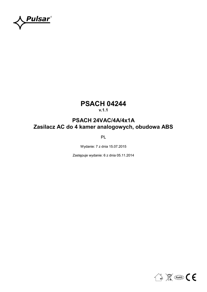 PSACH 04244 v.1.1 PSACH 24VAC/4A/4x1A Zasilacz AC do 4 kamer analogowych, obudowa ABS PL Wydanie: 7 z dnia 15.07.2015 Zastępuje wydanie: 6 z dnia 05.11.2014 www.pulsar.pl PSACH04244 Cechy zasilacza: wyjście zasilania 4x 1A/24V AC lub 27V AC do zasilania 4 kamer analogowych napięcie zasilania 230V AC 4 wyjścia niezależnie zabezpieczone bezpiecznikami 1A możliwość wyboru bezpiecznika za pomocą zworki: topikowy lub polimerowy PTC wyjście techniczne FPS sygnalizacji awarii zabezpieczenia: przeciwzwarciowe SCP przeciążeniowe OLP termiczne OHP antysabotażowe obudowa hermetyczna IP 65 gwarancja – 2 lata od daty produkcji Przykład zasilania 4 kamer analogowych. Regulacja 24V lub 27V AC, 4 x 1A niezależnie dla każdego wyjścia AUX. Schemat poglądowy zastosowania zasilacza. SPIS TREŚCI: 1. Opis techniczny. 1.1. Opis ogólny 1.2. Schemat blokowy 1.3. Opis elementów 1.4. Parametry techniczne 2. Instalacja. 2.1. Wymagania 2.2. Procedura instalacji 3. Sygnalizacja pracy. 3.1. Wyjście techniczne 4. Obsługa oraz eksploatacja. 4.1. Przeciążenia lub zwarcie 4.2. Konserwacja 2 www.pulsar.pl PSACH04244 1. Opis techniczny. 1.1. Opis ogólny. Zasilacz AC/AC PSACH 04244 przeznaczony jest do zasilania kamer analogowych lub innych urządzeń wymagających napięcia o wartości 24V AC lub 27V AC i wydajności całkowitej 4A@24V AC. Zasilacz posiada 4 wyjścia niezależnie zabezpieczone bezpiecznikami topikowymi lub polimerowymi PTC. Zakres napięcia wyjściowego regulowany jest skokowo za pomocą odpowiednich zworek, niezależnie dla każdego wyjścia AUX. Zasilacz umieszczony jest w obudowie plastikowej (ABS), natynkowej wyposażonej w mikroprzełącznik sygnalizujący otwarcie drzwiczek (czołówki). 1.2. Schemat blokowy. Rys.1. Schemat blokowy zasilacza. 1.3. Opis elementów i złącz zasilacza. Tab.1. Zaciski i elementy LB4/24V/27V/AW- listwa bezpiecznikowa Element nr Opis elementów LB4/24V/27V/AW [rys. 2] [Rys. 2] [1] L1÷L4 - Diody LED (zielone) sygnalizują stan wyjścia L1=AUX1 itd. [2] F1÷F4 bezpieczniki w obwodach AUX, F1=AUX1 itd. [3] COM-U1-U2 Wejście zasilania AC (wymagana separacja transformatorowa) [4] AUX1÷AUX4 – wyjścia, wspólny zacisk COM [5] LFPS czerwona dioda sygnalizująca awarię jednego wyjść (zadziałanie bezpiecznika) FPS wyjście sygnalizujące awarię jednego z wyjść, typ OC (stan normalny L, awaria: [6] hi-Z) Zworka zmiany rodzaju bezpiecznika PTC/ topikowy: Fx Fx.x założona zworka Fx, wybrany bezpiecznik topikowy [7] Fx Fx.x założona zworka Fx.x, wybrany bezpiecznik polimerowy Zworka zmiany napięcia wyjściowego AUX (dla każdego wyjścia niezależnie): U2 U1 założona zworka U1, napięcie na wyjściu AUXx= 24V AC [8] U2 U1 założona zworka U2, napięcie na wyjściu AUXx= 27V AC 3 www.pulsar.pl PSACH04244 Rys.2. Widok listwy LB4/24/27/AW. Tabela 2. Elementy zasilacza. Element nr Opis [Rys. 3] [1] Transformator separacyjny [2] Listwa bezpiecznikowa LB4/24V/27V/AW (tab. 1) [3] TAMPER, styk sygnalizacji antysabotażowej (NC) [4] F1 bezpiecznik w obwodzie zasilania (230V AC, PRI) [5] L-N złącze zasilania 230V AC, Złącze ochrony PE Rys.3. Widok zasilacza. 1.4. Parametry techniczne: - parametry elektryczne (tab.3) - parametry mechaniczne (tab.4) - bezpieczeństwo użytkowania (tab.5) - parametry eksploatacyjne (tab.6) 4 www.pulsar.pl PSACH04244 Parametry elektryczne (tab. 3). Napięcie zasilania Pobór prądu Częstotliwość zasilania Moc zasilacza S Napięcie wyjściowe Zakres nastawy napięcia Prąd wyjściowy Zabezpieczenie przed zwarciem SCP Zabezpieczenie przed przeciążeniem OLP Zabezpieczenie przepięciowe Zabezpieczenie termiczne Zabezpieczenie antysabotażowe TAMPER sygnalizujące otwarcie obudowy zasilacza Wyjścia techniczne: - FPS wyjście sygnalizujące awarię jednego z wyjść AUX (zadziałanie bezpiecznika) Sygnalizacja optyczna: diody LED L1÷L4 (zielone) Dioda LED LFPS (czerwona) Bezpiecznik F Bezpiecznik F1÷F4 Parametry mechaniczne (tab. 4). Wymiary obudowy Mocowanie Waga netto/brutto Obudowa Zamykanie Złącza Uwagi 230V AC (-15%/+10%) 0,5A max. 50Hz 100VA max. U1 : 23V÷28V AC (100% obciążenia ÷ 0% obciążenia) U2 : 25,5V÷31,5V AC (100% obciążenia ÷ 0% obciążenia) U1/U2 (wybierane zworką) 4x 1A Σ4,0A@24V AC max lub 4x0,9A Σ3,7A@27V AC max 4x F 1A bezpiecznik topikowy lub PTC 1A - uszkodzenie bezpiecznika topikowego wymaga wymiany wkładki topikowej obwód AC 24V: 4x F 1A lub PTC 1A obwód AC 230V: 1x T 1A warystory wewnętrzne transformatora - microswitch, styki NC (obudowa zamknięta), 0,5A@50V DC (max.) - typ OC, 50mA max. stan normalny: poziom L (0 V) stan awarii: poziom hi-Z - stan wyjść AUX1…AUX4 stan normalny = świeci stan awarii= nie świeci - sygnalizacja awarii min. jednego wyjścia AUX stan normalny = nie świeci stan awarii = świeci T 1A/250V F 1A/ 250V lub PTC 1A 160 x 160 x 90 (WxHxD) [mm] (+/- 2) 126 x 145 x Φ 4 x 4szt (WxH) 2,5/2,6 kg ABS, IP65, kolor jasny szary Wkręt walcowy x 4 (z czoła) Zasilanie: Φ0,63-2,50 (AWG 22-10) Wyjścia: Φ0,63-2,50 (AWG 22-10) Wyjscie TAMPER: przewody, 25cm Obudowa posiada demontowana płytę montażowa z układami zasilacza. Bezpieczeństwo użytkowania (tab.5). Klasa ochronności PN-EN 60950-1:2004 Stopień ochrony PN-EN 60529: 2002 (U) I (pierwsza) IP65 (wymagany montaż dławic): M12 (Ф 3-6,5mm) x 2szt M16 (Ф 4-8mm) x 2szt Wytrzymałość elektryczna izolacji: - pomiędzy obwodem wejściowym (sieciowym) a obwodami wyjściowymi zasilacza (I/P-O/P) - pomiędzy obwodem wejściowym a obwodem ochronnym PE (I/P-FG) - pomiędzy obwodem wyjściowym a obwodem ochronnym PE (O/P-FG) Rezystancja izolacji: - pomiędzy obwodem wejściowym a wyjściowym lub ochronnym Parametry eksploatacyjne (tab.6). Temperatura pracy Temperatura składowania Wilgotność względna Wibracje w czasie pracy Udary w czasie pracy Nasłonecznienie bezpośrednie Wibracje i udary w czasie transportu 3000V AC min. 1500V AC min. 500V AC min. 100 MΩ, 500V/DC -25ºC...+40ºC -25ºC...+6