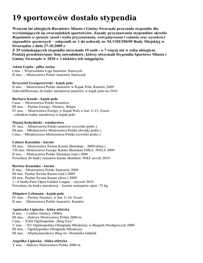 19 sportowców dostało stypendia Wzorem lat ubiegłych Burmistrz Miasta i Gminy Swarzędz przyznała stypendia dla wyróżniających się swarzędzkich sportowców. Zasady przyznawania stypendiów określa Regulamin w sprawie zasad i trybu przyznawania, wstrzymywania i cofania oraz wysokości stypendiów sportowych – załącznik nr 1 do uchwały nr XLVIII/290/09 Rady Miejskiej w Swarzędzu z dnia 27.10.2009 r. Z 29 wnioskujących stypendia otrzymało 19 osób - o 7 więcej niż w roku ubiegłym. Poniżej przedstawiamy listę zawodników, którzy otrzymali Stypendia Sportowe Miasta i Gminy Swarzędz w 2010 r. i niektóre ich osiągnięcia. Adam Gajda - piłka nożna I msc – Wojewódzka Liga Juniorów Starszych II msc. – Mistrzostwa Polski Juniorów Starszych Krzysztof Grzegorzewski - kajak polo II msc. – Mistrzostwa Polski Juniorów w Kajak Polo, Kaniów 2009 Zakwalifikowany do kadry narodowej juniorów w kajak polo na 2010 Barbara Knade - kajak-polo I msc. – Mistrzostwa Polski Seniorów III msc. – Puchar Europy- Niemcy, Belgia IV msc. – Mistrzostwa Europy w Kajak Polo w kat. U-21, Essen - członkini kadry narodowej w kajak-polo Maciej Kobyliński - wioślarstwo IV msc. – Mistrzostwa Polski seniorów (czwórki podw.) III msc. - Młodzieżowe Mistrzostwa Polski (dwójki podw.) I msc. - Młodzieżowe Mistrzostwa Polski (czwórki podw.) Łukasz Kuzemko - karate III msc. – Mistrzostwa Świata Karate Shotokan – 2009 (druż.) VII msc. Mistrzostwa Europy Karate Shotokan ESKA -WELS 2009 II msc. – Mistrzostwa Polski Shotokan (ind.) 2009 Powołany do kadry seniorów karate shotokan /WKF na rok 2010 Bartosz Kuzemko - karate II msc. - Mistrzostwa Polski Seniorów 2009 III msc. Puchar Świata Karate (ind.) 2009 III msc. Puchar Świata Karate (druż.) 2009 1 / 4 finału Paris Open Golden League – styczeń 2010 Powołany do kadry narodowej – kumite senioprów open -75 kg Zbigniew Lehmann - kajak-polo IV msc. – Puchar Niemiec, w kat. U-16, Essen II msc. – Mistrzostwa Polski Juniorów, Kaniów Agnieszka Lipiecka - lekka atletyka II msc. – Cottbus Niemcy 1000m III msc. – Halowe Mistrzostwa Polski 2000 m I msc. – XXII Ogólnopolski „Bieg Ewy” V msc. – XV Ogólnopolska Olimpiada Młodzieży w Biegach Przełajowych 3000 III msc. – Ogólnopolska Olimpiada Młodzieży III msc. – Międzynarodowy Bieg św. Dominika Gdańsk Angelika Lipiecka - lekka atletyka V msc. – Halowe Mistrzostwa Polski 2000 m III msc. – Cottbus Niemcy Miting 1000m II msc. – Miting Ogólnopolski 2000m VI msc. – XV Ogólnopolska Olimpiada Mł. W Biegach Przełajowych 3000m VI msc. – Ogólnopolska Olimpiada Młodzieży 3000 m Kacper Majchrzak - pływanie II msc. – Mistrzostwa Polski Juniorów - Wicemistrz Polski na dystansie 50 m stylem dowolnym - Finalista Mistrzostw Polski na 100m stylem dowolnym i 200m stylem zmiennym Filip Mytko - kajak-polo II msc. – Puchar Niemiec – Essen , 2009 IV msc. Mistrzostwa Polski Juniorów, 2009 Krzysztof Paterka - pływanie I msc. – Mistrzostwa Świata w Pływaniu Osób Niepełnosprawnych – Rio de Janeiro, 2009 IV msc. – Mistrzostwa Europy w Reykjaviku 2009 IV msc – Igrzyska Paraolimpijskie w Pekinie 2008 Ustanowienie rekordu świata: 1.10,52 na 100m stylem klasycznym Katarzyna Pic - żeglarstwo, match-racing olimpijskie I msc. – Mistrzostwa Polski Kobiet (klasa olimpijska) Mistrzyni Polski 2009 V msc. – Puchar Świata Kobiet w Moskwie I msc. – Polish Match Tour, Regaty w Poznaniu VI msc. – Mistrzostwa Polski w kat. Open (z załogami męskimi) Magdalena Pic - żeglarstwo III msc. – Meczowe Mistrzostwa Polski w kat. Seniorek (klasa olimpijska) III msc. – Meczowe Mistrzostwa Polski w kat. młodzieżowców (klasa olimpijska) VII msc. –Mistrzostwa Polski Klas Olimpijskich w kat. Młodzieżowców III msc. – Regaty Pucharu Świata , Gdynia Sailing Days Olga Rusinek - pływanie synchroniczne Reprezentantka Polski w kategorii Juniorek i Seniorek I msc. – Międzynar. Zawody Poznań Cup Open I msc. - Mistrzostwa Polski III msc. - Mistrzostwa Polski (solo- juniorki) I msc. – Puchar Polski Open II msc. – Puchar Polski Open (duet) II msc. - Międzynar. Zawody Poznań Cup Open (team) I msc. - Mistrzostwa Polski II msc. - Mistrzostwa Polski I msc. – Bratysława Angelika Stefańska - lekka atletyka I msc. – Ogólnopolska Olimpiada Młodzieży, Kraków 2009 I msc. w tabelach juniorek mł na dystansach 800 m, 1000 m, 1500 m zawodniczka kadry wojewódzkiej juniorów i kadry narodowej Monika Szurlej - wioślarstwo IV msc. – Regaty Nadziei Olimpijskich V msc. – Ogólnopolska Olimpiada Młodzieży II msc. – Srebrny Medal – Długodystansowe Mistrzostwa Polski Monika Wieczorkiewicz - lekka atletyka I msc. – Akademickie Mistrzostwa Polski w biegu krótkim sztafet. II msc. – Mistrzostwa Polski Seniorów w biegu rozstawnym 4x100 m IV msc. – Młodzieżowe Mistrzostwa Polski bieg na 100 m III msc. – Ogólnopolski Miting kwalifikacyjny 100 m IV msc. – Międzynar. Miting W. Komara i T. Ślusarskiego 100 m II msc. – XII Miting Kwalifikacyjny 100 m i 200m Reprezentantka Polski w kat. młodzieżowej Zyta Zydorczak - kajakarstwo II msc. – Młodzieżowe Mistrzostwa Polski w kajakarstwie K-2 500m III msc. - Młodzieżowe Mistrzostwa Polski w kajakarstwie K-4 500m