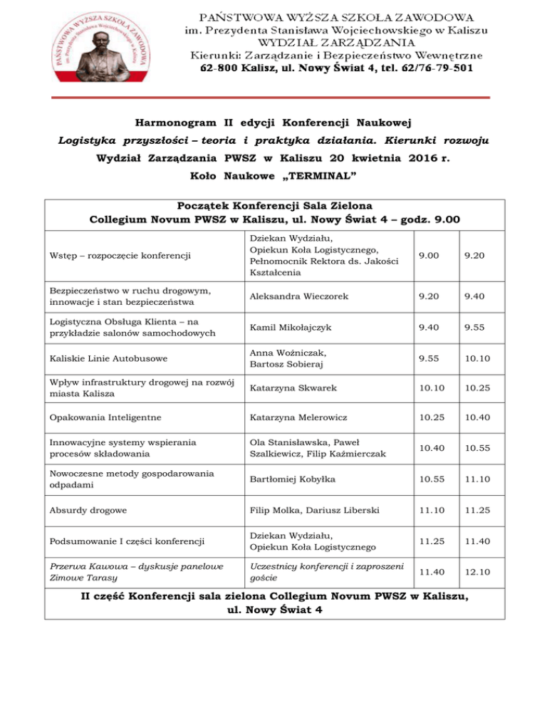 Harmonogram II edycji Konferencji Naukowej Logistyka przyszłości – teoria i praktyka działania. Kierunki rozwoju Wydział Zarządzania PWSZ w Kaliszu 20 kwietnia 2016 r. Koło Naukowe „TERMINAL” Początek Konferencji Sala Zielona Collegium Novum PWSZ w Kaliszu, ul. Nowy Świat 4 – godz. 9.00 Wstęp – rozpoczęcie konferencji Dziekan Wydziału, Opiekun Koła Logistycznego, Pełnomocnik Rektora ds. Jakości Kształcenia 9.00 9.20 Bezpieczeństwo w ruchu drogowym, innowacje i stan bezpieczeństwa Aleksandra Wieczorek 9.20 9.40 Logistyczna Obsługa Klienta – na przykładzie salonów samochodowych Kamil Mikołajczyk 9.40 9.55 Kaliskie Linie Autobusowe Anna Woźniczak, Bartosz Sobieraj 9.55 10.10 Wpływ infrastruktury drogowej na rozwój miasta Kalisza Katarzyna Skwarek 10.10 10.25 Opakowania Inteligentne Katarzyna Melerowicz 10.25 10.40 Innowacyjne systemy wspierania procesów składowania Ola Stanisławska, Paweł Szalkiewicz, Filip Kaźmierczak 10.40 10.55 Nowoczesne metody gospodarowania odpadami Bartłomiej Kobyłka 10.55 11.10 Absurdy drogowe Filip Molka, Dariusz Liberski 11.10 11.25 Podsumowanie I części konferencji Dziekan Wydziału, Opiekun Koła Logistycznego 11.25 11.40 Przerwa Kawowa – dyskusje panelowe Zimowe Tarasy Uczestnicy konferencji i zaproszeni goście 11.40 12.10 II część Konferencji sala zielona Collegium Novum PWSZ w Kaliszu, ul. Nowy Świat 4 Raben Group Polska - oddział Kalisz 25 Lat Grupy Raben Anna Lesień-Fengier, Agnieszka Hałas 12.10 12.25 DHL EXPRESS (POLAND) SP. Z O. O. Prezentacja Firmy DHL Sławomira Dropińska, Tomasz Biskup 12.25 12.40 Big Star Limited Sp. z o.o. Proces dystrybucji towaru za pomocą systemu WMS Konrad Gil 12.40 12.55 DPD Polska Jak działa nowoczesna sortownia w firmie kurierskiej Kamil Bartosiński 12.55 13.10 MAHLE Behr Ostrów Wielkopolski Logistyka w branży automotive Magdalena Czekalska 13.10 13.25 Bundy Refrigeration Sp. z o.o. Prezentacja Firmy Bundy Refrigeration Rafał Pawliczak 13.25 13.40 COM 40 Limited, Sp. z o. o. Klaster logistyczny DD Point Com40 Jakub Utecht 13.55 14.10 Spedycja i Transport Acropol sp. z o.o. sp. komandytowa Od PWSZ do Spedycja i Transport Acropol Maciej Machajewski 14.10 14.25 Zakończenie Konferencji Dziekan Wydziału, Opiekun Koła Logistycznego 14.25 14.40