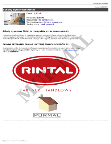 Informacje o produkcie Utworzono 02-03-2017 Schody dywanowe Rintal Cena : 1,23 zł Producent : RINTAL Dostępność : Na zamówienie Stan magazynowy : brak w magazynie Średnia ocena : brak recenzji Schody dywanowe Rintal to rzeczywisty wyraz nowoczesności, AL minimalizmu, bezpieczeństwa oraz wyjątkowego warsztatu konstruktora. Swoją oszczędną i delikatną formą przypominają dywan spływający po niewidocznych stopniach. Schody dywanowe stanowią idealną propozycję dla klientów prywatnych, architektów i osób ceniących sobie elegancję, szlachetność materiału i bezpieczeństwo. ZAMÓW BEZPŁATNY POMIAR I WYCENĘ SWOICH SCHODÓW !!! M U R -M Nasz specjalista umówi się na spotkanie z Tobą, przedstawi pełną ofertę, doradzi oraz wyceni zakres prac. Pomiar nie zobowiązuje do zakupu schodów. Wystarczy, że podasz nr telefonu na adres:e-mail: [email protected] lub na tel. 691890641 Wygenerowano w programie www.oscGold.com