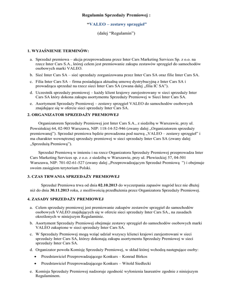Regulamin Sprzedaży Premiowej : “VALEO – zestawy sprzęgieł” (dalej “Regulamin”) 1. WYJAŚNIENIE TERMINÓW: a. Sprzedaż premiowa – akcja przeprowadzana przez Inter Cars Marketing Services Sp. z o.o. na rzecz Inter Cars S.A., której celem jest premiowanie zakupu zestawów sprzęgieł do samochodów osobowych marki VALEO. b. Sieć Inter Cars SA – sieć sprzedaży zorganizowana przez Inter Cars SA oraz filie Inter Cars SA. c. Filia Inter Cars SA – firma posiadająca aktualną umowę dystrybucyjną z Inter Cars SA i prowadząca sprzedaż na rzecz sieci Inter Cars SA (zwana dalej „filia IC SA”). d. Uczestnik sprzedaży premiowej – każdy klient krajowy zarejestrowany w sieci sprzedaży Inter Cars SA który dokona zakupu asortymentu Sprzedaży Premiowej w Sieci Inter Cars SA. e. Asortyment Sprzedaży Premiowej – zestawy sprzęgieł VALEO do samochodów osobowych znajdujące się w ofercie sieci sprzedaży Inter Cars SA. 2. ORGANIZATOR SPRZEDAŻY PREMIOWEJ Organizatorem Sprzedaży Premiowej jest Inter Cars S.A., z siedzibą w Warszawie, przy ul. Powsińskiej 64, 02-903 Warszawa, NIP: 118-14-52-946 (zwany dalej „Organizatorem sprzedaży premiowanej”). Sprzedaż premiowa będzie prowadzona pod nazwą „VALEO – zestawy sprzęgieł” i ma charakter wewnętrznej sprzedaży premiowej w sieci sprzedaży Inter Cars SA (zwany dalej „Sprzedażą Premiową”). Sprzedaż Premiową w imieniu i na rzecz Organizatora Sprzedaży Premiowej przeprowadza Inter Cars Marketing Services sp. z o.o. z siedzibą w Warszawie, przy ul. Płowieckiej 57, 04-501 Warszawa, NIP: 701-02-61-527 (zwany dalej „Przeprowadzającym Sprzedaż Premiową ”) i obejmuje swoim zasięgiem terytorium Polski. 3. CZAS TRWANIA SPRZEDAŻY PREMIOWEJ Sprzedaż Premiowa trwa od dnia 02.10.2013 do wyczerpania zapasów nagród lecz nie dłużej niż do dnia 30.11.2013 roku, z możliwością przedłużenia przez Organizatora Sprzedaży Premiowej. 4. ZASADY SPRZEDAŻY PREMIOWEJ a. Celem sprzedaży premiowej jest premiowanie zakupów zestawów sprzęgieł do samochodów osobowych VALEO znajdujących się w ofercie sieci sprzedaży Inter Cars SA., na zasadach określonych w niniejszym Regulaminie. b. Asortyment Sprzedaży Premiowej obejmuje zestawy sprzęgieł do samochodów osobowych marki VALEO zakupione w sieci sprzedaży Inter Cars SA. c. W Sprzedaży Premiowej mogą wziąć udział wszyscy klienci krajowi zarejestrowani w sieci sprzedaży Inter Cars SA, którzy dokonają zakupu asortymentu Sprzedaży Premiowej w sieci sprzedaży Inter Cars SA. d. Organizator powoła Komisję Sprzedaży Premiowej, w skład której wchodzą następujące osoby: Przedstawiciel Przeprowadzającego Konkurs – Konrad Birkos Przedstawiciel Przeprowadzającego Konkurs – Witold Siedlecki e. Komisja Sprzedaży Premiowej nadzoruje zgodność wyłonienia laureatów zgodnie z niniejszym Regulaminem. f. Co dwa tygodnie od ogłoszenia sprzedaży premiowej będą ogłaszane wyniki i przekazywane nagrody kolejnym Laureatom. g. Prace Komisji Konkursowej są niejawne. h. Platformą informacyjną w ramach Sprzedaży Premiowej jest strona internetowa www.intercars.com.pl oraz www.icpremiaplus.pl , które są obsługiwana przez Przeprowadzającego Konkurs i. Informacje o organizacji Konkursu i jego przebiegu będą emitowane (ogłaszane) za pośrednictwem środków masowego przekazu, w tym: akcji mailingowej, telemarketingu, akcji sms-owych, strony internetowej. j. Nagrody w Sprzedaży Premiowej będą przyznawane zgodnie z zasadami ustalonymi poniżej. k. Nieterminowe płatności za zakupy asortymentu Sprzedaży Premiowej lub przeterminowane należności wobec Organizatora Sprzedaży Premiowej, powodują wykluczenie Uczestnika z udziału w Sprzedaży Premiowej. 5. NAGRODY a. Nagrodą w Sprzedaży Premiowej jest zestaw w postaci pokrowca na fotel oraz ochraniacza na błotnik za 1 zł (netto). Za zakup 1 zestawu sprzęgieł do samochodu osobowego firmy VALEO klient otrzyma 1 zestaw (pokrowiec na fotel i ochraniacz na błotnik) w cenie 1 zł (netto). b. Liczba zestawów nagród przyznanych Uczestnikowi Sprzedaży Premiowej zależy od ostatecznej ilości zakupionych zestawów sprzęgieł Valeo, dokonanych w czasie trwania Sprzedaży Premiowej. c. Zakupy asortymentu Sprzedaży Premiowej dokonanej przez klienta sumują się przez cały okres obowiązywania Sprzedaży Premiowej. d. Organizator Sprzedaży Premiowej zastrzega że wszelkie należności podatkowe które mogą zaistnieć w związku z przekazaniem nagród pozostają po stronie Laureata Sprzedaży Premiowej. e. Po każdych dwóch tygodniach trwania sprzedaży premiowej zostaną ogłoszeni Laureaci, tj, Uczestnicy sprzedaży premiowej, którzy w tym okresie spełnili warunki określone w pkt 5a, z zastrzeżeniem punktów 5b i 4k. W ciągu kolejnych 5 dni nagrody zostaną wysłane do Filii IC SA, celem przekazania Laureatowi. 6. ODPOWIEDZIALNOŚĆ ORGANIZATORA Odpowiedzialność Organizatora Sprzedaży Premiowej wobec Uczestników z tytułu Sprzedaży Premiowej, w żadnym przypadku nie przekroczy wartości nagród określonych w niniejszym Regulaminie. 7. REKLAMACJE I ROSZCZENIA. a. Uczestnikowi przysługuje prawo złożenia reklamacji. b. Reklamacje przyjmowane będą wyłącznie w trybie korespondencji przesłanej listem poleconym na adres Przeprowadzającego Sprzedaż Premiową z dopiskiem ”VALEO – zestawy sprzęgieł”, nie później niż do dnia 14.12.2013 r., przy czym o dotrzymaniu terminu będzie decydować data stempla pocztowego. Reklamacja zgłoszona po tym terminie nie zostanie rozpatrzona. c. Reklamacja powinna być sporządzona na piśmie i zawierać imię, nazwisko i dokładny adres Uczestnika, jak również dokładny opis przyczyny reklamacji. d. Przeprowadzający Sprzedaż Premiową rozpatrzy reklamację w terminie 7 (siedmiu) dni roboczych od daty otrzymania, przy czym okres ten może zostać wydłużony, gdy rozpoznanie reklamacji wymaga dłuższego czasu. e. Po roz