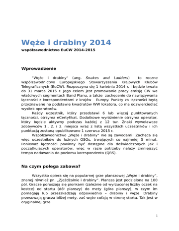 Węże i drabiny 2014 współzawodnictwo EuCW 2014-2015 Wprowadzenie "Węże i drabiny" (ang. Snakes and Ladders) to roczne współzawodnictwo Europejskiego Stowarzyszenia Krajowych Klubów Telegraficznych (EuCW). Rozpoczyna się 1 kwietnia 2014 r. i będzie trwała do 31 marca 2015 r. Jego celem jest promowanie pracy emisją CW we właściwych segmentach Band Planu, a także zachęcenie do nawiązywania łączności z korespondentami z krajów Europy. Punkty za łączności będą przyznawane na podstawie kwadratów WW lokatora, co ma odzwierciedlać wysiłek operatorów. Każdy uczestnik, który przedstawi 6 lub więcej punktowanych łączności, otrzyma eCertyfikat. Dodatkowe wyróżnienie otrzyma operator, który będzie aktywny podczas każdej z 12 tur. Znaki wywoławcze zdobywców 1., 2. i 3. miejsca wraz z listą wszystkich uczestników i ich punktacją zostaną opublikowane 1 czerwca 2015 r. Współzawodnictwo „Węże i drabiny” nie są zawodami! Zachęca się więc uczestników do luźnych QSOs, trwających co najmniej 5 minut. Ponieważ łączności powinny być dostępne dla doświadczonych jak i początkujących operatorów, więc w razie potrzeby należy zmniejszyć tempo nadawania do poziomu korespondenta (QRS). Na czym polega zabawa? Wszystko opiera się na popularnej grze planszowej „Węże i drabiny”, znanej również pn. „Zjeżdżalnie i drabiny”. Plansza jest podzielona na 100 pól. Gracze poruszają się pionkami (zależnie od wyrzuconej liczby oczek na kostce) od startu (dół planszy) do mety (góra planszy), w czym im pomagają lub przeszkadzają odpowiednio – drabiny i węże. Drabiny przesuwają gracza bliżej mety, zaś węże cofają w stronę startu. Tak jest w oryginalnej grze. 1 W naszym przypadku planszę stanowi mapa Europy, zaś polami gry są kwadraty lokatora (patrz: „Kraje Europy i kwadraty lokatora”). Drabiny i węże wywodzą się z całkowitej ilości QSOs przewidzianych dla danej tury aktywności, co jest wyjaśnione niżej (patrz: „Manager Aktywności”). Łączności mogą być nawiązywane w pasmach od 160 m do 2 m (z wyjątkiem pasm 60 m i 4 m), ale zawsze zgodnie z Band Planem 1. Regionu IARU. Łączności muszą być przeprowadzone emisją CW i muszą to być łączności bezpośrednie (nie zalicza się łączności via przemienniki czy satelity). Z daną stacją można przeprowadzić (zalogować do zabawy) jedną łączność danego dnia na danym paśmie. Do zabawy nie liczą się łączności prowadzone w grupie (aby zaliczyć taką łączność, należy opuścić grupę i przeprowadzać QSO z każdą stacją osobno). Manager Aktywności Kierownictwo EuCW wyznaczy jedną osobę, która będzie nadzorować całe współzawodnictwo aż do oficjalnego ogłoszenia wyników w czerwcu 2015 r. Decyzje podejmowane przez Managera Współzawodnictwa będą ostatecznie i nie podlegające dyskusji. Zgłoszenia mogą być składane na koniec określonej tury. Manager Współzawodnictwa będzie oceniał zgłoszenia otrzymane w ciągu czternastu (14) dni po danej turze aktywności. Będzie sprawdzał, czy zgłoszenia spełniają wymagania formalne, a wykazane łączności przeprowadzone zostały zgodnie z regulaminem i zasadami Ham Spirit’u. Nominowanie kwadratów Manager Współzawodnictwa wybierze cztery (4) aktywne w zabawie kwadraty lokatora z najniższą zanotowaną w danej turze aktywnością (tzw. kwadraty-skarby). Te kwadraty zostaną nominowane jako drabiny (tzw. kwadraty-drabiny). Jeśli będzie więcej kwadratów o takiej samej najniższej aktywności to wszystkie zostaną kwadratami-drabinami dla analizowanego okresu. W podobny sposób Manager Współzawodnictwa określi kwadratywęże. Trzy (3) kwadraty lokatora o największej zanotowanej aktywności („łatwe kwadraty”) będą określone jako węże (tzw. kwadraty-węże). Jeśli więcej niż trzy (3) kwadraty będą w jakikolwiek sposób powiązane, będą one połączone tak, by utworzyć trzy grupy kwadratów-węży. Kwadraty lokatora mogą być wężami tylko raz na trzy miesiące/ Jeśli np. dany kwadrat został wężem w jednej turze, to nie może nim być przez dwie 2 kolejne tury. Wówczas wężami będą kwadraty o kolejnej największej aktywności. Wszystkie pozostałe kwadraty, które nie będą w danej edycji ani drabinami („skarbami”), ani wężami („łatwymi”) są zwykłymi (normalnymi) kwadratami lokatora. Punktacja Każdy zgłaszający łączność w kwadracie-drabinie będzie wspinał się po drabinie otrzymując 25 pkt. za pierwszą drabinę oraz po 5 pkt. za drugą i trzecią, o ile będą to trzy różne kwadraty-drabiny. Punktowane będą maksymalnie trzy (3) kwadraty-drabiny w danej turze. Uczestnicy, którzy trafią na węża (zgłaszając łączność w tym kwadracie lokatora), będą się po nim ześlizgiwać: z najwyższej pozycji o 15 pkt., następnie o 10 pkt. i z najniższej o 5 pkt., gdzie najwyższa pozycja oznacza kwadrat lokatora o najwyższej aktywności. W danej edycji tylko jeden wąż (o najwyższej pozycji) może kąsać i tylko wtedy, gdy uczestnik bezpośrednio przed „wejściem” na węża wspiął się po drabinie. Wąż nie będzie kąsać, jeśli w danej edycji uczestnik wspiął się po drabinie. Dla pierwszych piętnastu (15) zwykłych kwadratów lokatora, otrzymuje się po 5 pkt. za każdy z trzech (3) różnych kwadratów. Liczba łączności przeprowadzonych z każdym z kwadratów jest bez znaczenia. (Patrz: Przykłady obliczania wyników). Wyniki Wyniki za daną turę zostaną ogłoszone w terminie do ostatniego dnia miesiąca kalendarzowego następującego po zakończeniu tej tury. Wyniki ogłaszane co miesiąc będą zawierały listę znaków wywoławczych uczestników, kwadraty węże i drabiny, z przypisanymi im punktami oraz znaki wywoławcze uczestników, którzy „stanęli” na kwadracie wężu i/lub drabinie. Na tej podstawie uczestnicy będą mogli samodzielnie obliczyć swoją dotychczasową pun