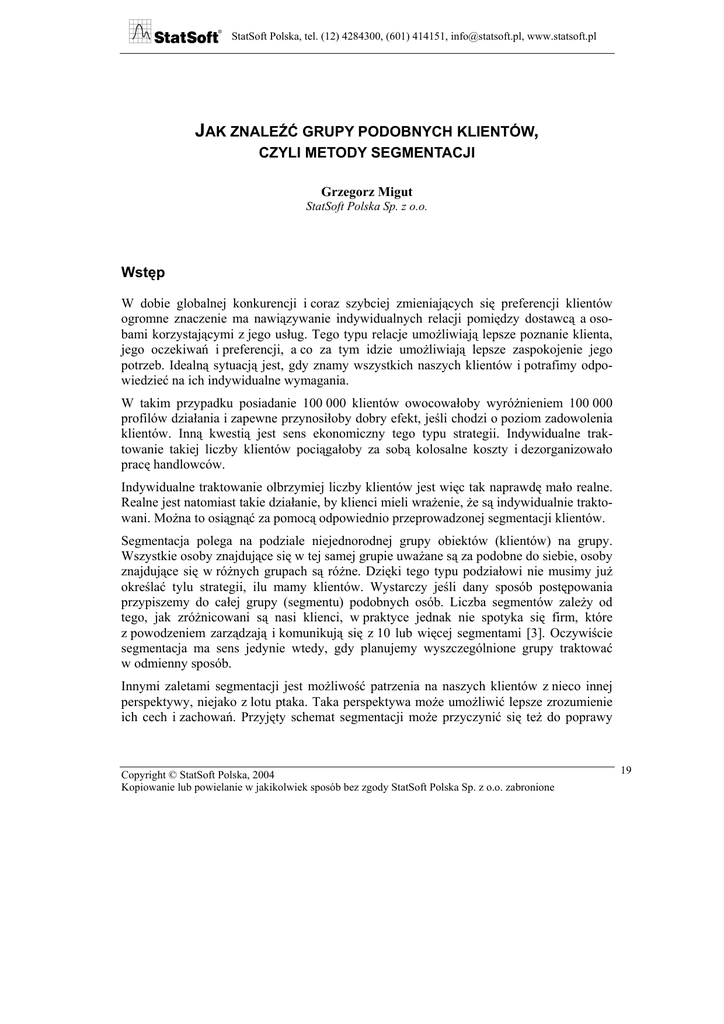 ® StatSoft Polska, tel. (12) 4284300, (601) 414151, [email protected], www.statsoft.pl JAK ZNALEŹĆ GRUPY PODOBNYCH KLIENTÓW, CZYLI METODY SEGMENTACJI Grzegorz Migut StatSoft Polska Sp. z o.o. Wstęp W dobie globalnej konkurencji i coraz szybciej zmieniających się preferencji klientów ogromne znaczenie ma nawiązywanie indywidualnych relacji pomiędzy dostawcą a osobami korzystającymi z jego usług. Tego typu relacje umożliwiają lepsze poznanie klienta, jego oczekiwań i preferencji, a co za tym idzie umożliwiają lepsze zaspokojenie jego potrzeb. Idealną sytuacją jest, gdy znamy wszystkich naszych klientów i potrafimy odpowiedzieć na ich indywidualne wymagania. W takim przypadku posiadanie 100 000 klientów owocowałoby wyróżnieniem 100 000 profilów działania i zapewne przynosiłoby dobry efekt, jeśli chodzi o poziom zadowolenia klientów. Inną kwestią jest sens ekonomiczny tego typu strategii. Indywidualne traktowanie takiej liczby klientów pociągałoby za sobą kolosalne koszty i dezorganizowało pracę handlowców. Indywidualne traktowanie olbrzymiej liczby klientów jest więc tak naprawdę mało realne. Realne jest natomiast takie działanie, by klienci mieli wrażenie, że są indywidualnie traktowani. Można to osiągnąć za pomocą odpowiednio przeprowadzonej segmentacji klientów. Segmentacja polega na podziale niejednorodnej grupy obiektów (klientów) na grupy. Wszystkie osoby znajdujące się w tej samej grupie uważane są za podobne do siebie, osoby znajdujące się w różnych grupach są różne. Dzięki tego typu podziałowi nie musimy już określać tylu strategii, ilu mamy klientów. Wystarczy jeśli dany sposób postępowania przypiszemy do całej grupy (segmentu) podobnych osób. Liczba segmentów zależy od tego, jak zróżnicowani są nasi klienci, w praktyce jednak nie spotyka się firm, które z powodzeniem zarządzają i komunikują się z 10 lub więcej segmentami [3]. Oczywiście segmentacja ma sens jedynie wtedy, gdy planujemy wyszczególnione grupy traktować w odmienny sposób. Innymi zaletami segmentacji jest możliwość patrzenia na naszych klientów z nieco innej perspektywy, niejako z lotu ptaka. Taka perspektywa może umożliwić lepsze zrozumienie ich cech i zachowań. Przyjęty schemat segmentacji może przyczynić się też do poprawy Copyright © StatSoft Polska, 2004 Kopiowanie lub powielanie w jakikolwiek sposób bez zgody StatSoft Polska Sp. z o.o. zabronione 19 ® StatSoft Polska, tel. (12) 4284300, (601) 414151, [email protected], www.statsoft.pl komunikacji w zespole handlowców. Dzięki niemu mamy możliwość spójnie i precyzyjnie określić grupy klientów, którymi jesteśmy zainteresowani. Wyniki przeprowadzonej segmentacji mogą również zasugerować działania, jakie należy podjąć w stosunku do określonych grup. Na przykład jeśli osoby znajdujące się w dwóch różnych segmentach mają bardzo podobne cechy demograficzne, a tylko jeden reprezentuje wartościowych klientów, istnieje szansa, że klienci z drugiego segmentu mogą stać się równie wartościowi, jeśli podejmiemy w stosunku do nich odpowiednie działania [5]. Wreszcie wyniki analiz są znakomitym punktem wyjścia do dalszych analiz data mining. Analizy takie (np. prognozy sprzedażowe) wykonujemy już nie dla całego niejednorodnego zbioru klientów, lecz co jest bardziej skuteczne i poprawne merytorycznie, dla wybranego jednorodnego segmentu. Oczywiście dokonując segmentacji klienta, możemy brać pod uwagę wiele różnych związanych z nim aspektów. Różne rodzaje segmentacji zostały szczegółowo wymienione w artykule Analiza danych i CRM - przegląd, znajdującym się w niniejszym opracowaniu. Metody data mining w segmentacji klientów Podczas budowy modelu data mining zwykle podajemy na wstępie dane reprezentujące rozpoznane wcześniej wzorce (grupy), które model ma następnie odtwarzać i na tej podstawie klasyfikować do danej grupy nowe obserwacje. W przypadku segmentacji sytuacja jest inna. Na wstępie analizy nie dysponujemy żadną informacją, jakie segmenty występują w danych, ani też ile jest tych segmentów. Wiedzę tę pragniemy dopiero zdobyć w wyniku analizy. Tak sformułowane zadanie analityczne wymaga zastosowania jednej z metod nieukierunkowanego data mining. Najbardziej popularnymi metodami stosowanymi do segmentacji są metody analizy skupień oraz sieci neuronowe Kohonena (SOM). Analiza skupień - metoda k-średnich i EM Celem analizy skupień (cluster analysis) jest wyodrębnienie ze zbioru danych obiektów, które byłyby podobne do siebie, i łączenie ich w grupy. W wyniku działania tej analizy z jednego niejednorodnego zbioru danych otrzymujemy grupę kilku jednorodnych zbiorów. Obiekty znajdujące się w tym samym zbiorze uznawane są za „podobne do siebie”, obiekty z różnych zbiorów traktowane są jako „niepodobne”. Pojęcie analizy skupień obejmuje faktycznie kilka różnych algorytmów klasyfikacji. Do najważniejszych należy zaliczyć metodę k-średnich oraz EM. Stosowanie metody k-średnich wymaga od nas podania liczby grup, na które zostanie podzielony wejściowy zbiór danych. Jedna z wersji tej metody polega na losowym wyborze k obiektów z analizowanego zbioru i uznania ich za środki k grup. Każdy z pozostałych obiektów jest przypisywany do grupy o najbliższym mu środku. Następnie oblicza się nowe środki każdej podgrupy na podstawie średnich arytmetycznych ze współrzędnych zawartych w nich obiektów. W kolejnym kroku następuje przegrupowanie elementów grup, każdy obiekt jest przesuwany do tej grupy, do której środka ma najbliżej. Procedurę 20 Copyright © StatSoft Polska, 2004 Kopiowanie lub powielanie w jakikolwiek sposób bez zgody StatSoft Polska Sp. z o.o. zabronione ® StatSoft Polska, tel. (12) 4284300, (601) 414151, [email protected], www.statsoft.pl tę powtarzamy do momentu, gdy w danej iteracji żaden z obiektów nie zmieni swojej podgr