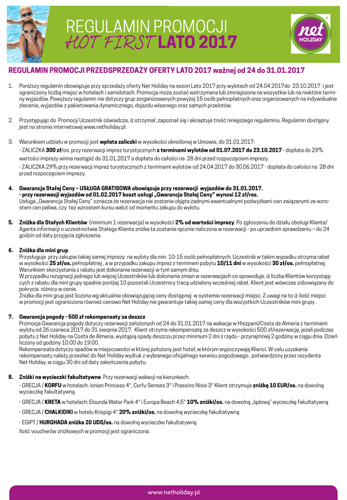 REGULAMIN PROMOCJI REGULAMIN PROMOCJI PRZEDSPRZEDAŻY OFERTY LATO 2017 ważnej od 24 do 31.01.2017 1. Poniższy regulamin obowiązuje przy sprzedaży oferty Net Holiday na sezon Lato 2017 przy wylotach od 24.04.2017do 23.10.2017 i jest ograniczony liczbą miejsc w hotelach i samolotach. Promocja może zostać wstrzymana lub zmniejszona na wszystkie lub na niektóre terminy wyjazdów. Powyższy regulamin nie dotyczy grup zorganizowanych powyżej 15 osób pełnopłatnych oraz organizowanych na indywidualne zlecenie, wyjazdów z pakietowania dynamicznego, dojazdu własnego oraz samych przelotów. 2. Przystępując do Promocji Uczestnik oświadcza, iż otrzymał, zapoznał się i akceptuje treść niniejszego regulaminu. Regulamin dostępny jest na stronie internetowej www.netholiday.pl. 3. Warunkiem udziału w promocji jest wpłata zaliczki w wysokości określonej w Umowie, do 31.01.2017: - ZALICZKA 300 zł/os. przy rezerwacji imprez turystycznych z terminami wylotów od 01.07.2017 do 23.10.2017 - dopłata do 29% wartości imprezy winna nastąpić do 31.01.2017 a dopłata do całości na 28 dni przed rozpoczęciem imprezy. - ZALICZKA 29% przy rezerwacji imprez turystycznych z terminami wylotów od 24.04.2017 do 30.06.2017 - dopłata do całości na 28 dni przed rozpoczęciem imprezy. 4. Gwarancja Stałej Ceny – USŁUGA GRATISOWA obowiązuje przy rezerwacji wyjazdów do 31.01.2017. - przy rezerwacji wyjazdów od 01.02.2017 koszt usługi „Gwarancja Stałej Ceny” wynosi 12 zł/rez. Usługa „Gwarancja Stałej Ceny” oznacza że rezerwacja nie zostanie objęta żadnymi ewentualnymi podwyżkami cen związanymi ze wzrostem cen paliwa, czy też wzrostem kursu walut od momentu zakupu do wylotu. 5. Zniżka dla Stałych Klientów (minimum 1 rezerwacja) w wysokości 2% od wartości imprezy. Po zgłoszeniu do działu obsługi Klienta/ Agenta informacji o uczestnictwie Stałego Klienta zniżka ta zostanie ręcznie naliczona w rezerwacji - po uprzednim sprawdzeniu – do 24 godzin od daty przyjęcia zgłoszenia. 6. Zniżka dla mini grup Przysługuje przy zakupie takiej samej imprezy na wyloty dla min. 10-15 osób pełnopłatnych. Uczestnik w takim wypadku otrzyma rabat w wysokości 25 zł/os. pełnopłatnej , a w przypadku zakupu imprez z terminem pobytu 10/11 dni w wysokości 30 zł/os. pełnopłatnej. Warunkiem skorzystania z rabatu jest dokonanie rezerwacji w tym samym dniu. W przypadku rezygnacji jednego lub więcej Uczestników lub dokonania zmian w rezerwacjach co spowoduje, iż liczba Klientów korzystających z rabatu dla mini grupy spadnie poniżej 10 pozostali Uczestnicy tracą udzielony wcześniej rabat. Klient jest wówczas zobowiązany do pokrycia różnicy w cenie. Zniżka dla mini grup jest liczona wg aktualnie obowiązującej ceny dostępnej w systemie rezerwacji miejsc. Z uwagi na to iż ilość miejsc w promocji jest ograniczona również cenowo Net Holiday nie gwarantuje takiej samej ceny dla wszystkich Uczestników mini grupy . 7. Gwarancja pogody - 500 zł rekompensaty za deszcz Promocja Gwarancja pogody dotyczy rezerwacji założonych od 24 do 31.01.2017 na wakacje w Hiszpanii/Costa de Almeria z terminami wylotu od 26 czerwca 2017 do 31 sierpnia 2017. Klient otrzyma rekompensatę za deszcz w wysokości 500 zł/rezerwację, jeżeli podczas pobytu z Net Holiday na Costa de Almeria, wystąpią opady deszczu przez minimum 2 dni z rzędu - przynajmniej 2 godziny w ciągu dnia. Dzień liczony od godziny 10:00 do 19:00. Rekompensata dotyczy opadów w miejscowości w której położony jest hotel, w którym wypoczywają Klienci. W celu uzyskania rekompensaty należy przesłać do Net Holiday wydruk z wybranego oficjalnego serwisu pogodowego , potwierdzony przez rezydenta Net Holiday, w ciągu 30 dni od daty zakończenia pobytu. 8. Zniżki na wycieczki fakultatywne. Przy rezerwacji wakacji na kierunkach: - GRECJA / KORFU w hotelach: Ionian Princess 4*, Corfu Senses 3* i Prassino Nissi 3* Klient otrzymuje zniżkę 10 EUR/os. na dowolną wycieczkę fakultatywną - GRECJA / KRETA w hotelach: Elounda Water Park 4* i Europa Beach 4,5* 10% zniżki/os. na dowolną „lądową” wycieczkę fakultatywną - GRECJA / CHALKIDIKI w hotelu Kriopigi 4* 20% zniżki/os. na dowolną wycieczkę fakultatywną - EGIPT / HURGHADA zniżka 20 UDS/os. na dowolną wycieczke fakultatywną Ilość voucherów zniżkowych w promocji jest ograniczona. www.netholiday.pl