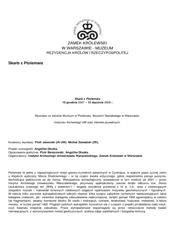 ZAMEK KRÓLEWSKI W WARSZAWIE - MUZEUM REZYDENCJA KRÓLÓW I RZECZYPOSPOLITEJ Skarb z Ptolemais Skarb z Ptolemais 15 grudnia 2007 – 15 stycznia 2008 r. Wystawa ze zbiorów Muzeum w Ptolemais, Muzeum Narodowego w Warszawie, Instytutu Archeologii UW oraz zbiorów prywatnych. Kuratorzy wystawy: Piotr Jaworski (IA UW), Michał Zawadzki (ZK), Projekt scenografii: Angelika Dłuska, Opracowanie graficzne: Piotr Berezowski, Angelika Dłuska, Organizatorzy: Instytut Archeologii Uniwersytetu Warszawskiego, Zamek Królewski w Warszawie Ptolemais to jedno z najważniejszych miast grecko-rzymskich położonych w Cyrenajce, w wąskim pasie żyznej ziemi u libijskich wybrzeży Morza Śródziemnego – w tej części świata antycznego, gdzie niepodzielnie panuje pustynia, dochodząca praktycznie aż do morza. Wykopaliska archeologiczne, prowadzone w tym mieście od 2001 r. przez Instytut Archeologii Uniwersytetu Warszawskiego, przyniosły spektakularny sukces dzięki odkryciu tzw. Domu Leukaktiosa (zwanego też „Willą z widokiem”) – bogatej rezydencji prywatnej z III w. n.e., wraz z interesującym zespołem mozaik i malowideł ściennych zdobionych bogatym repertuarem motywów geometrycznych i figuralnych. W trakcie kilku sezonów wykopaliskowych odkryto również kilka tysięcy zabytków ruchomych reprezentujących takie kategorie znalezisk, jak: ceramika (kategoria zdecydowanie najliczniejsza), lampki (ponad 1000 egzemplarzy w całości lub fragmentach), obiekty kamienne (blisko 30 rzeźb i inskrypcji), szklane, terakotowe, kościane, metalowe, a także monety, w liczbie ponad 1400. Program polskich wykopalisk rozszerzył się z czasem o projekt przebadania całej insuli, czyli kwartału miejskiej zabudowy. Prace wykopaliskowe wspomagane są przez nowoczesne metody badań nieinwazyjnych, z wykorzystaniem metod geofizycznych, analizę zdjęć satelitarnych i fotografię lotniczą. We wrześniu 2006 r., w domu sąsiadującym z Domem Leukaktiosa, odkryto skarb monet rzymskich datowanych na IIII w. n.e., zasypany ok. połowy III w. n.e. w wyniku potężnego trzęsienia ziemi. Skarb z Ptolemais, liczący blisko 600 monet (w tym 15 srebrnych) i ważący około 12,5 kg, uznany został za jedno z najciekawszych odkryć w dziejach badań nad antyczną Cyrenajką. W dotychczasowej, ponad stuletniej historii badań archeologicznych w Cyrenajce, odkryto zaledwie kilka niewielkich skarbów monetarnych, z których żaden nie pochodził z okresu wczesno- lub środkoworzymskiego. Opracowanie naukowe monet odkrytych w znalezisku pozwala na precyzyjne ustalenie nieznanej dotychczas daty trzęsienia ziemi, które zniszczyło nie tylko dom ze skarbem, ale wszystkie miasta Cyrenajki i stanowi – obok wielkiego trzęsienia ziemi z 365 r. i podboju arabskiego – jedną z podstawowych dat w dziejach całej prowincji. Skarb monet rzymskich odkryto na posadzce z ubitej ziemi, w jednym z pomieszczeń domu o charakterze przemysłowo-mieszkalnym. Umiejscowienie w sąsiednim lokum pieca do wytopu miedzi, urządzonego – na co warto zwrócić uwagę – z wykorzystaniem konstrukcji dawnej latryny, wskazuje działalność metalurgiczną (prowadzoną na niewielką skalę), jako podstawowe źródło dochodów właściciela zdeponowanych monet. Jednorodna struktura nominałowa odkrytych monet wskazuje, że rzemieślnik ten pobierał za świadczoną usługę jeden sesterc (najwyższy rzymski nominał brązowy) lub jego wielokrotność. W 2007 r. skarb z Ptolemais poddany został konserwacji. Wystawa Skarb z Ptolemais w Zamku Królewskim w Warszawie, stanowiła pierwszą publiczną prezentację odkrycia, będącego sukcesem nie tylko archeologów z Uniwersytetu Warszawskiego, ale całej polskiej archeologii śródziemnomorskiej. Dzięki przychylności libijskich służb starożytności, Instytut Archeologii UW uzyskał prawo do wykonania i przewiezienia do Polski gipsowych odlewów wszystkich monet wchodzących w skład skarbu. Oprócz zgody na wykonanie gipsowych kopii monet tworzących „skarb z Ptolemais”, władze libijskie zezwoliły też – co jest niezwykle rzadką praktyką w przypadku zabytków archeologicznych – na zaprezentowanie w Polsce kilku srebrnych i brązowych, oryginalnych monet wchodzących w skład znaleziska. Gipsowe kopie zabytków, które z rozmaitych względów pozostawały niedostępne dla szerszej publiczności, już w okresie Renesansu, szczególnie zaś w XVIII i XIX w., stanowiły rozpowszechniony – dzięki łatwości wykonania i wizualnej atrakcyjności – sposób docierania najcenniejszych rzeźb, a także przedmiotów drobnej plastyki, do najdalej nawet położonych zakątków Europy. Oprócz oczywistej roli dekoracyjnej, gipsowe kopie posłużyły jako też nieoceniona pomoc w badaniach naukowych i kształceniu młodych adeptów sztuk plastycznych oraz historyków sztuki. Taką funkcję pełniły gipsowe kopie najsłynniejszych rzeźb starożytności zakupione przez króla Stanisława Augusta Poniatowskiego dla Malarni i Skulptorni – dwóch pracowni funkcjonujących w Zamku Warszawskim, w których przed upadkiem Rzeczypospolitej kształcili się pod kierunkiem Marcella Bacciarellego młodzi artyści polscy. Wystawę gipsowych odlewów uzupełniło ponad 80 oryginalnych monet antycznych, pochodzących ze zbiorów Muzeum w Ptolemais, Muzeum Narodowego w Warszawie oraz zbiorów prywatnych. Oprócz kilku monet pochodzących ze skarbu, były wszystkim wyjątkowo rzadkie w zbiorach europejskich srebrne i brązowe monety prezentujące specyfikę antycznego mennictwa Cyrenajki – krainy, która jako pierwsza w Afryce – już w VII w. p.n.e. – zasiedlona została przez starożytnych Greków. Na wystawie będzie też można było obejrzeć kopię rzeźby Kybele siedzącej na tronie, którą odkryto w Ptolemais zaledwie 30 cm od skarbu monet rzymskich. Wystawie Skarb z Ptolemais towarzyszył katalog, w którym – oprócz omówienia prezentowanych zabytków – znalazły się teksty poświ