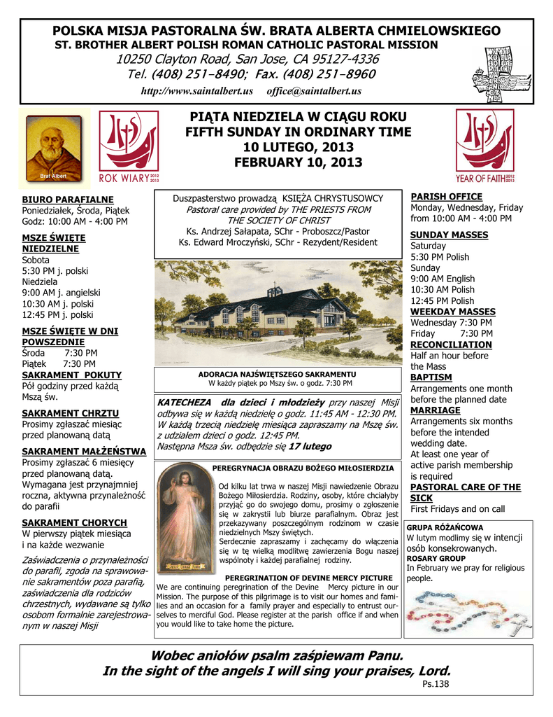 POLSKA MISJA PASTORALNA ŚW. BRATA ALBERTA CHMIELOWSKIEGO ST. BROTHER ALBERT POLISH ROMAN CATHOLIC PASTORAL MISSION 10250 Clayton Road, San Jose, CA 95127-4336 Tel. (408) 251251-8490; Fax. (408) 251251-8960 http://www.saintalbert.us [email protected] PIĄTA NIEDZIELA W CIĄGU ROKU FIFTH SUNDAY IN ORDINARY TIME 10 LUTEGO, 2013 FEBRUARY 10, 2013 BIURO PARAFIALNE Poniedziałek, Środa, Piątek Godz: 10:00 AM - 4:00 PM Duszpasterstwo prowadzą KSIĘśA CHRYSTUSOWCY Pastoral care provided by THE PRIESTS FROM THE SOCIETY OF CHRIST Ks. Andrzej Sałapata, SChr - Proboszcz/Pastor Ks. Edward Mroczyński, SChr - Rezydent/Resident MSZE ŚWIĘTE NIEDZIELNE Sobota 5:30 PM j. polski Niedziela 9:00 AM j. angielski 10:30 AM j. polski 12:45 PM j. polski MSZE ŚWIĘTE W DNI POWSZEDNIE Środa 7:30 PM Piątek 7:30 PM SAKRAMENT POKUTY Pół godziny przed kaŜdą Mszą św. SAKRAMENT CHRZTU Prosimy zgłaszać miesiąc przed planowaną datą SAKRAMENT MAŁśEŃSTWA Prosimy zgłaszać 6 miesięcy przed planowaną datą. Wymagana jest przynajmniej roczna, aktywna przynaleŜność do parafii SAKRAMENT CHORYCH W pierwszy piątek miesiąca i na kaŜde wezwanie Zaświadczenia o przynaleŜności do parafii, zgoda na sprawowanie sakramentów poza parafią, zaświadczenia dla rodziców chrzestnych, wydawane są tylko osobom formalnie zarejestrowanym w naszej Misji ADORACJA NAJŚWIĘTSZEGO SAKRAMENTU W kaŜdy piątek po Mszy św. o godz. 7:30 PM KATECHEZA dla dzieci i młodzieŜy przy naszej Misji odbywa się w kaŜdą niedzielę o godz. 11:45 AM - 12:30 PM. W kaŜdą trzecią niedzielę miesiąca zapraszamy na Mszę św. z udziałem dzieci o godz. 12:45 PM. Następna Msza św. odbędzie się 17 lutego PEREGRYNACJA OBRAZU BOśEGO MIŁOSIERDZIA Od kilku lat trwa w naszej Misji nawiedzenie Obrazu BoŜego Miłosierdzia. Rodziny, osoby, które chciałyby przyjąć go do swojego domu, prosimy o zgłoszenie się w zakrystii lub biurze parafialnym. Obraz jest przekazywany poszczególnym rodzinom w czasie niedzielnych Mszy świętych. Serdecznie zapraszamy i zachęcamy do włączenia się w tę wielką modlitwę zawierzenia Bogu naszej wspólnoty i kaŜdej parafialnej rodziny. PEREGRINATION OF DEVINE MERCY PICTURE PARISH OFFICE Monday, Wednesday, Friday from 10:00 AM - 4:00 PM SUNDAY MASSES Saturday 5:30 PM Polish Sunday 9:00 AM English 10:30 AM Polish 12:45 PM Polish WEEKDAY MASSES Wednesday 7:30 PM Friday 7:30 PM RECONCILIATION Half an hour before the Mass BAPTISM Arrangements one month before the planned date MARRIAGE Arrangements six months before the intended wedding date. At least one year of active parish membership is required PASTORAL CARE OF THE SICK First Fridays and on call GRUPA RÓśAŃCOWA W lutym modlimy się w intencji osób konsekrowanych. ROSARY GROUP In February we pray for religious people. We are continuing peregrination of the Devine Mercy picture in our Mission. The purpose of this pilgrimage is to visit our homes and families and an occasion for a family prayer and especially to entrust ourselves to merciful God. Please register at the parish office if and when you would like to take home the picture. Wobec aniołów psalm zaśpiewam Panu. In the sight of the angels I will sing your praises, Lord. Ps.138 SOBOTA/SATURDAY - 9 LUTEGO/FEBRUARY 5:30 PM ++ Irena i Kazimiera Teodorczyk - rodzina NIEDZIELA/SUNDAY - 10 LUTEGO/FEBRUARY 9:00 AM + Paul M. Borges - mother 10:30 AM + Jadwiga Kozłowicz w 4 r. śm. - córka z rodziną 12:45 PM ++ Lucjan Szałek, Irena OŜóg - Leszek z rodziną ŚRODA/WEDNESDAY - 13 LUTEGO/FEBRUARY Środa Popielcowa/Ash Wednesday 6:00PM In English 7:30PM + Aleksandra Zych - J.J. Drwęscy PIĄTEK/FRIDAY - 15 LUTEGO/FEBRUARY DROGA KRZYśOWA 7:30PM (wolna intencja) SOBOTA/SATURDAY – 16 LUTEGO/FEBRUARY 5:30 PM (wolna intencja) NIEDZIELA/SUNDAY - 17 LUTEGO/FEBRUARY 9:00 AM +Maria Albertina, Humberto, Francisco Fagundes 10:30 AM + Janina Harris - syn A. Harris 12:45 PM +Jan Stanisław Wesołowski w 2 r.śm - Ŝona z rodz. O BoŜe błog. dla Adriana Sowul z ok. 12 ur. - rodzina ŚRODA/WEDNESDAY - 20 LUTEGO/FEBRUARY 7:30PM (wolna intencja) PIĄTEK/FRIDAY - 22 LUTEGO/FEBRUARY 7:30PM O BoŜe błog. dla Nicole Wilczynski - mama SOBOTA/SATURDAY - 23 LUTEGO/FEBRUARY 5:30PM (wolna intencja) NIEDZIELA/SUNDAY - 24 LUTEGO/FEBRUARY 9:00 AM (open intention) 10:30 AM + Paweł Słowik - 3 rocz. śm.- J. Wierzbocki 12:45 PM O BoŜe błog dla Agaty, Ludwika, Gabrysia–Drwęscy SŁUśBA LITURGICZNA LEKTORÓW Sobota, 9 lutego 5:30PM Maria Teodorczyk Niedziela, 10 lutego 10:30 AM Alicja i Jacek Łukaszczyk 12:45 PM Alicja Sulczyńska Sobota , 16 lutego 5:30PM BoŜena Drobot Niedziela, 17 lutego 10:30AM Wanda Górecka, Ewa Lesiak 12:45PM Dzieci *** LECTORS 9:00 AM Mass Sunday, February 10 Melinda Alivio, Decio Oliveira Sunday, February 17 Sheryl Walters, Nicole Wilczynski KOLEKTA/COLLECTION: 02/03 Kol./Coll. $2,473 II Kol/Coll. $675 02/13 Kol./Coll. will be taken for Aid to Churches in Eastern and Central Europe. Na Kościół w Europie Środkowo-Wschodniej. Bóg zapłać za kaŜdą ofiarę. May God reward your generosity. KAWIARENKA Przy wejściu do kościoła wystawiony jest kalendarz Kawiarenek. Bardzo prosimy o wpisanie tam swojego zgłoszenia. Serdeczne podziękowania dla G. Fedorowicz, E. Mokrecka, C. Pariaszewski, C. Groba, A. Lukaszczyk za przygotowanie i prowadzenie kawiarenki 02/03 - dochód - $554 Za zakupione produkty na przygotowanie Kawiarenki moŜna (po przedstawieniu rachunków) otrzymać zwrot kosztów albo na podstawie specjalnego dokumentu odpisać je od podatku. Zostaw, co złowiłeś W tym samym miejscu, gdzie Szymon doznał poraŜki, przeŜył zwycięstwo, poniewaŜ był posłuszny słowu BoŜemu. Ale na tym nie koniec. Kiedy wyciągnęli juŜ sieci na brzeg, Jezus kazał im wszystko porzucić. Po co trudzić się kilka godzin z połowem, potem ciągnąć ze wszystkich sił sieć do brzegu, ryzykować zatonięcie łodzi, po czym wszystko porzucić? Mogli doprawdy poczuć rozczarowanie lu