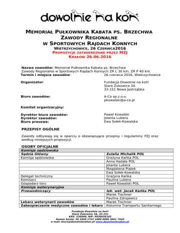 MEMORIAŁ PUŁKOWNIKA KABATA PS. BRZECHWA ZAWODY REGIONALNE W SPORTOWYCH RAJDACH KONNYCH WIETRZYCHOWICE, 26 CZERWCA2016 PROPOZYCJE ZATWIERDZONE PRZEZ MZJ KRAKÓW 26.06.2016 Nazwa zawodów: Memoriał Pułkownika Kabata ps. Brzechwa Zawody Regionalne w Sportowych Rajdach Konnych ZR L 30 km, ZR P 40 km. Termin i miejsce zawodów: 26 czerwca 2016, Wietrzychowice Organizator: Fundacja Dowolnie na koń! Stare Żukowice 3A 33-151 Nowa Jastrząbka Biuro zawodów: A-Co sp.z.o.o. [email protected] Komitet organizacyjny: Dyrektor biura zawodów: Dyrektor zawodów: Biuro prasowe: Paweł Kowalski Jolanta Lubera Ewa Sołek-Kowalska PRZEPISY OGÓLNE Zawody odbywają się w oparciu o obowiązujące przepisy i regulaminy PZJ oraz według niniejszych propozycji. OSOBY OFICJALNE Komisja sędziowska Sędzia Główny Komisja sędziowska Delegat techniczny Komisarz Gospodarz toru Komisja weterynaryjna Przewodniczący Eulalia Michalik POL Grażyna Kańka POL Anna Hadała POL Jolanta Lubera Magdalena Piątek Ewa Sołek-Kowalska Grażyna Kańka Paulina Lubera Paweł Kowalski POL lek. wet. Jacek Kańka POL Marek Tischner Paulina Zdrojewicz Lekarz weterynarii zawodów Marek Tischner Zabezpieczenie medyczne zawodów i lekarz Kolumna Transportu Sanitarnego Fundacja Dowolnie na koń! Stare Żukowice 3A, 33-151 KRS: 536846; NIP: 9930656165 Numer konta: 56 1050 1722 1000 0090 3051 7545 e-mail: [email protected] www.dowolonienakon.pl dla zawodników Serwis kowalski Tomasz Kowal PROGRAM ZAWODÓW Niedziela 26.06.2016 Godzina 7.30 – przegląd weterynaryjny dla obu klas Godzina 8.30 – odprawa techniczna dla obu klas Konkurs Dzień startu Przewidywana Godzina Startu Miejsce zawodów ZR P 40 km 26.06.2015 9.00 Wietrzychowice ZR L 30 km 26.06.2015 9.15 Wietrzychowice Organizator zastrzega sobie możliwość zmiany godzin odprawy technicznej, startów i zakończenia zawodów. Przewidywana godzina zakończenia zawodów i uroczyste ogłoszenie wyników około godziny 15.00. INFORMACJA O TRASIE Opis trasy: zawody rozgrywane będą na terenach Płaskowyżu Tarnowskiego. Start i meta: Wietrzychowice przy Urzędzie Gminy. Trasa przebiega terenem nizinnym, częściowo zalesionym Podłoże - drogi leśne, polne, piaszczyste, dłuższe odcinki dróg bitych, utwardzonych, szutrowych, odcinki asfaltu. Różnica wzniesień: 10 metrów. Pętle o długości 10 km i 20 km. ŚWIADCZENIA Wyżywienie i noclegi we własnym zakresie – rezerwacja noclegów Urząd Gminy Wietrzychowice 14 641 80 45 , proszę pytać o możliwość udostępnienia stajni dla koni w miejscu noclegu - być może będzie taka możliwość. Możliwość rezerwacji miejsca dla koni – ilość miejsc ograniczona !!! Decyduje kolejność zgłoszeń. Stajnie przygotowane od dnia 25 czerwca (sobota), od godz. 12.00. 1. Stajnia Wola Marcin Goraus , Wola Radłowska tel. 603 701 223 – ok 14 km od Wietrzychowic. 2. Stajnia u Trapera, Zdrochec tel. 691 815 116 – ok 10 km od Wietrzychowic. 3. Ranczo Palomino Stare Żukowice 3A tel. 602 491 343 -– 38 km od Wietrzychowic Opłata za boks: 100 zł Fundacja Dowolnie na koń! Stare Żukowice 3A, 33-151 KRS: 536846; NIP: 9930656165 Numer konta: 56 1050 1722 1000 0090 3051 7545 e-mail: [email protected] www.dowolonienakon.pl Istnieje możliwość wcześniejszego przyjazdu - po uprzednim uzgodnieniu z organizatorem pod tel. 602491343 Pasza, żłoby i wiadra do pojenia własne. W ramach opłaty za boks Organizator zapewnia pierwszą ściółkę. Niezwłocznie po przybyciu na miejsce zawodów zawodnicy zobowiązani są zarejestrować się w Biurze Zawodów, dopełniając wszystkich niezbędnych formalności (przekazanie dokumentów). Po dokonaniu ostatecznej rejestracji w Biurze Zawodów zawodnicy otrzymają numery startowe. Osoby, które nie dopełnią ww. formalności nie zostaną dopuszczone do przeglądu weterynaryjnego. Wcześniejszy przyjazd lub dłuższy pobyt należy uzgodnić z wyprzedzeniem i odnotować w zgłoszeniu (formularz zgłoszenia pole INNE INFORMACJE). ZGŁOSZENIA WAŻNE!!! Zgłoszenia przyjmowane są wyłącznie drogą elektroniczną. Formularz zgłoszeniowy wraz z instrukcją dostępny jest na stronie www.dowolnienakon.pl Zgłoszenia muszą zawierać komplet informacji dotyczących zawodnika, konia i niezbędnych kwalifikacji do danych konkursów. Zgłoszenia niekompletne lub zgłoszone inną drogą nie będą przyjmowane. Elektroniczne formularze zgłoszeń zostaną uruchomione 8.06.2016. Zgłoszenia przyjmowane wyłącznie do 23.06.2016 Opłaty: Opłata startowa: 100 zł plus 5zł na Fundusz Nagród 2016 (zgodnie z uchwałą 23/01/2014 Zarządu Małopolskiego Związku Jeździeckiego) Opłata za boks: 100 zł / dzień Za potwierdzone Organizator uznaje wyłącznie zgłoszenie wraz z wpłatą na konto Fundacji w wysokości 50 zł (50% całości opłaty startowej) w terminie do 21.06.2016. Fundacja Dowolnie na koń! Stare Żukowice 3A, 33-151 Fundacja Dowolnie na koń! Stare Żukowice 3A, 33-151 KRS: 536846; NIP: 9930656165 Numer konta: 56 1050 1722 1000 0090 3051 7545 e-mail: [email protected] www.dowolonienakon.pl • • • KRS: 536846; NIP: 9930656165 Numer konta: 56 1050 1722 1000 0090 3051 7545 Potwierdzenie wpłaty zawodnik musi posiadać podczas rejestracji na zawodach odbierając numer startowy. W przypadku osób, które nie uregulują wpłaty w wymaganym terminie (czyli do 21.06.2016) opłata za zawody (pobierana przez Biuro Zawodów) wynosi 200 zł. Telefony kontaktowe: 602 491 343, 601 822 454 WARUNKI TECHNICZNE Obowiązuje dokumentacja dla zawodników i koni zgodna z przepisami PZJ w dyscyplinie sportowe rajdy konne oraz przepisami ogólnymi PZJ. W przypadku braku dokumentacji jeźdźca lub konia para ta może zostać niedopuszczona do zawodów. W czasie rajdu i treningów przed zawodami zawodnika obowiązuje twarde nakrycie głowy. Szczepienia ochronne przeciwko grypie koni. Obowiązuje następujący schemat szczepień: a. szczepienie podstawowe: pierwsze szczepienie – w dniu rozpoczęcia szczep