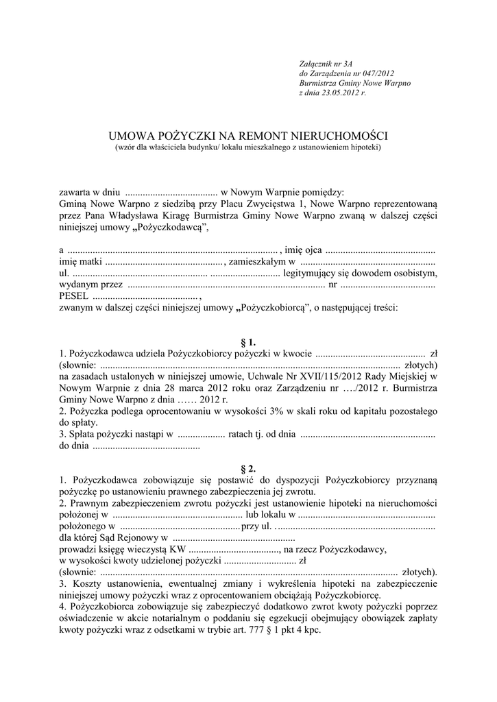 Załącznik nr 3A do Zarządzenia nr 047/2012 Burmistrza Gminy Nowe Warpno z dnia 23.05.2012 r. UMOWA POŻYCZKI NA REMONT NIERUCHOMOŚCI (wzór dla właściciela budynku/ lokalu mieszkalnego z ustanowieniem hipoteki) zawarta w dniu ..................................... w Nowym Warpnie pomiędzy: Gminą Nowe Warpno z siedzibą przy Placu Zwycięstwa 1, Nowe Warpno reprezentowaną przez Pana Władysława Kiragę Burmistrza Gminy Nowe Warpno zwaną w dalszej części niniejszej umowy „Pożyczkodawcą”, a .................................................................................... , imię ojca ............................................ imię matki ............................................... , zamieszkałym w ...................................................... ul. ...................................................... ............................ legitymujący się dowodem osobistym, wydanym przez ............................................................................... nr ...................................... PESEL .......................................... , zwanym w dalszej części niniejszej umowy „Pożyczkobiorcą”, o następującej treści: § 1. 1. Pożyczkodawca udziela Pożyczkobiorcy pożyczki w kwocie ............................................ zł (słownie: ........................................................................................................................ złotych) na zasadach ustalonych w niniejszej umowie, Uchwale Nr XVII/115/2012 Rady Miejskiej w Nowym Warpnie z dnia 28 marca 2012 roku oraz Zarządzeniu nr …./2012 r. Burmistrza Gminy Nowe Warpno z dnia …… 2012 r. 2. Pożyczka podlega oprocentowaniu w wysokości 3% w skali roku od kapitału pozostałego do spłaty. 3. Spłata pożyczki nastąpi w ................... ratach tj. od dnia ...................................................... do dnia ........................................... § 2. 1. Pożyczkodawca zobowiązuje się postawić do dyspozycji Pożyczkobiorcy przyznaną pożyczkę po ustanowieniu prawnego zabezpieczenia jej zwrotu. 2. Prawnym zabezpieczeniem zwrotu pożyczki jest ustanowienie hipoteki na nieruchomości położonej w .................................................... lub lokalu w ....................................................... położonego w ................................................ przy ul. . ............................................................... dla której Sąd Rejonowy w ................................................. prowadzi księgę wieczystą KW ...................................., na rzecz Pożyczkodawcy, w wysokości kwoty udzielonej pożyczki ............................. zł (słownie: ....................................................................................................................... złotych). 3. Koszty ustanowienia, ewentualnej zmiany i wykreślenia hipoteki na zabezpieczenie niniejszej umowy pożyczki wraz z oprocentowaniem obciążają Pożyczkobiorcę. 4. Pożyczkobiorca zobowiązuje się zabezpieczyć dodatkowo zwrot kwoty pożyczki poprzez oświadczenie w akcie notarialnym o poddaniu się egzekucji obejmujący obowiązek zapłaty kwoty pożyczki wraz z odsetkami w trybie art. 777 § 1 pkt 4 kpc. 5. Pożyczkobiorca zobowiązuje się nadto zabezpieczyć zwrot pożyczki poprzez: ...................................................................................................................................................... ...................................................................................................................................................... § 3. 1. Pożyczkodawca postawi do dyspozycji Pożyczkobiorcy kwotę pożyczki w terminie 14 dni od dnia przedstawienia przez Pożyczkobiorcę aktualnego odpisu z księgi wieczystej potwierdzającego ustanowienie hipoteki oraz po ustanowieniu zabezpieczenia o którym mowa w § 2. 2. Postawienie kwoty pożyczki do dyspozycji Pożyczkobiorcy nastąpi w sposób następujący: ...................................................................................................................................................... ...................................................................................................................................................... ...................................................................................................................................................... 3. Umowa o udzielenie pożyczki ulega rozwiązaniu jeżeli Pożyczkodawca nie przedłoży odpisu z księgi wieczystej o którym mowa w ust.1 w terminie do trzech miesięcy od daty podpisania umowy pożyczki. 4. Termin określony w ust. 3 może być przedłużony na uzasadniony wniosek pożyczkobiorcy. § 4. 1. Pożyczkobiorca zobowiązuje się dokonać spłaty pożyczki w okresach miesięcznych od dnia postawienia kwoty do dyspozycji Pożyczkobiorcy płatnych w terminie do dnia ............................ każdego miesiąca począwszy od miesiąca ..................................................... zgodnie z harmonogramem spłaty. 2. Za datę spłaty pożyczki przyjmuje się datę wpływu środków płatniczych na konto Pożyczkodawcy, w ...................................................................................................................................................... 3. Pożyczkobiorcy przysługuje prawo do wcześniejszej spłaty udzielonej pożyczki bez konieczności ponoszenia dodatkowych opłat z tego tytułu. § 5. Pożyczkodawca przedstawi na piśmie harmonogram spłaty pożyczki wraz z oprocentowaniem na dzień przekazania kwoty pożyczki. § 6. W przypadku opóźnienia w terminie spłaty pożyczki, określonym w sposób wskazany w § 4. ust. 1 Pożyczkodawca naliczał będzie od wymagalnych kwot odsetki ustawowe za czas opóźnienia. § 7. Pożyczkodawca może rozwiązać niniejszą umowę bez wypowiedzenia w przypadku, gdy pożyczkobiorca nie dokonał spłaty trzec