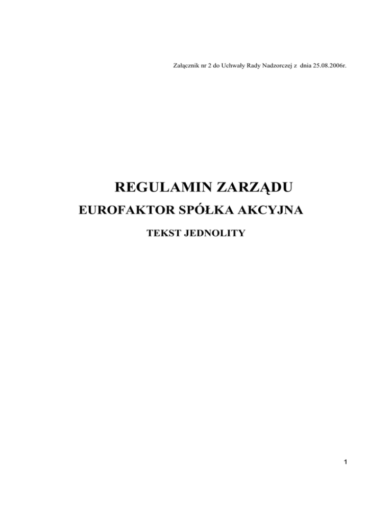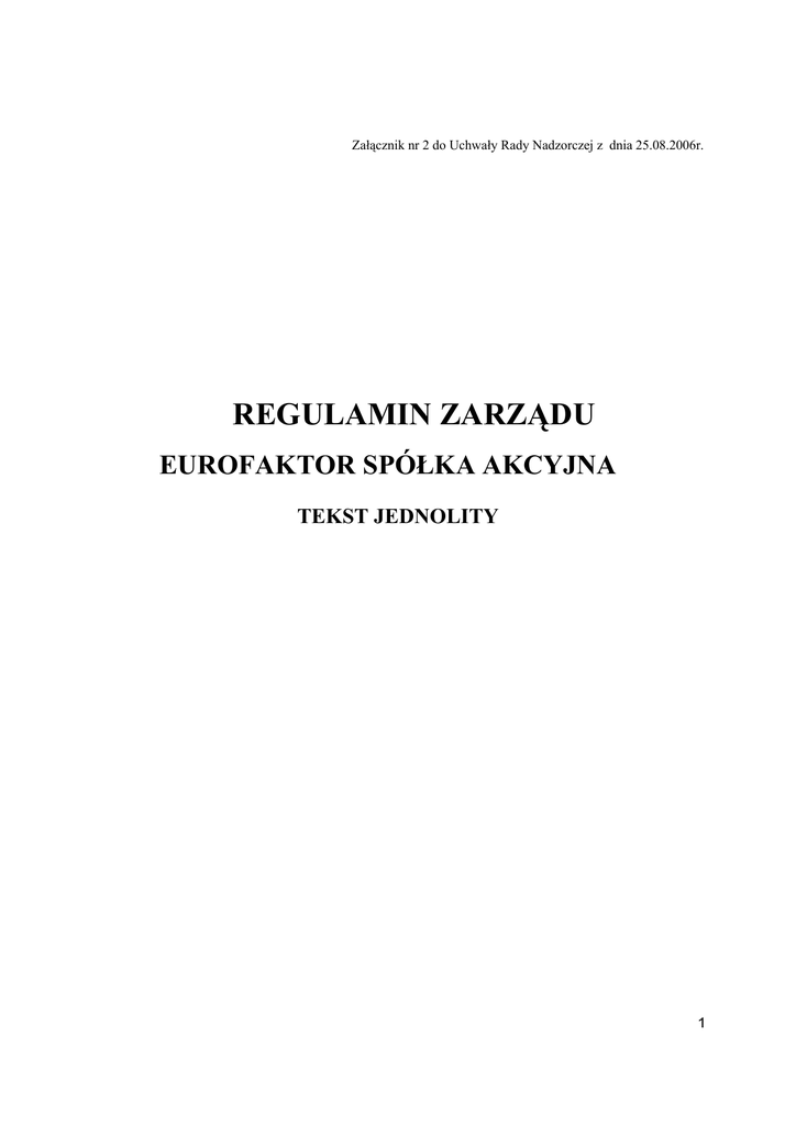 Załącznik nr 2 do Uchwały Rady Nadzorczej z dnia 25.08.2006r. REGULAMIN ZARZĄDU EUROFAKTOR SPÓŁKA AKCYJNA TEKST JEDNOLITY 1 EUROF AKTOR SA POSTANOWIENIA OGÓLNE §1 1. Zarząd EUROFAKTOR S.A. (zwany dalej ,,zarządem") kieruje bieżącą działalnością Spółki, zarządza jej majątkiem i reprezentuje ją na zewnątrz wobec władz i osób trzecich. 2. Zarząd dba o przejrzystość i efektywność systemu zarządzania Spółką oraz prowadzenie jej spraw zgodnie z przepisami prawa i dobrą praktyką. 3. Zarząd działa na podstawie kodeksu spółek handlowych, Statutu Spółki oraz niniejszego Regulaminu. SKŁAD ZARZĄDU §2 1. Zarząd jest powoływany i odwoływany przez Radę Nadzorczą na okres trzech lat, przy czym kadencja Zarządu powołanego w 2004 roku kończy się z dniem przyjęcia sprawozdań finansowych za 2008 rok. Następne kadencje obejmują trzy kolejne lata. 2. Zarząd liczy od jednego do pięciu członków, powoływanych na wspólną kadencję. O liczbie członków Zarządu decyduje Rada Nadzorcza. REPREZENTACJA SPÓŁKI §3 1. Do składania oświadczeń w imieniu spółki wymagane jest współdziałanie dwóch Członków Zarządu albo jednego Członka Zarządu łącznie z prokurentem lub pełnomocnikiem. w przypadku powołania Zarządu jednoosobowego - Prezes Zarządu samodzielnie. 2. Do składania oświadczeń w imieniu Spółki uprawnieni są także pełnomocnicy w granicach udzielonych pełnomocnictw. 2 EUROF AKTOR SA 3. Do udzielania informacji o działalności Spółki do środków masowego przekazu upoważnieni są Członkowie Zarządu lub upoważniona przez Zarząd osoba. KOMPETENCJE ZARZĄDU §4 Zarząd we współpracy z Radą Nadzorczą określa, kierując się interesem Spółki, strategię i główne cele działalności Spółki, a następnie czuwa nad ich realizacją i wdrożeniem. §5 Oprócz innych spraw wskazanych w przepisach prawa do obowiązków Zarządu należy: 1) reprezentowanie Spółki na zewnątrz, w szczególności w sądzie oraz przed urzędami i organami państwowymi, 2) zgłaszanie zmian do rejestru przedsiębiorców Krajowego Rejestru Handlowego, 3) zwoływanie Zwyczajnego Walnego Zgromadzenia w terminie określonym przepisami prawa, 4) zapewnienia prawidłowego prowadzenia dokumentacji Spółki, w tym w szczególności księgi akcyjnej, księgi uchwał Zarządu, księgi protokołów Walnego Zgromadzenia, 5) sporządzanie i udostępnianie Walnemu Zgromadzeniu oraz Radzie Nadzorczej sprawozdania :finansowego oraz pisemnego sprawozdania z działalności Spółki, 6) stosowanie i przestrzeganie ładu korporacyjnego. POSIEDZENIA ZARZĄDU §6 1. Posiedzenia Zarządu odbywają się nie rzadziej niż raz w miesiącu. 2, Posiedzenia Zarządu mogą być również zwoływane dla rozpatrzenia spraw nie cierpiących zwłoki. §7 1. . U chwały Zarządu zapadają na posiedzeniach Zarządu. 3 EUROF AKTOR SA 2. Uchwały Zarządu zapadają bezwzględną większością głosów. W przypadku równości głosów decyduje głos Prezesa Zarządu. 3. Jeżeli Zarząd jest wieloosobowy, wszyscy jego Członkowie Zarządu są obowiązani i uprawnieni do wspólnego prowadzenia spraw Spółki. 4. Uchwały Zarządu mogą być powzięte, jeżeli wszyscy Członkowie Zarządu zostali prawidłowo zawiadomieni o posiedzeniu Zarządu. §8 1. Prezes Zarządu zwołuje posiedzenie Zarządu z własnej inicjatywy, na wniosek Członka Zarządu albo na wniosek Rady Nadzorczej. 2. Każdy z członków powinien zostać zawiadomiony o terminie posiedzenia oraz o porządku obrad co najmniej na 1 dzień przed datą posiedzenia, w tym terminie powinien otrzymać także kopie projektów uchwał. 3. W przypadku złożenia wniosku, o którym mowa w ust. 1, posiedzenie powinno być zwołane najpóźniej w terminie 7 dnia od daty złożenia wniosku, zaś w sprawach pilnych o istotnym znaczeniu dla interesów Spółki w terminie 3 dni od złożenia wniosku. §9 1. Posiedzeniom Zarządu przewodniczy Prezes Zarządu. 2. Członkowie Zarządu zobowiązani są uczestniczyć w posiedzeniach. 3. Zarząd jeżeli uzna to za uzasadnione, może zaprosić na posiedzenie inne osoby, z tym, że nie mogą one brać udziału w głosowaniu. § 10 W sprawach pilnych i nie cierpiących zwłoki, można podjąć uchwałę w trybie pisemnym lub przy wykorzystaniu środków bezpośredniego porozumiewania się na odległość. W tym przypadku uchwała powinna być podpisana przez każdego Członka Zarządu. §11 1. Decyzje w sprawach Spółki podejmowane są przez Zarząd w formie uchwał. Uchwały Zarządu wymagają w szczególności: . 4 EUROF AKTOR SA a) czynności związane bezpośrednio z przedmiotem działalności Spółki, powodujące zaciągnięcie zobowiązania powyżej 500 000 zł, w tym decyzje dotyczące udzielenia bądź zmiany limitu faktoringowego, b) czynności nie związane bezpośrednio z przedmiotem działalności Spółki a dotyczące bieżącego funkcjonowania Spółki, w tym spraw organizacyjno-administracyjnych, powodujących zaciągnięcie zobowiązania powyżej 50 000 zł, c) sprawy związane ze zbyciem majątku trwałego Spółki, Jego wydzierżawieniem lub ustanowieniem innego prawa użytkowania, d) darowizny z majątku Spółki, e) udzielanie prokury i pełnomocnictw, f) decyzje w zakresie strategii inwestycyjnej Spółki, h) decyzje w zakresie strategii działalności Spółki, i) wieloletnie i roczne plany działalności Spółki i plany finansowe Spółki, j) roczny budżet Spółki. 2. Zarząd może podejmować uchwały również w innych sprawach uznanych przez siebie za wymagające kolegialnego rozpatrzenia. 3. Uchwał Zarządu nie wymaga w szczególności i z uwzględnieniem ust.2 przedłużenie okresu finansowania we wszystkich transakcjach związanych z przedmiotem działalności zawartych z klientami firmy o maksymalnie 30 dni. § 12 1. Przy podejmowaniu decyzji w sprawach Spółki, Zarząd jest zobowiązany działać w granicach uzasadnionego ryzyka gospodarczego, tj. po r