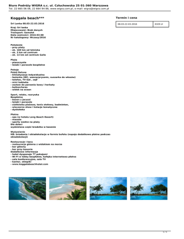 Biuro Podróży WIGRA s.c. ul. Człuchowska 25 01-360 Warszawa Tel. 22 665 06 06, 22 664 94 86, www.wigra.com.pl, e-mail: [email protected] Koggala beach*** Termin i cena Sri Lanka 08.03-22.03.2016 08.03-22.03.2016 6329 zł Kraj: Sri lanka Miejscowość: Brak danych Transport: Samolot Data ważności: 2016-03-08 Nr katalogowy: Wczasy/2016 Położenie - przy plaży - ok. 160 km od lotniska - ok. 3 km od centrum - ok. 13 km od centrum Galle Plaża - piaszczysta - leżaki i parasole bezpłatne Pokoje Pokój Deluxe - klimatyzacja indywidualna - łazienka (WC, wanna/prysznic, suszarka do włosów) - telefon, TV-Sat , sejf - mini lodówka - zestaw do parzenia kawy i herbaty - balkon/taras - widok na ocean Sport, relaks, rozrywka Bezpłatne - basen z jacuzzi - leżaki i parasole - siatkówka plażowa, tenis stołowy, badminton, - wieczorne show i kolacje tematyczne - dyskoteka Płatne - spa (w hotelu Long Beach Resort) - masaże - sporty wodne na plaży Dla dzieci wydzielona część brodzika w basenie Wyżywienie HB: śniadania i obiadokolacje w formie bufetu (napoje dodatkowo płatne podczas obiadokolacji) Restauracje i bary - restauracja główna z widokiem na morze - bar główny - bar przy basenie Dodatkowe informacje - hotel dysponuje 77 pokojami - Wi Fi w lobby bezpłatne, kafejka internetowa płatna - sala konferencyjna, sala TV - kantor, sklepiki - www.koggalabeachhotel.com 1/1 Powered by TCPDF (www.tcpdf.org)