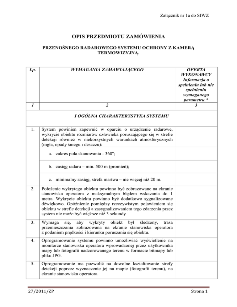Załącznik nr 1a do SIWZ OPIS PRZEDMIOTU ZAMÓWIENIA PRZENOŚNEGO RADAROWEGO SYSTEMU OCHRONY Z KAMERĄ TERMOWIZYJNĄ. Lp. WYMAGANIA ZAMAWIAJĄCEGO 1 2 OFERTA WYKONAWCY Informacja o spełnieniu lub nie spełnieniu wymaganego parametru.* 3 I OGÓLNA CHARAKTERYSTYKA SYSTEMU 1. System powinien zapewnić w oparciu o urządzenie radarowe, wykrycie obiektu rozmiarów człowieka poruszającego się w strefie detekcji również w niekorzystnych warunkach atmosferycznych (mgła, opady śniegu i deszczu): a. zakres pola skanowania - 360º; b. zasięg radaru – min. 500 m (promień); c. minimalny zasięg, strefa martwa – nie więcej niż 20 m. 2. Położenie wykrytego obiektu powinno być zobrazowane na ekranie stanowiska operatora z maksymalnym błędem wskazania do 1 metra. Wykrycie obiektu powinno być dodatkowo sygnalizowane dźwiękowo. Opóźnienie pomiędzy rzeczywistym pojawieniem się obiektu w strefie detekcji a zasygnalizowaniem tego zdarzenia przez system nie może być większe niż 3 sekundy. 3. Wymaga się, aby wykryty obiekt był śledzony, trasa przemieszczania zobrazowana na ekranie stanowiska operatora z podaniem prędkości i kierunku poruszania się obiektu. 4. Oprogramowanie systemu powinno umożliwiać wyświetlenie na monitorze stanowiska operatora wprowadzonej przez użytkownika mapy lub fotografii nadzorowanego terenu w formacie bitmapy lub pliku JPG. 5. Oprogramowanie ma pozwolić na dowolne kształtowanie strefy detekcji poprzez wyznaczenie jej na mapie (fotografii terenu), na ekranie stanowiska operatora. 27/2011/ZP Strona 1 Załącznik nr 1a do SIWZ 6. Wymagana jest weryfikacja sygnalizowanych naruszeń w strefie detekcji za pomocą kamer: termowizyjnej oraz optycznej, nakierowywanych automatycznie przez system na wykryty w strefie detekcji obiekt. Oprogramowanie kontrolujące kamery powinno umożliwić śledzenie obiektu oraz rejestrację wideo na rejestratorze wchodzącym w skład stanowiska operatora, z dyskiem twardym lub dysku komputera. Konstrukcja rejestratora musi umożliwiać demontaż dysku, ponadto: a. wymagana możliwość zapisu optymalizowana do wymagań monitoringu, kompresja na bazie H.264. b. wymagane oprogramowanie rejestratora zapewniające możliwość eksportu strumieni wideo na nośniki poprzez USB. c. wymagana pojemność dysku twardego zapewniająca archiwizację materiału wideo w okresie nie krótszym niż 14 dni dla jakości zapisu 4CIF/25 klatek/sek. 7. 8. 9. Wymaga się, aby komunikacja pomiędzy stanowiskiem operatora a modułem radaru i kamerami była zrealizowana za pomocą przewodów miedzianych lub światłowodów, musi być zapewniona możliwość wyniesienia stanowiska operatora na odległość nie mniejszą niż 200 metrów od modułu radarowego. Wykonanie modułu radarowego oraz kamer powinno zapewnić ich bezawaryjne i bezpieczne dla operatora działanie w różnych warunkach atmosferycznych, w tym intensywnego opadu deszczu i śniegu. - zakres temperatury pracy urządzenia: min. od - 20ºC do + 60ºC Oprogramowanie kontrolujące system oraz budowa i zastosowane rozwiązania techniczne powinny pozwolić na rozbudowę systemu o kolejne punkty radarowe. II KONSTRUKCJA SYSTEMU 1. System powinien składać się z: X a. głowicy radarowej; b. punktu kamerowego (dopuszcza się wspólne mocowanie z głowicą radarową); c. modułu zasilającego; 27/2011/ZP Strona 2 Załącznik nr 1a do SIWZ stanowiska operatora, w skład, którego wchodzą: d. i. monitor wyświetlający dane z radaru; ii. monitor wyświetlający obraz z kamer; iii. rejestrator; iv. manipulator sterujący głowicą punktu kamerowego; v. jednostka centralna z oprogramowaniem zarządzająca systemem. 2. Głowica radarowa i punkt kamerowy powinny być wyposażone w własny mobilny system podpór montażowych umożliwiający stabilną instalacje urządzeń w różnych typach podłoża, a także mieć możliwość zamocowania na wspólnej lub oddzielnej, przenośnej konstrukcji metalowej lub wysięgniku. 3. Obudowy głowicy radarowej, modułu zasilającego i punktu kamerowego powinny być wykonane w klasie ochrony minimum IP-67. 4. Wymaga się, aby w skład systemu wchodziło opakowanie transportowe pozwalające na bezpieczny transport samochodowy i lotniczy urządzeń oraz umożliwiło jego wygodne przenoszenie. Wymaga się, aby liczba zasobników zawierająca spakowany kompletny system nie przekroczyła 3 szt. III PUNKT KAMEROWY 1. 2. Wymagane jest, aby punkt kamerowy wyposażony był w głowicę obrotową zapewniającą prędkość obrotu (min. 180º/sek) umożliwiającą śledzenie szybko przemieszczających się obiektów. Kamera toru optycznego powinna umożliwić, co najmniej 25 krotny zoom optyczny. a. rozdzielczość przetwornika minimum CCD -752 x 582 piksele; 27/2011/ZP Strona 3 Załącznik nr 1a do SIWZ b. czułość min. – 1 lx (kolor), - 0,015 lx (mono); c. wymagany mechaniczny filtr IR; 3. Wymagane jest, aby moduł termowizyjny kamery posiadał rozdzielczość optyczną min. 320x240 pikseli i był zabezpieczony przed uszkodzeniem spowodowanym skierowaniem obiektywu na powierzchnię o temperaturze przekraczającej zakres pomiarowy przetwornika (np. słońce). 4. Wymagane jest zastosowanie w kamerze toru termowizyjnego niechłodzonego przetwornika (niechłodzony mikrobolometr). 5. Wymagane jest, aby punkt kamerowy posiadał możliwość niezależnego od automatycznego pozycjonowania, sterowania ręcznego za pomocą manipulatora ze stanowiska operatora. 6. Wymaga się, aby obraz z kamer wyświetlany był na dodatkowym monitorze na stanowisku operatora, o przekątnej min. 19”. IV ZASILANIE 1. Wymagane jest, aby główne zasilanie systemu było realizowane z jednofazowej sieci 230 V. Dotyczy to samego radaru z punktem kamerowym jak również stanowiska operatora. 2. Wymagane jest dostarczenie systemu z układem zasilania awaryjnego zapewniającym działanie systemu przez minimum 30 minut w przypadku wystąpienia przerwy w zasilaniu sieciowym. 3. Gwarancja na p