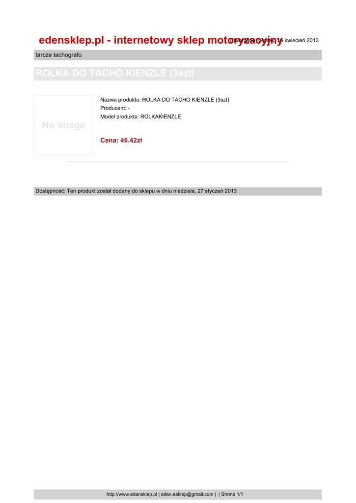 Utworzono: wtorek, 16 kwiecień 2013 edensklep.pl - internetowy sklep motoryzacyjny tarcze tachografu ROLKA DO TACHO KIENZLE (3szt) Nazwa produktu: ROLKA DO TACHO KIENZLE (3szt) Producent: Model produktu: ROLKAKIENZLE No image Cena: 46.42zł Dostępność: Ten produkt został dodany do sklepu w dniu niedziela, 27 styczeń 2013 http://www.edensklep.pl | [email protected] | | Strona 1/1