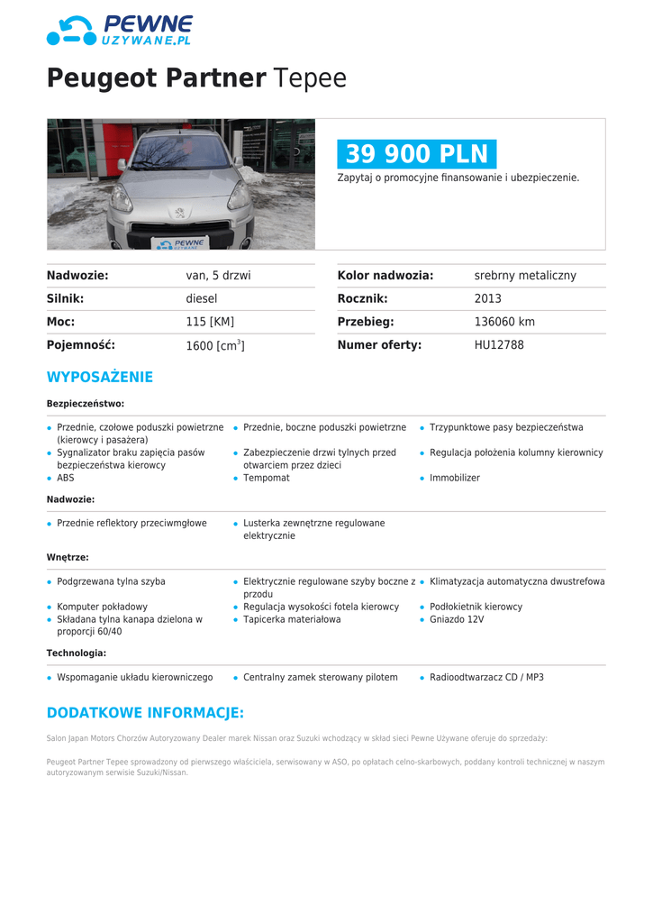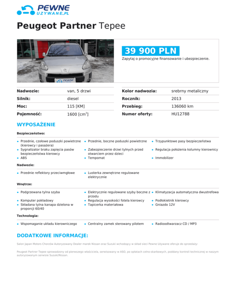 Peugeot Partner Tepee 39 900 PLN Zapytaj o promocyjne finansowanie i ubezpieczenie. Nadwozie: van, 5 drzwi Kolor nadwozia: srebrny metaliczny Silnik: diesel Rocznik: 2013 Moc: 115 [KM] Przebieg: 136060 km Pojemność: 1600 [cm ] Numer oferty: HU12788 3 WYPOSAŻENIE Bezpieczeństwo: Przednie, czołowe poduszki powietrzne (kierowcy i pasażera) Sygnalizator braku zapięcia pasów bezpieczeństwa kierowcy ABS Przednie, boczne poduszki powietrzne Trzypunktowe pasy bezpieczeństwa Zabezpieczenie drzwi tylnych przed otwarciem przez dzieci Tempomat Regulacja położenia kolumny kierownicy Immobilizer Nadwozie: Przednie reflektory przeciwmgłowe Lusterka zewnętrzne regulowane elektrycznie Wnętrze: Podgrzewana tylna szyba Komputer pokładowy Składana tylna kanapa dzielona w proporcji 60/40 Elektrycznie regulowane szyby boczne z przodu Regulacja wysokości fotela kierowcy Tapicerka materiałowa Klimatyzacja automatyczna dwustrefowa Centralny zamek sterowany pilotem Radioodtwarzacz CD / MP3 Podłokietnik kierowcy Gniazdo 12V Technologia: Wspomaganie układu kierowniczego DODATKOWE INFORMACJE: Salon Japan Motors Chorzów Autoryzowany Dealer marek Nissan oraz Suzuki wchodzący w skład sieci Pewne Używane oferuje do sprzedaży: Peugeot Partner Tepee sprowadzony od pierwszego właściciela, serwisowany w ASO, po opłatach celno-skarbowych, poddany kontroli technicznej w naszym autoryzowanym serwisie Suzuki/Nissan. Peugeot Partner Tepee Pewne Używane gwarantuje: 1.Sprawdzony Stan Techniczny Oraz Pochodzenie Samochodów. 2.Atrakcyjną Ofertę Finansową Oraz Ubezpieczeń. 3.Odkup Twojego Samochodu. 4.Obejrzenie Samochodu W Zadaszonym Dobrze Oświetlonym Pomieszczeniu. 5.JAKOŚĆ OBSŁUGI POTWIERDZONĄ NAGRODĄ RYNKU DEALERSKIEGO: !!!NAJLEPSZY DEALER AUT UŻYWANYCH ROKU!!! Niniejsze ogłoszenie jest wyłącznie informacją handlową i nie stanowi oferty w myśl art. 66, §1. Kodeksu cywilnego. Sprzedający nie odpowiada za ewentualne błędu lub nieaktualność ogłoszenia. Pewne Używane Chorzów ul. Zielony Zaułek 2, tel.:32 609 04 27 www.blog.pgd.pl Nota prawna Dane zawarte w niniejszej propozycji handlowej mają wyłącznie charakter informacyjny. Podane informacje nie stanowią oferty ani zapewnienia, w szczególności w rozumieniu art. 66 § 1 oraz art. 5561 Kodeksu cywilnego. Wiążące ustalenie ceny, wyposażenia oraz specyfikacji samochodu następuje w pisemnej umowie sprzedaży/zamówienia samochodu. Ze względu na ograniczenia techniczne (np. odwzorowanie kolorów przez monitor lub sposób wydruku), kolory przedstawione w niniejszej propozycji handlowej mogą się różnić od rzeczywistych kolorów nadwozia i tapicerki. Niniejsza propozycja handlowa oraz wszelkie załączniki z nią związane są poufne i nie mogą być przekazywane osobom trzecim. Prezentowane zdjęcia mogą zawierać wyposażenie opcjonalne (akcesoryjne), dodatkowo płatne. Warunki oferty maja charakter orientacyjny i mogą zostać zmienione w momencie uaktualnienia cen lub warunków promocji.