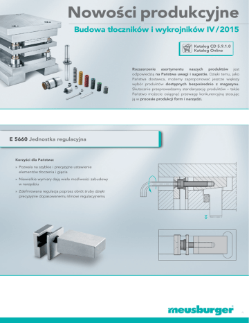 Nowości produkcyjne Budowa tłoczników i wykrojników IV / 2015 Katalog CD 5.9.1.0 Katalog Online Rozszerzenie asortymentu naszych produktów jest odpowiedzią na Państwa uwagi i sugestie. Dzięki temu, jako Państwa dostawca, możemy zaproponować jeszcze większy wybór produktów dostępnych bezpośrednio z magazynu. Skutecznie przeprowadzamy standaryzację produktów – także Państwo możecie osiągnąć przewagę konkurencyjną stosując ją w procesie produkcji form i narzędzi. E 5660 Jednostka regulacyjna Korzyści dla Państwa: » Pozwala na szybkie i precyzyjne ustawienie elementów tłoczenia i gięcia » Niewielkie wymiary dają wiele możliwości zabudowy w narzędziu » Zdefiniowana regulacja poprzez obrót śruby dzięki precyzyjnie dopasowanemu klinowi regulacyjnemu >> PL Czujnik fotoelektryczny Różne czujniki fotoelektryczne dla bezpieczeństwa i monitorowania przebiegu produkcji E 6532 E 6536 Czujnik fotoelektryczny do monitorowania posuwu oraz pozycji taśmy Korzyści dla Państwa: » Doskonałe monitorowanie posuwu oraz pozycji taśmy » Powierzchnia odporna na zarysowania i zanieczyszczenia » Chroniony jest wytrzymałą metalową obudową » Dostępne w dwóch rodzajach, ze światłem czerwonym i podczerwonym E 6530 Czujnik fotoelektryczny do kontroli nałożenia się lub przechylenia taśmy Korzyści dla Państwa: » Kontroluje proces odrzucania odpadów podczas tłoczenia lub wykrawania E 6592 E 6542 » Dzięki filtrom optycznym niewrażliwy na światło zewnętrzne » Proste ustawienie wysokości dzięki jednostce regulacyjnej » Możliwość wyboru między funkcją przełączania na jasno / na ciemno Systemy prowadzenia do narzędzi o dużych wymiarach Nowości w asortymencie: » Optymalny system prowadzenia do dużych narzędzi wielostopniowych lub wielostanowiskowych » Spełnia standardy w branży motoryzacyjnej: – E 5040 Słup prowadzący według DIN 9833 / ISO 9182-3 – E 5130 Tuleja prowadząca ślizgowa według DIN 9834 / ISO 9448 » Dostępne w średnicy od 40 do 100 mm + E 5543 Stempel tnący Korzyści dla Państwa: » Wykonane z wysokiej jakości węglika spiekanego, który zapewnia maksymalną żywotność narzędzia » Dokładność cięcia dzięki precyzyjnie szlifowanym ostrzom stempla » Przylutowana stalowa głowa stempla, umożliwiająca dalszą obróbkę E 5500 Stempel tnący E 5700 oraz E 5704 Tuleja wiercona Rozszerzenie asortymentu produktów: » Dodatkowe średnice w E 5500 stempel tnący z łbem stożkowym » Dodatkowe długości i średnice w E 5700 tuleja wiercona z kołnierzem » Dodatkowe długości i średnice w E 5704 tuleja wiercona bez kołnierza E 15582 Pręt elastomerowy Korzyści dla Państwa: » Doskonałe do przycięcia wymaganej długości oraz zastosowania w funkcji podkładek amortyzacyjnych oraz innych części konstrukcyjnych » Wytworzone ze sprężystej i wytrzymałej gumy poliuretanowej kauczukowej (PUR) o wysokiej wytrzymałości » Wydłużona żywotność dzięki wysokiej odporności na ścieranie oraz pękanie + Zamówcie Państwo w katalogu online www.meusburger.com E 1225 Śruba z łbem walcowym soczewkowym z kołnierzem Korzyści dla Państwa: » Proste zabezpieczenie osiowe tulei prowadzących lub tnących bez kołnierza » Klejenie lub wprasowanie tulei nie jest konieczne » Znormalizowane według standardów ISO w jakości 10.9 E 1296 Tulejka zabezpieczająca kołek cylindryczny Korzyści dla Państwa: » Optymalna do zabezpieczenia kołków walcowych E 1302 oraz E 1303 Meusburgera » Bardzo uproszczony montaż i demontaż kołka i tulejki » Pasująca do V 28440 zestawu do demontażu kołków E 5300 Element dystansowy Rozszerzenie asortymentu produktów: » Rozszerzenie asortymentu produktów o nowe długości i średnice dostosowane do narzędzi o dużych wymiarach » Możliwe mocowanie z obu stron » Możliwość przycięcia na długości w celu dopasowania wysokości montażu E 6036 Listwa centrująca oraz E 6038 listwa zaciskowa Korzyści dla Państwa: » Prosty montaż modułów dzięki praktycznym i korzystnym cenowo listwom » Idealny do mocowania lub przytrzymania modułów narzędziowych » Wymiary funkcyjne małych listw dopasowane są każdorazowo do grubości płyt E 6319 Sprężyna gazowa – mini Korzyści dla Państwa: » Umożliwia zastosowanie w bardzo ograniczonej przestrzeni zabudowy » W zależności od siły początkowej od 13 do 70 daN – oznaczone różnymi kolorami » Dostępne w średnicach 12 oraz 15 mm N – Płaskowniki z materiału 1.3343 Nowości w asortymencie: » N – Płaskowniki z materiału 1.3343 (HSS) » NR – Pręty z materiału 1.3343 (HSS) » Dla odpornych na zużycie elementów tnących o doskonałych właściwościach tnących i najwyższej trwałości + Zamówcie Państwo w katalogu online www.meusburger.com Oprawy tłoczników i wykrojników w dodatkowych wielkościach Nowości w asortymencie: » SV – Oprawy standardowe tłoczników i wykrojników > 1 metr SV – Oprawy standardowe tłoczników i wykrojników dostępne w wymiarach: – Średnica otworów prowadzenia 63 mm – Szerokość do 696 mm – Długość do 1396 mm » SH – Oprawy dwukolumnowe teraz dostępne od 126 x 156 mm » Dodatkowe grubości płyt w SP – oprawach precyzyjnych tłoczników i wykrojników » Krótkie terminy dostaw wszystkich opraw Nowość: Katalog elementów do zabudowy tłoczników i wykrojników » Na 361 stronach katalogu umieszczono » Praktyczny spis artykułów do szybkiego i łatwego wyboru wybranych elementów » Praktyczny opis różnych rodzajów prowadzenia w zależności od zastosowania » Nowość: Elementy aktywne taśmy jako grupa artykułów związanych z prowadzeniem, pozycjonowaniem i obróbką taśmy Meusburger Georg GmbH & Co KG | Kesselstr. 42 | 6960 Wolfurt | Austria T 00 43 (0) 55 74 / 67 06-0 | F -11 | [email protected] | www.meusburger.com DOSTĘPNY W OD TARGÓ Blechexp 2015 o